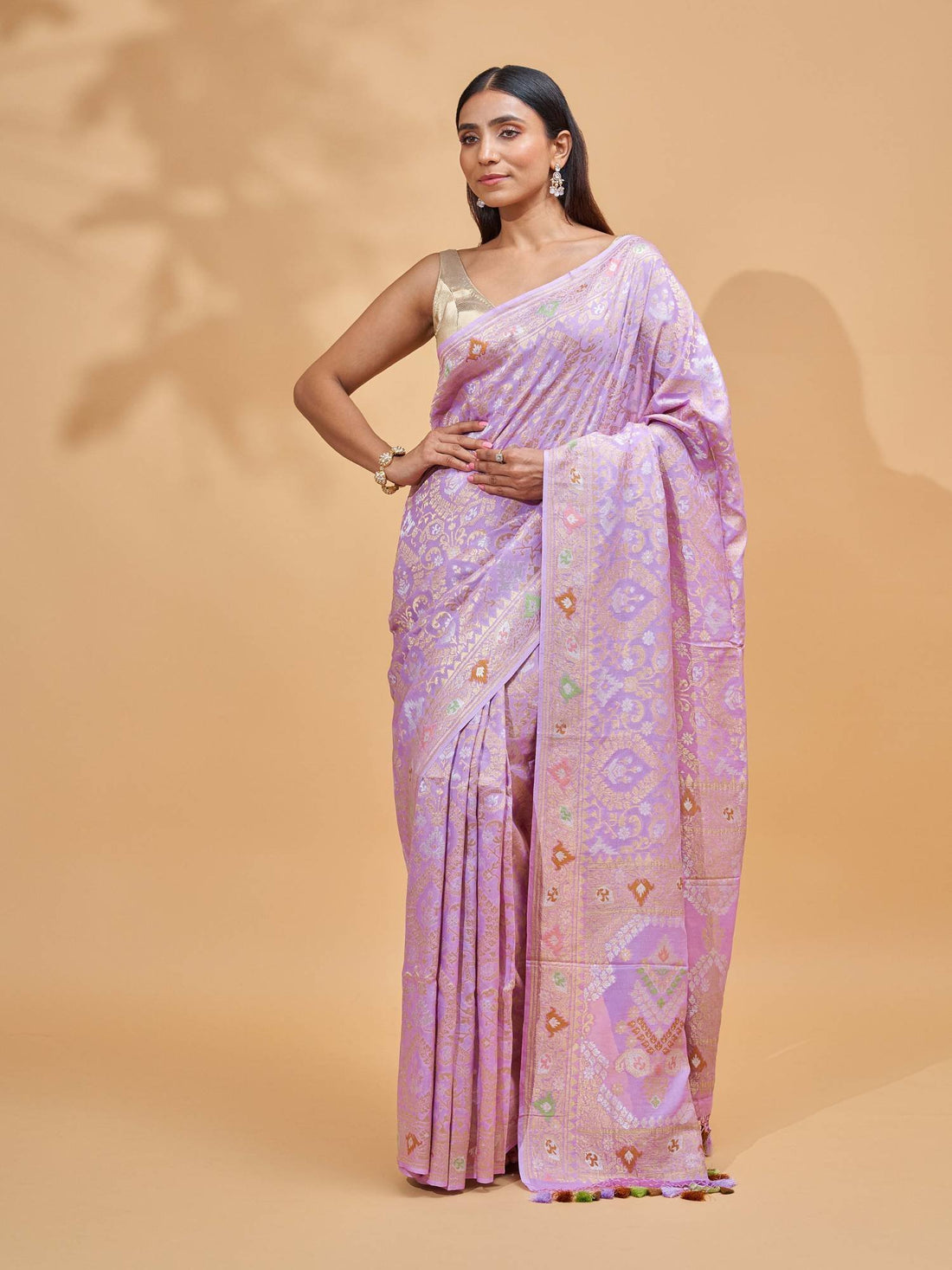 Elevate your ethnic wardrobe with the timeless beauty of the Swara (Lavender Georgette Banarasi Saree)....
