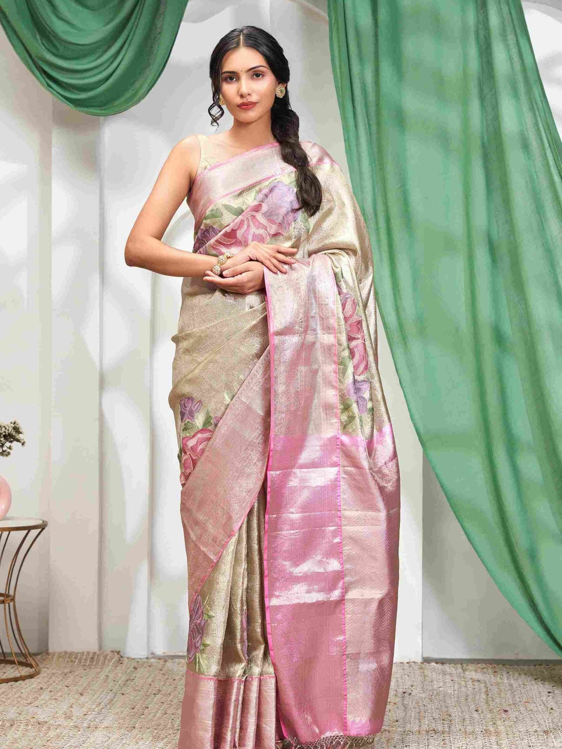 Wrap yourself in the brilliance of timeless tradition with the Svarnima (Kadwa Bootie Silk Tissue...