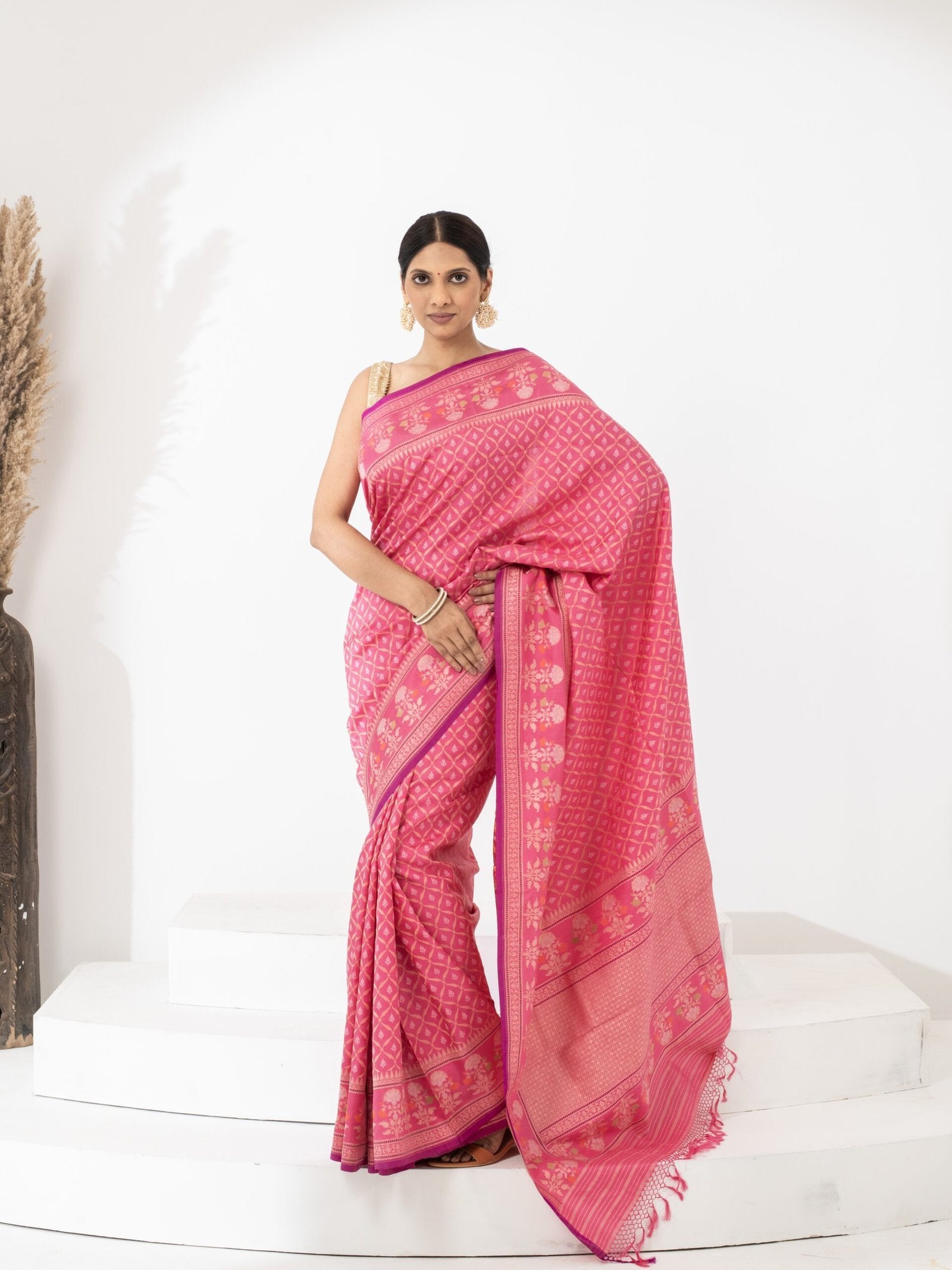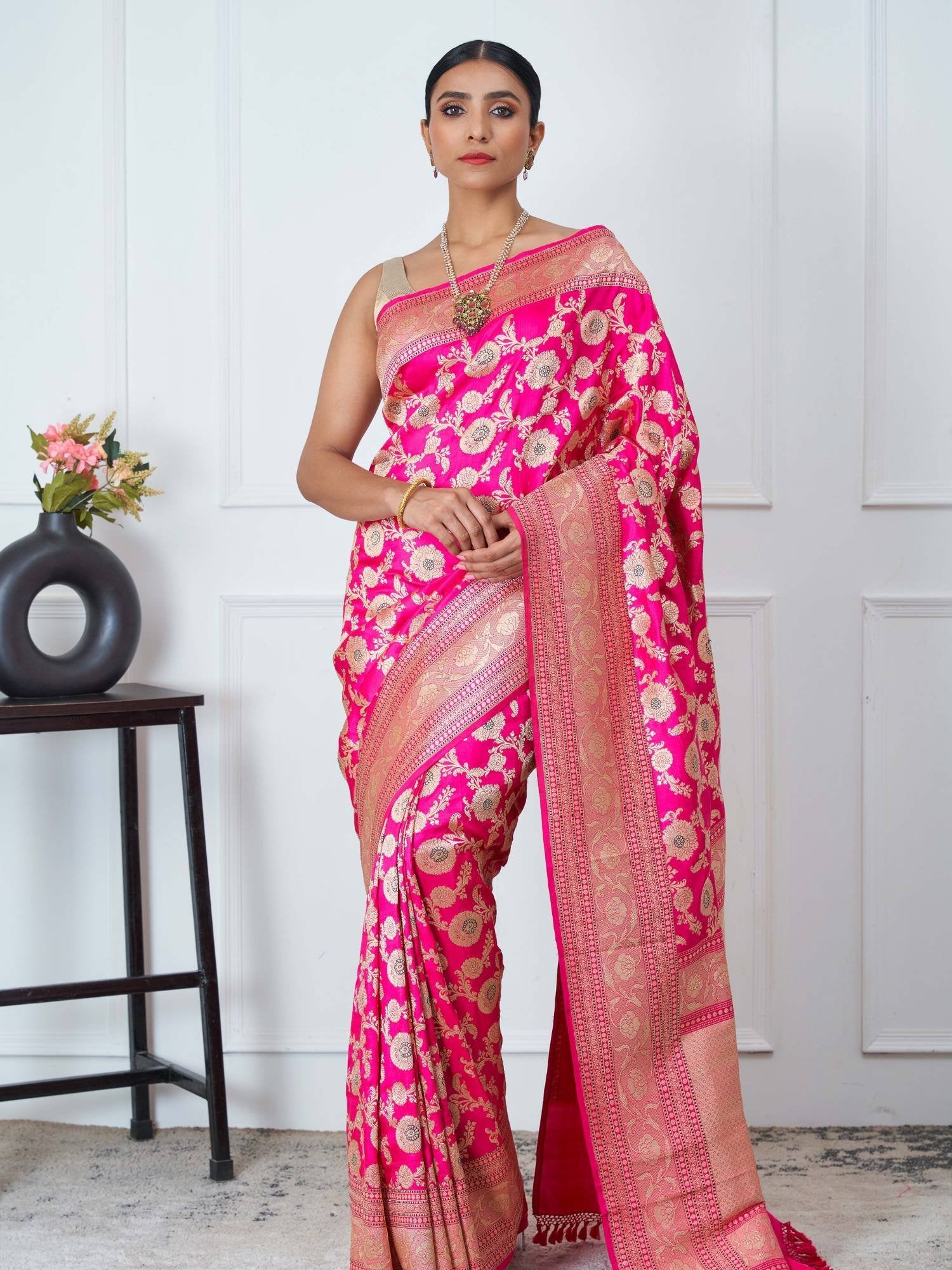 Color: Radiant fuchsia pink with golden zari highlights