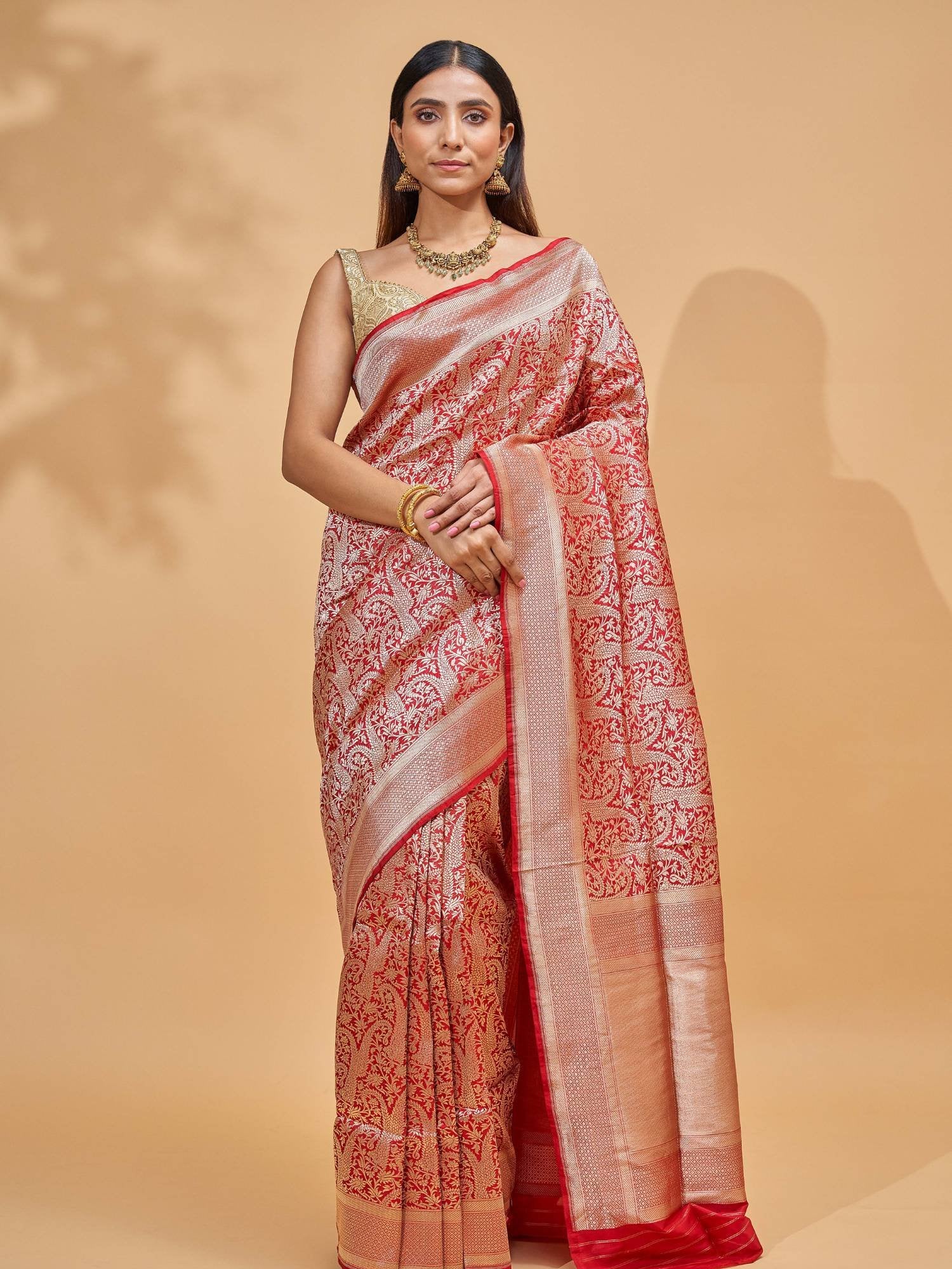 The delicate craftsmanship of Banaras weavers brings out the brilliance of this saree. When you drape it, you carry centuries of weaving tradition while looking resplendent in festive finery.
