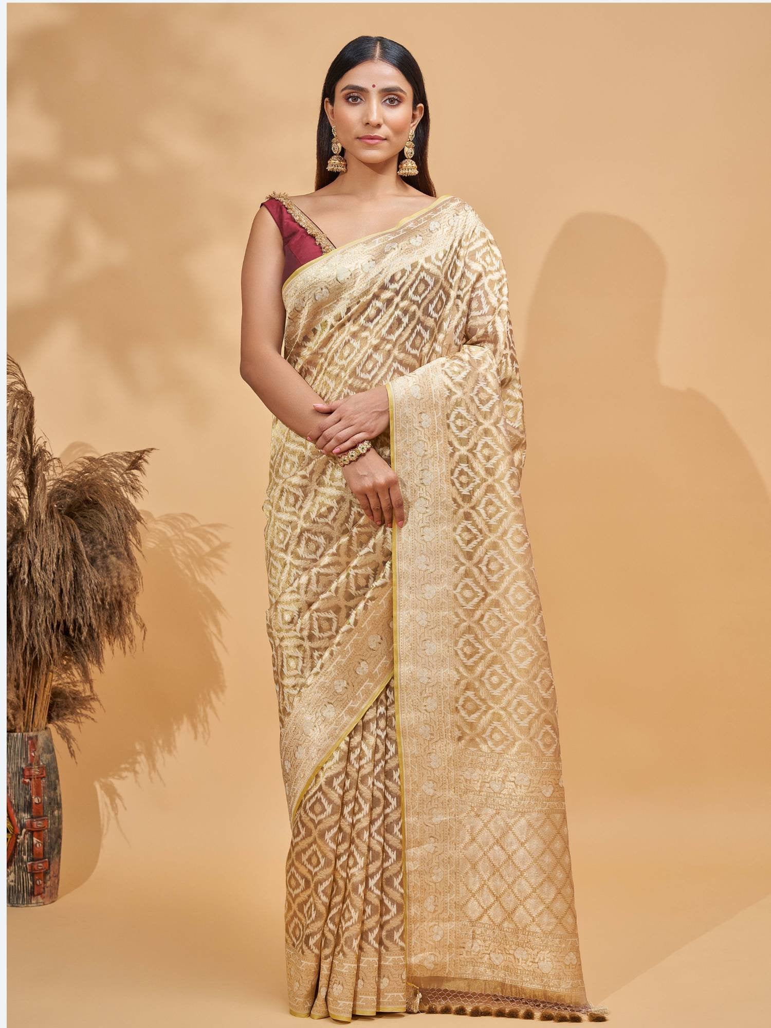 If luxury had a name, it would be the Gold Sona Rupa Jaal Tissue Saree. This saree embodies the opulence of Diwali with its shimmering gold and silver weaving that glows under the light of diyas.