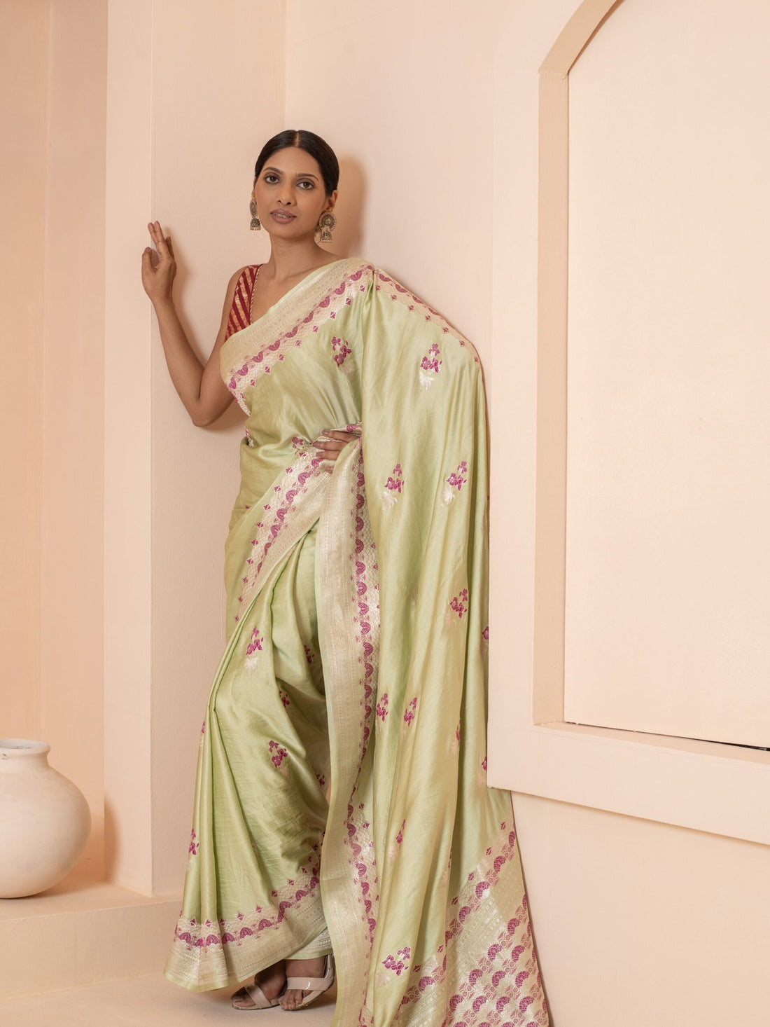 Experience timeless elegance with Ekta (Pista Green Meenakari Silk Saree) — a true testament to...