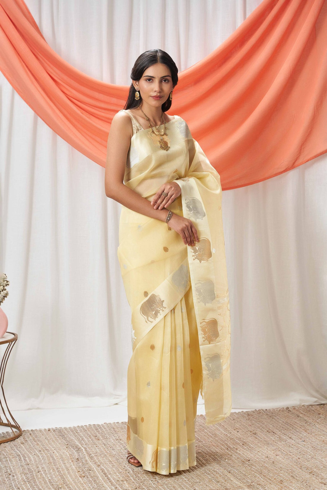 An epitome of grace and heritage, this Kora Banarasi Saree features exquisitely Kadwa-woven Nandi motifs...