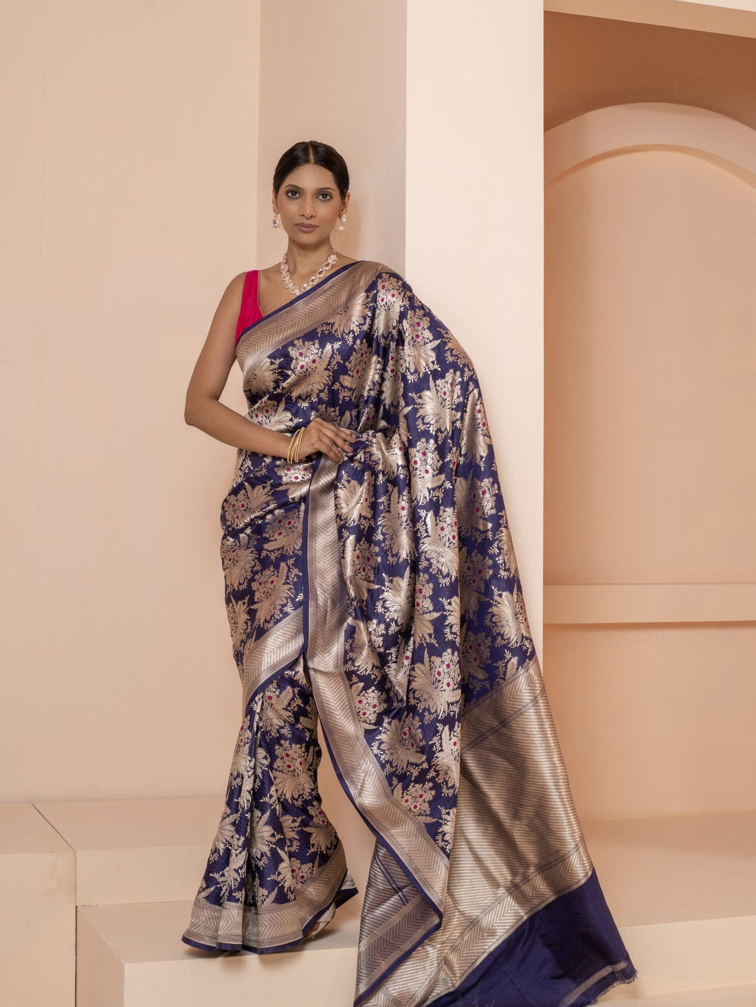 Immerse yourself in the opulent charm of the Indira (Midnight Bloom Katan Silk Saree), a...