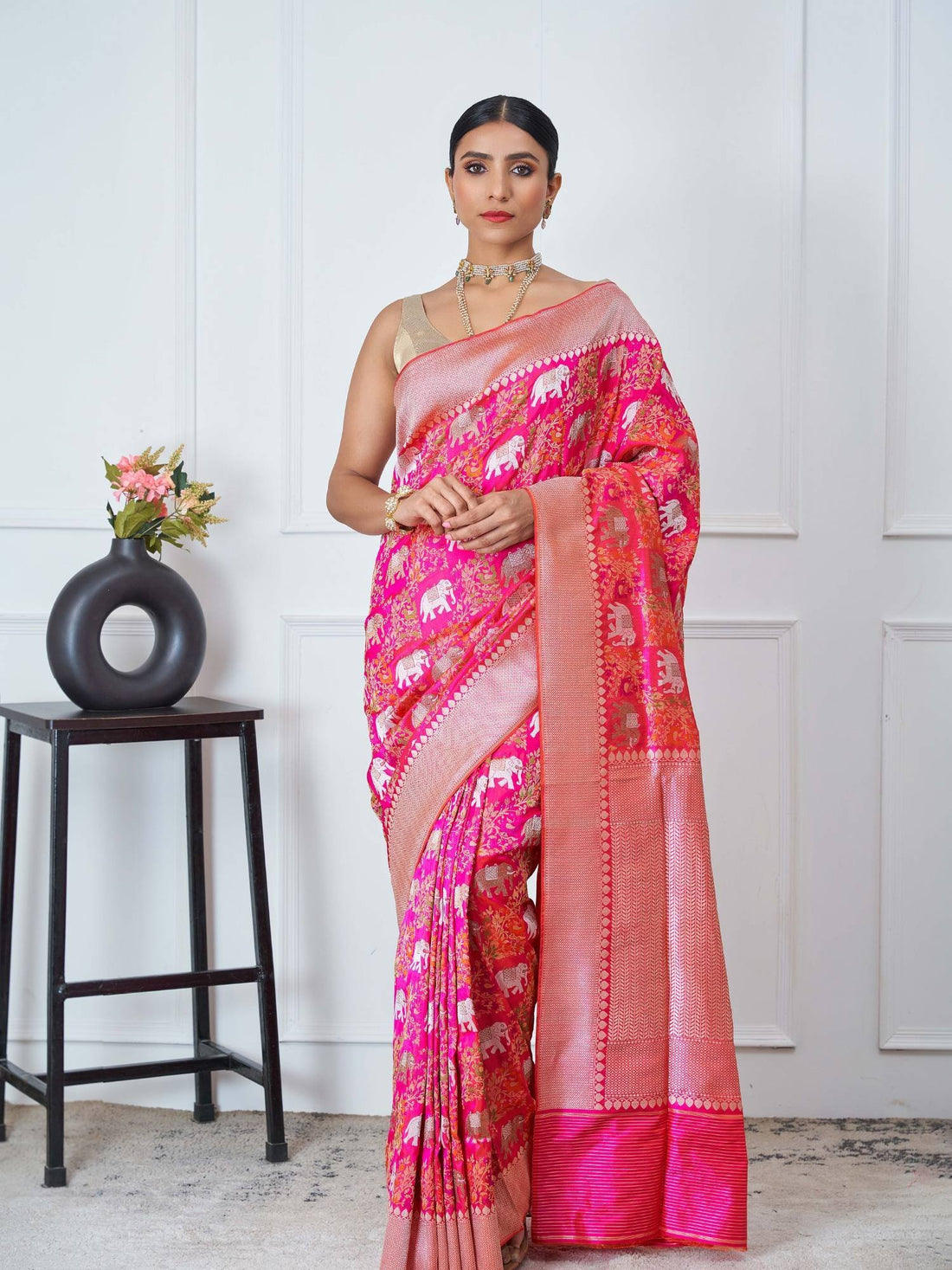 Step into a world of regal charm with the Bhavya (Pink Shikargah Banarasi Saree), a...