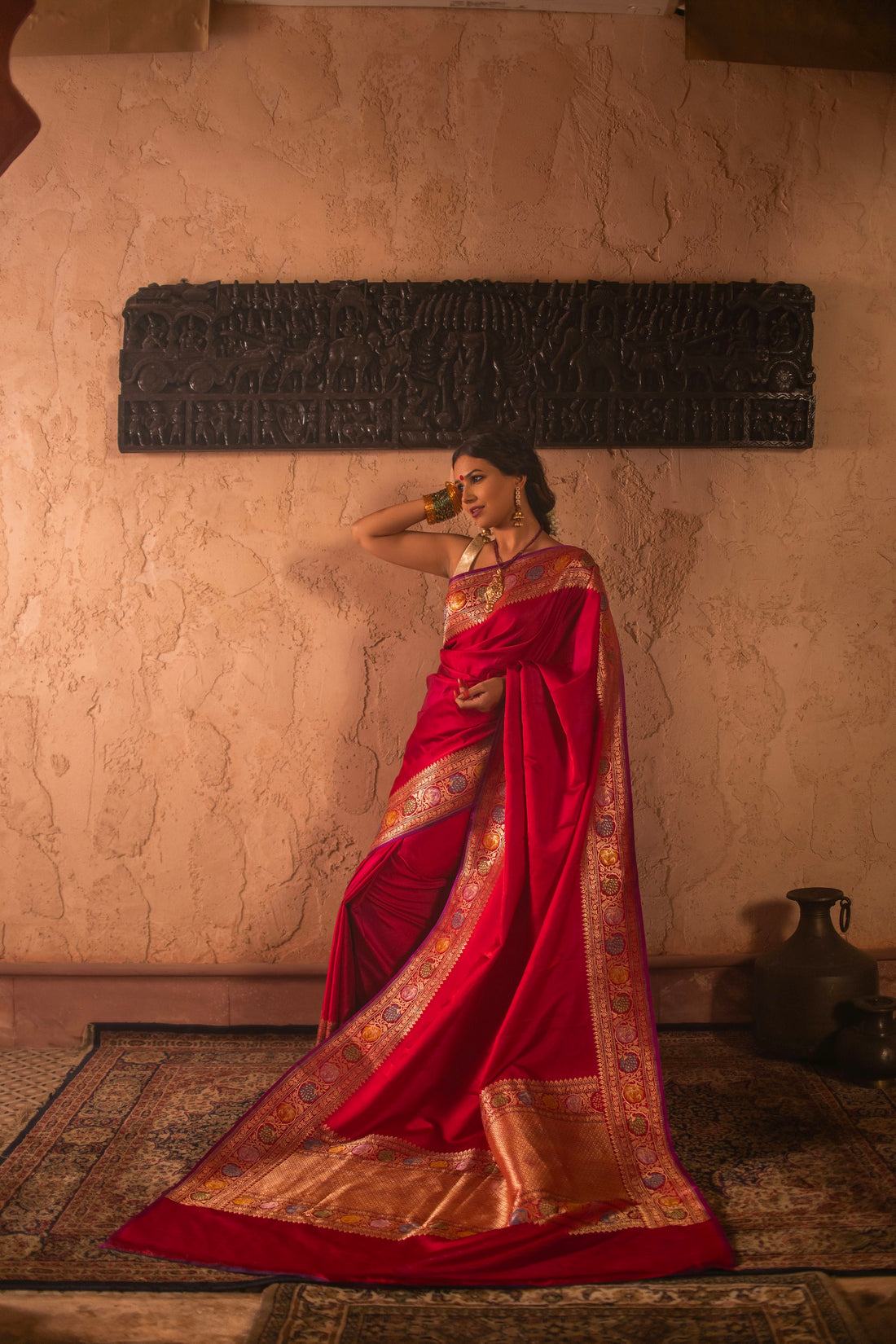 Red Banarasi Katan Silk Saree with Allover Woven Design