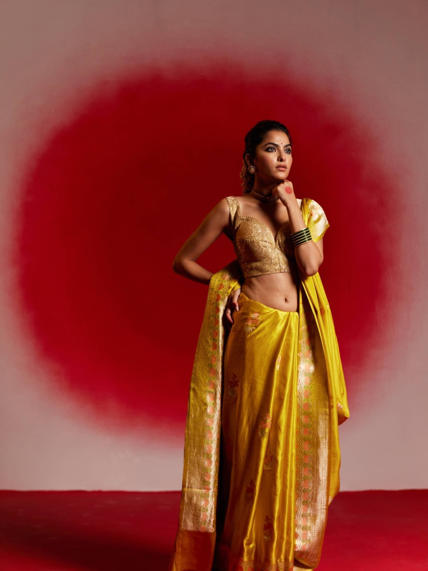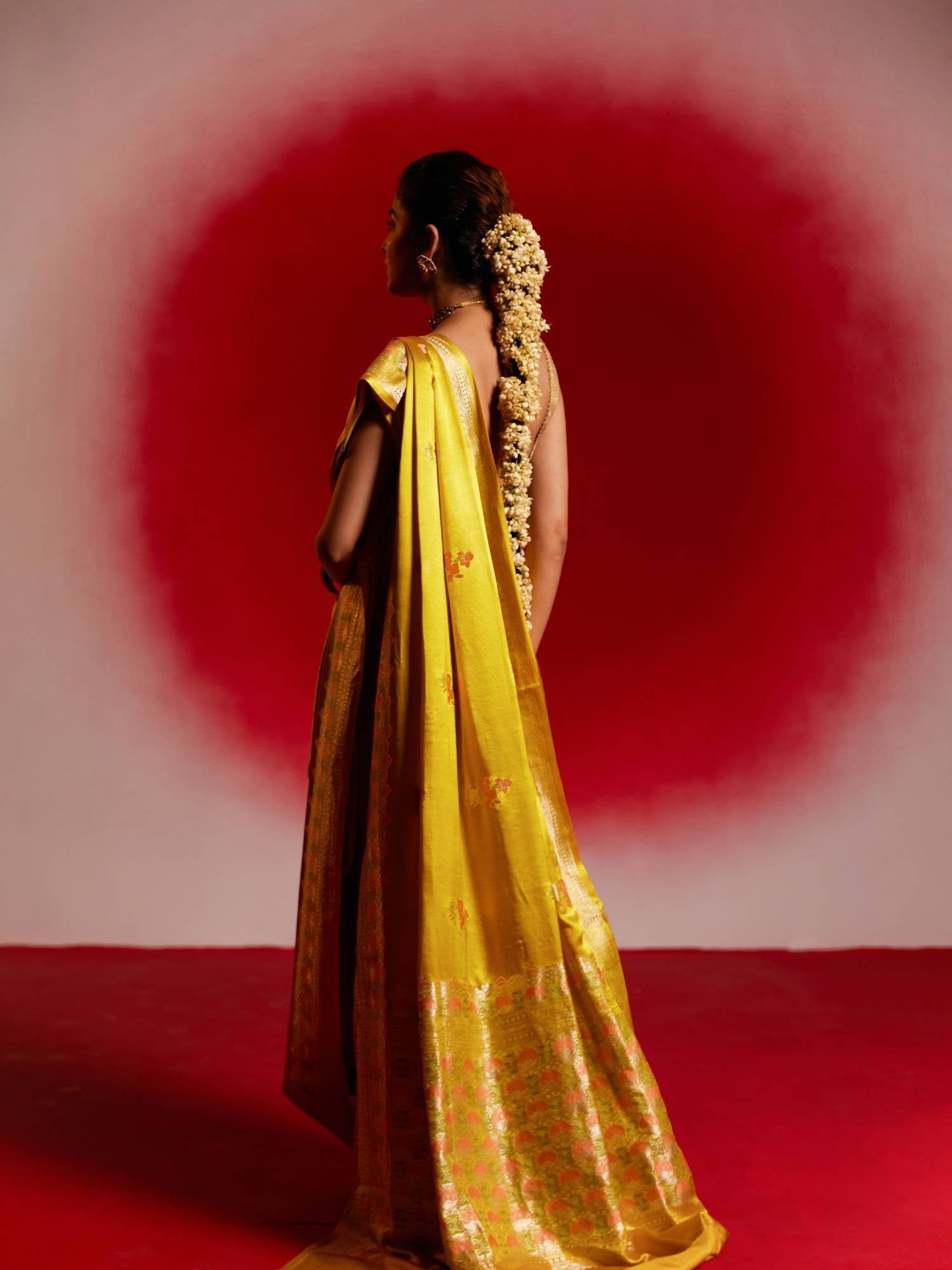Ambika (Yellow Kadwa Mushru Meena Boota Saree)