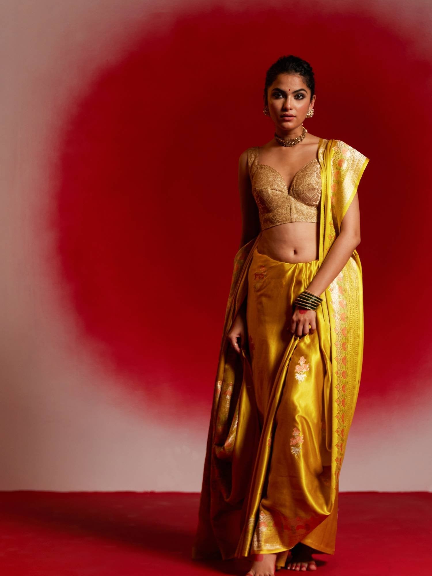 Immerse yourself in timeless elegance with the Ambika (Yellow Kadwa Mushru Meena Boota Saree) – a radiant blend of heritage artistry and modern grace. This captivating saree, drenched in a glowing yellow hue, is meticulously woven in the rare and luxurious Mushru Satin fabric, known for its supple drape and soft sheen. The exquisite Kadwa weave – a hallmark of fine handloom – is brought to life with intricate foliate motifs created using gold zari and delicate meenakari work.