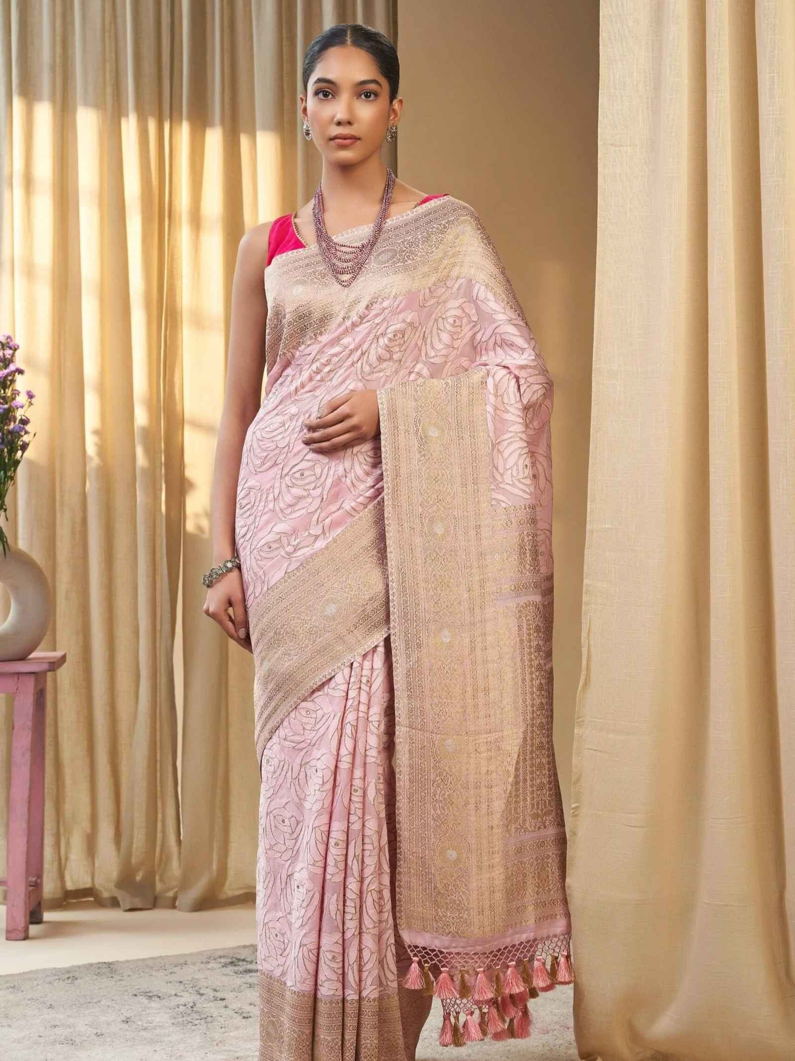 The body of the saree features the refined beauty of white Chikankari work, each floral motif whispering tales of intricate craftsmanship. Subtle yet richly detailed, the Ari work enhances the visual texture, giving the saree a delicate but ornate appeal. What makes Anasuya truly luxurious is the Kadwa technique — a hallmark of the Banaras loom — where each motif is individually woven, not embroidered, lending unmatched richness and finesse.