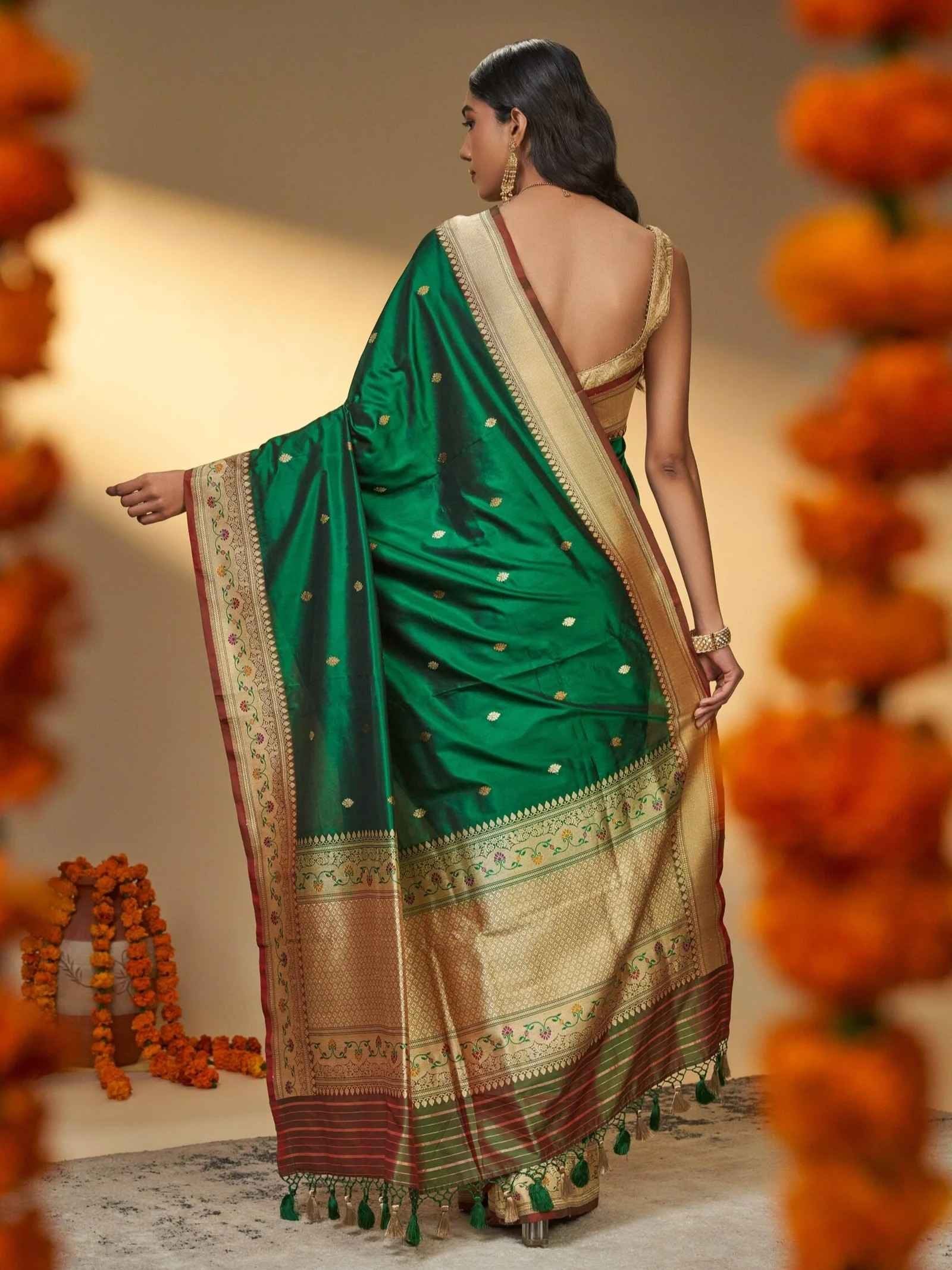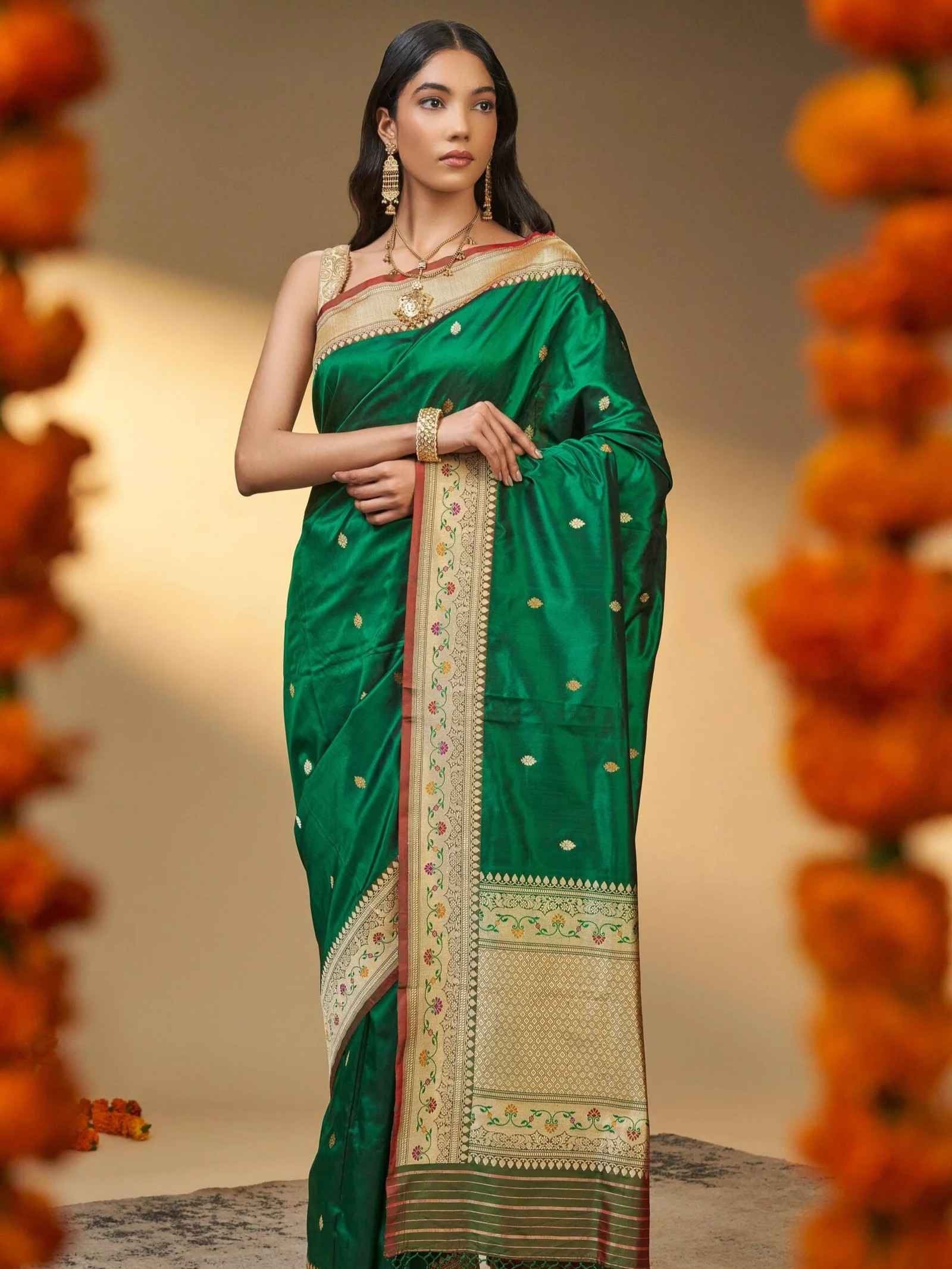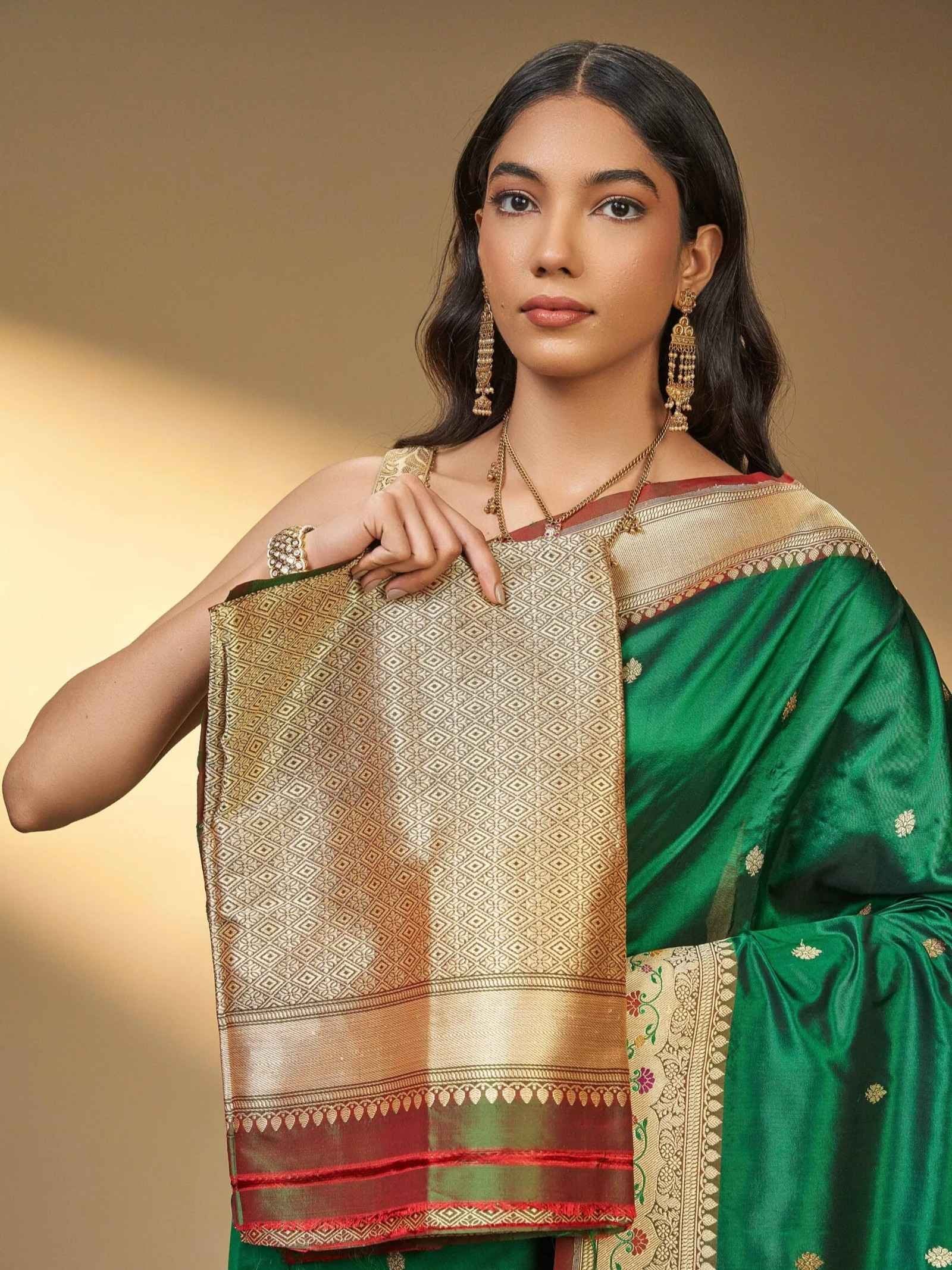 Every inch of this saree is enhanced with pure zari work, contributing to its grandeur and making it ideal for bridal wear, festive celebrations, or as a treasured heirloom. The rich, classic tones add a majestic feel, while the soft Katan silk ensures a graceful fall and fluid drape.