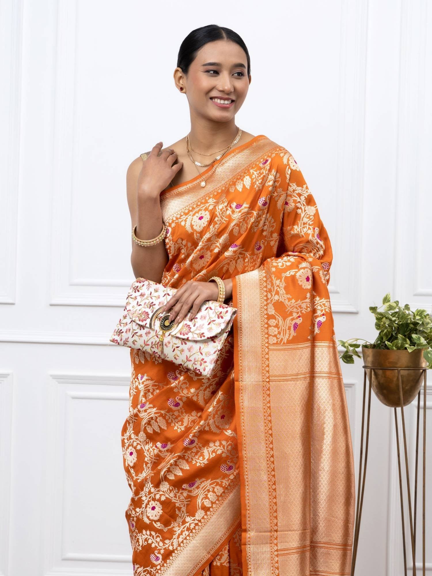 An ode to heritage, this saree draws inspiration from the grandeur of Shikargha patterns—symbolizing nature, abundance, and prosperity. The warm, burnt orange hue adds an earthy charm, making it a beautiful choice for traditional and bridal wear. The border and pallu are adorned with age-old motifs, lending the saree a timeless appeal that transcends trends.
