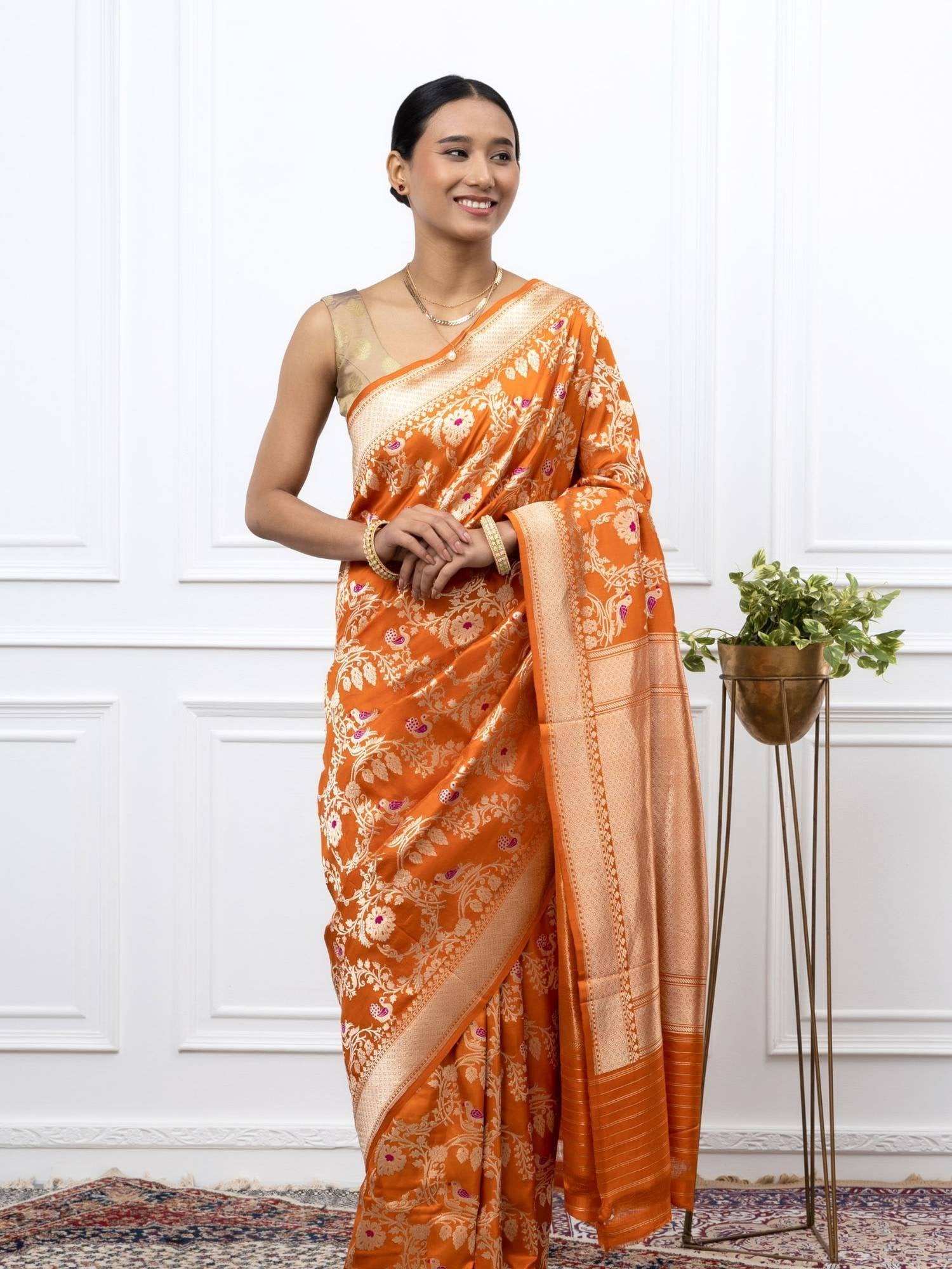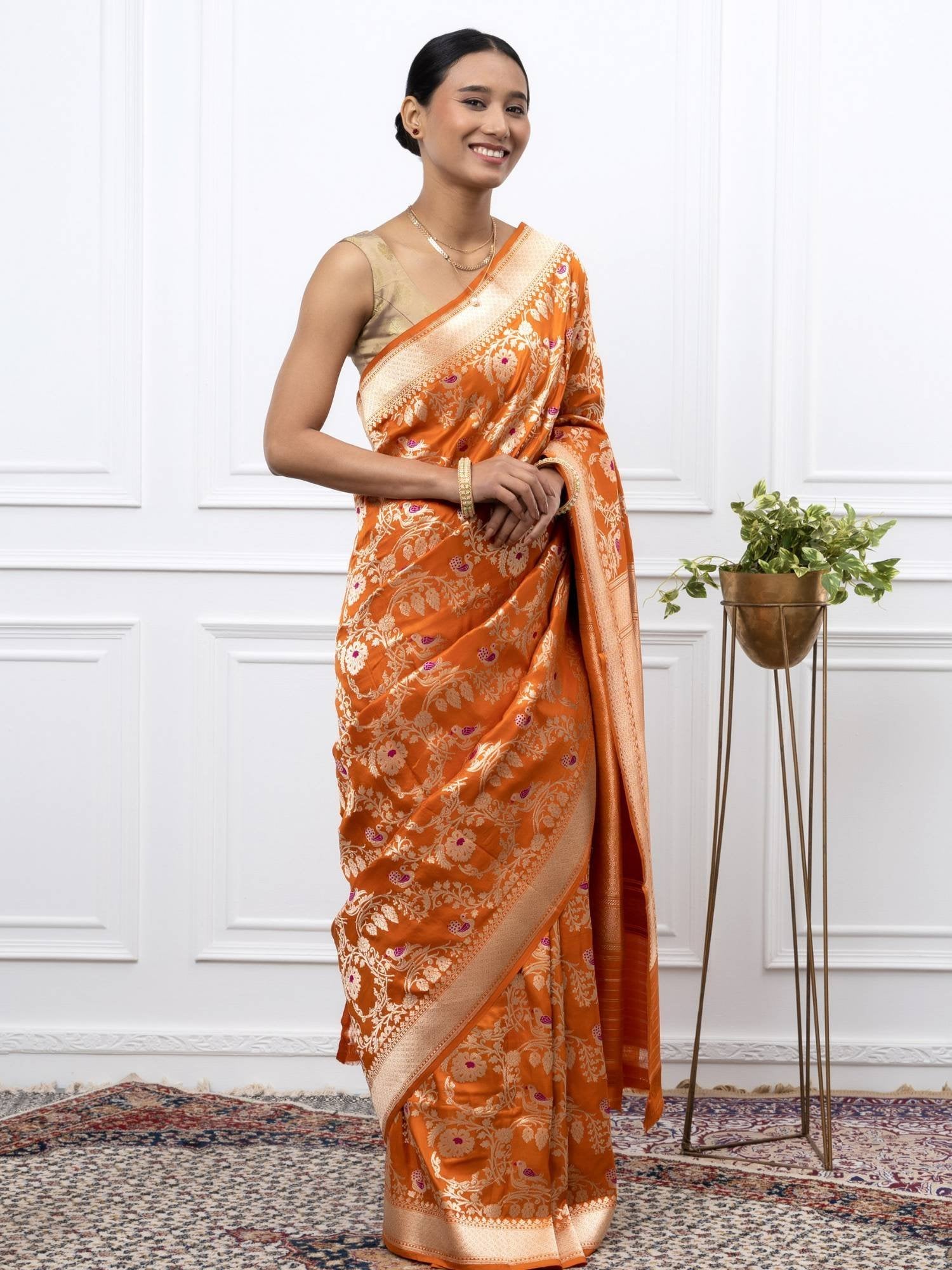 Elevate your bridal trousseau with the timeless elegance of the Bhakti (Shikargha Jangla Burnt Orange Saree). This exquisite Banarasi saree is a celebration of Indian craftsmanship, tradition, and regal aesthetics. Meticulously handwoven in rich Katan Silk, the saree features the finest Kadwa Jangla weave, showcasing an elaborate creeper jaal with intricate bird motifs in pure gold zari.