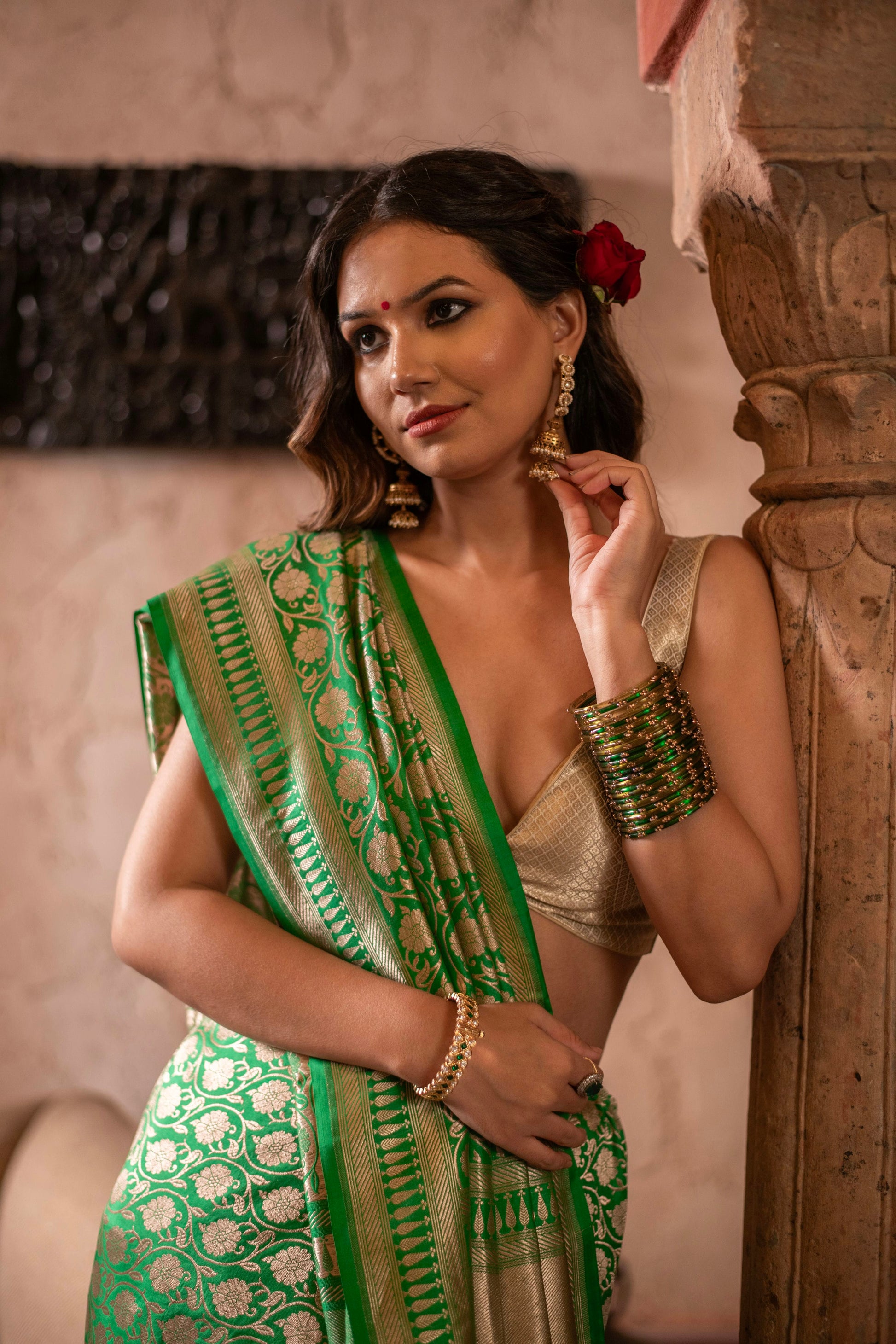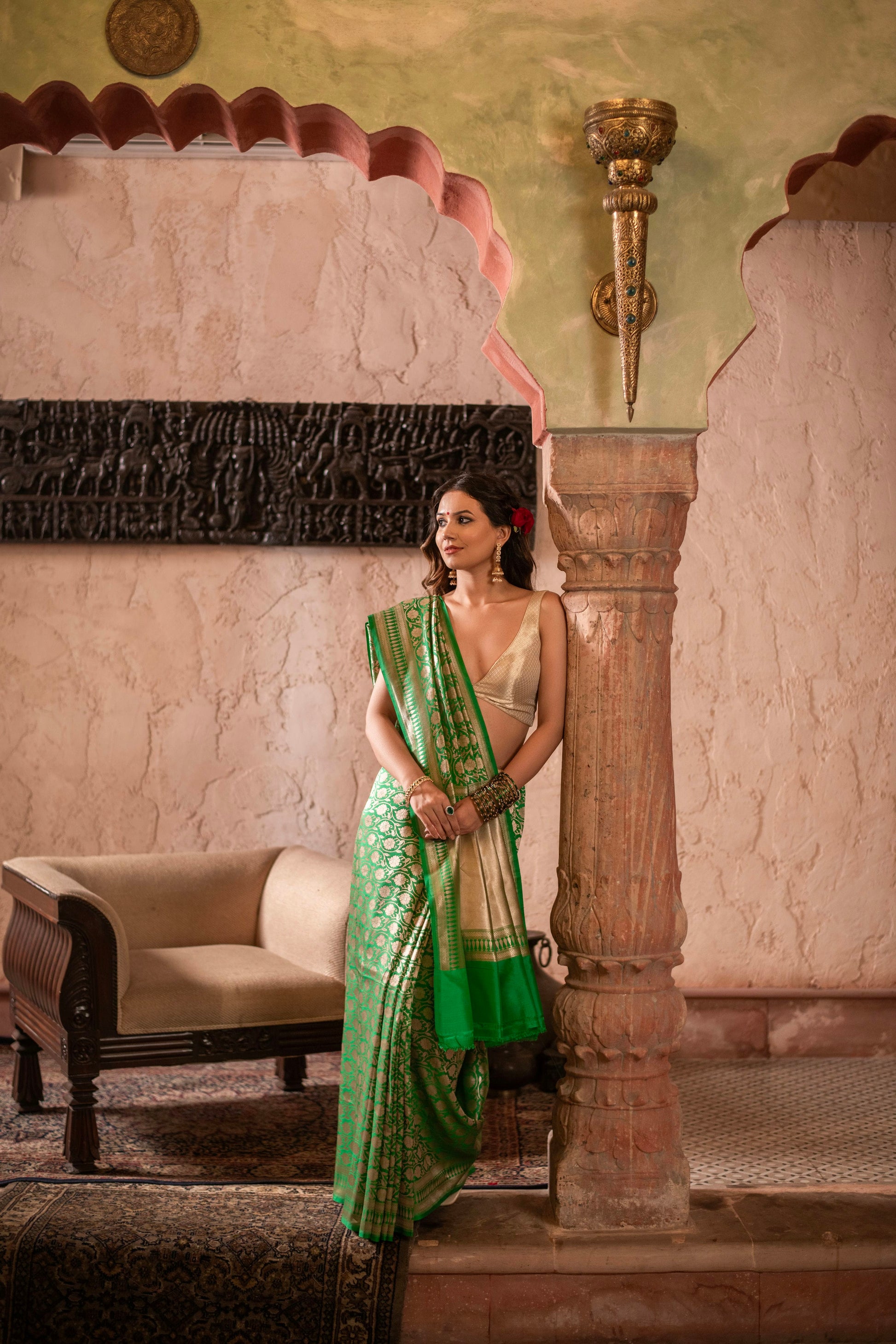Bright Green Banarasi Silk Saree in Allover Kadwa Weave