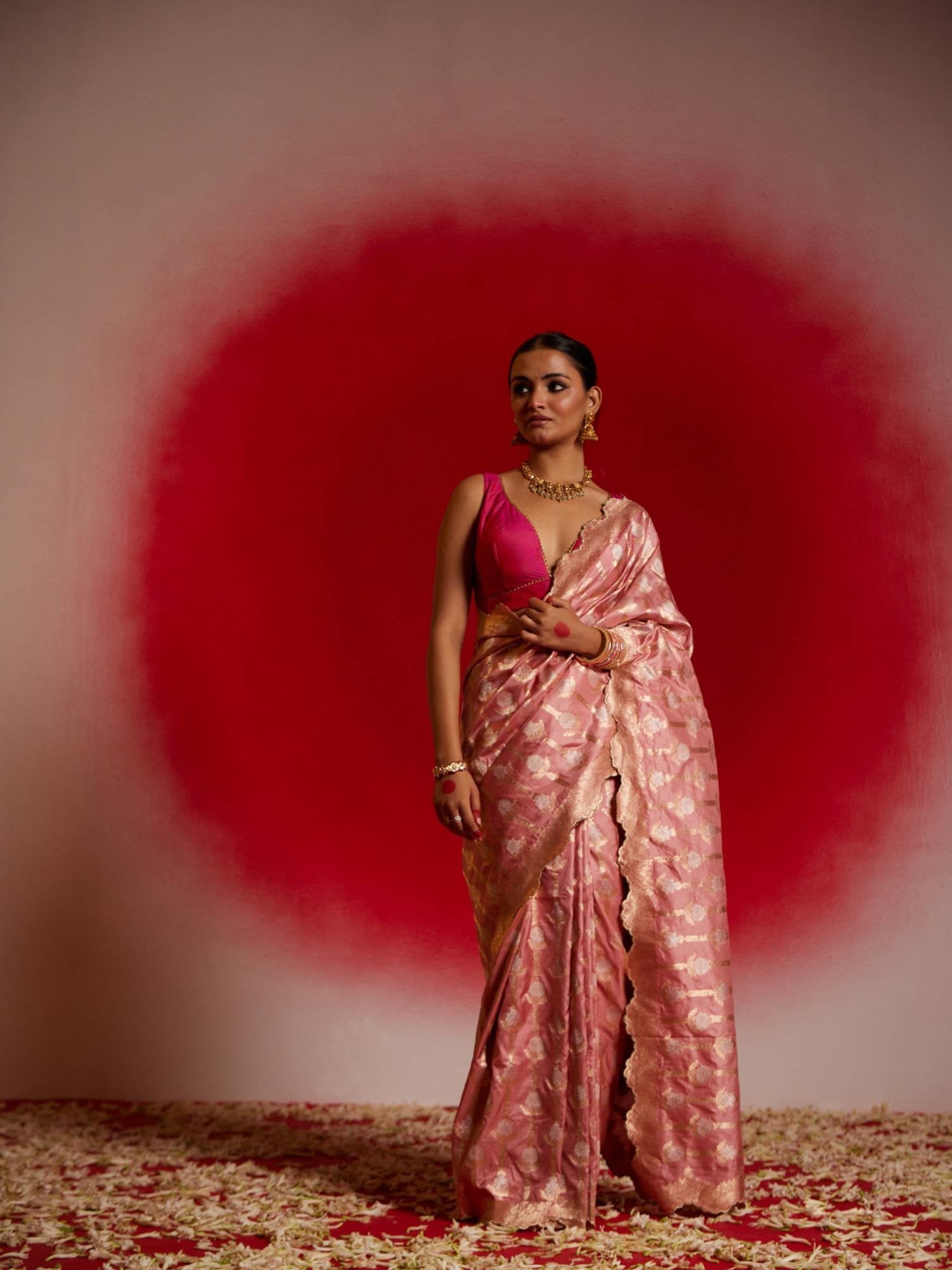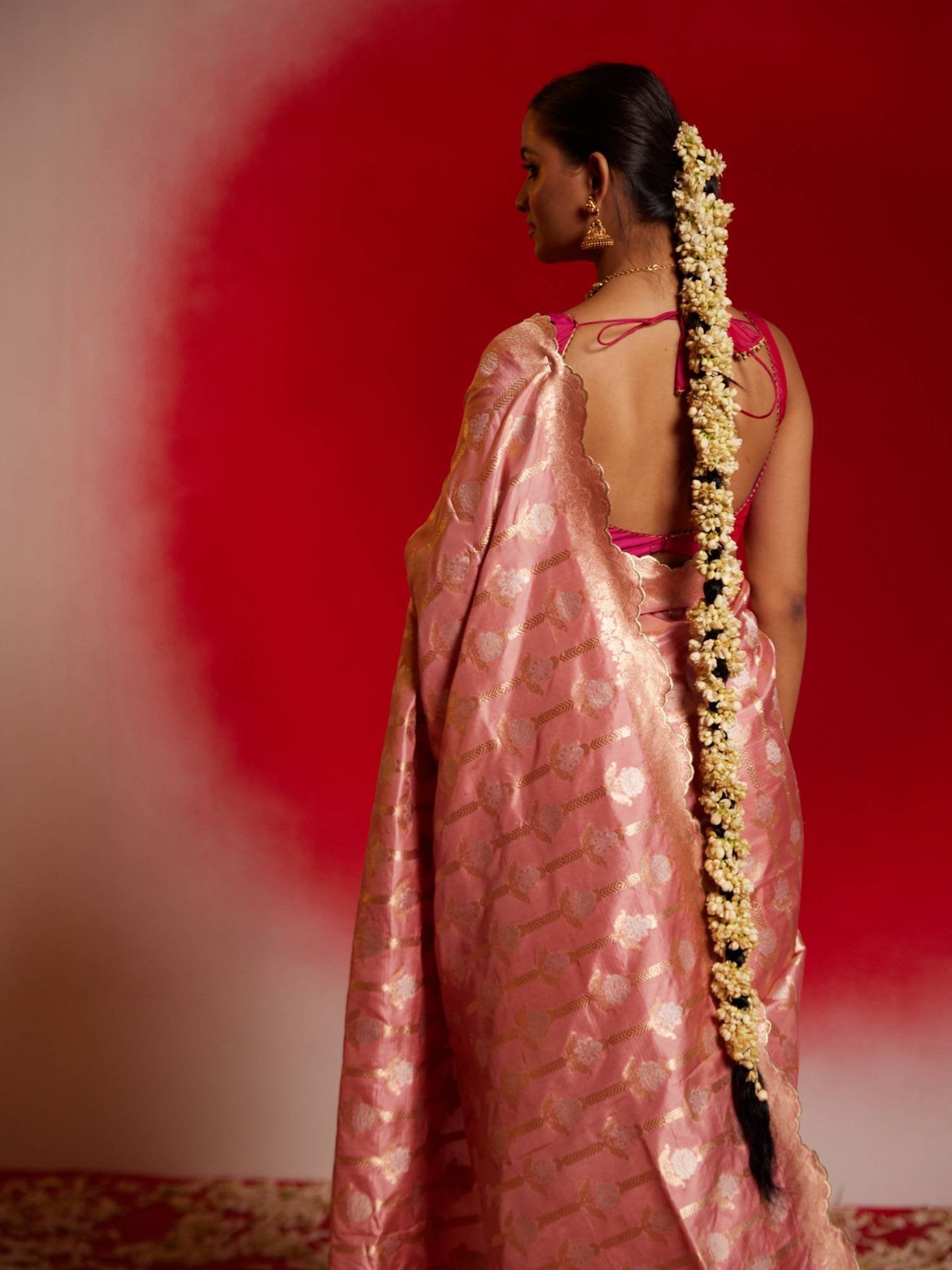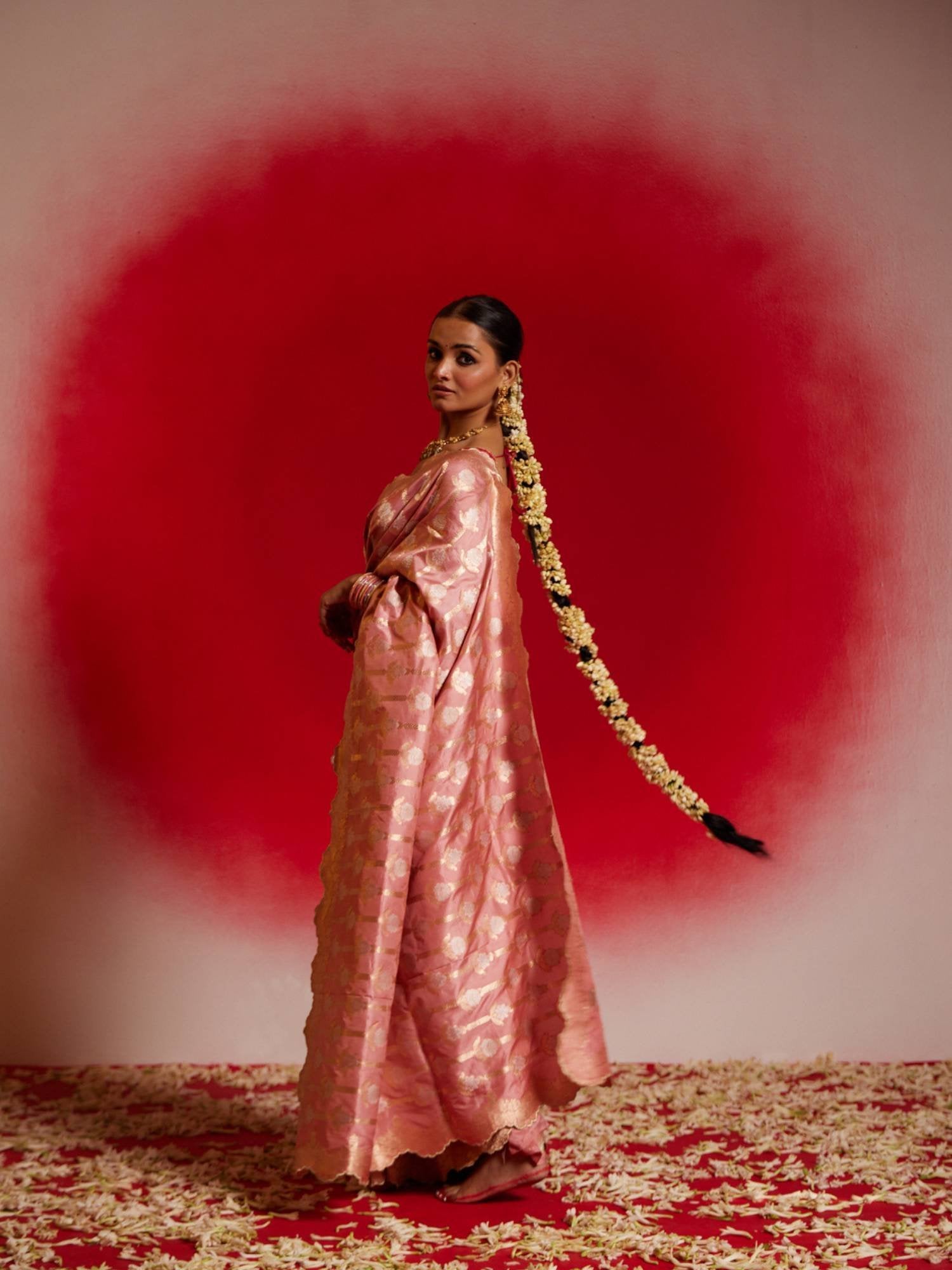 Experience timeless elegance with the Brinda (Rose Pink Scallop Border Saree) — a captivating blend of age-old craftsmanship and contemporary flair. This exquisite saree is woven in a luminous Rose Pink hue, making it a versatile choice for both festive and modern celebrations. Crafted from luxurious Katan Silk, the drape showcases an intricate vertical floral jaal that runs seamlessly across the body, enhancing its visual grace and refined texture.