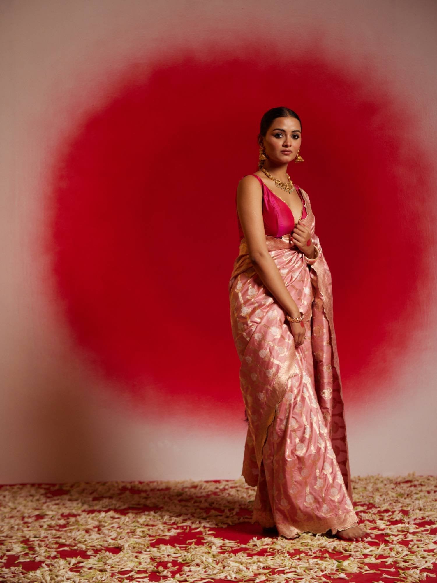 What sets Brinda (Rose Pink Scallop Border Saree) apart is its classic border — traditional in its origin but reimagined with delicate scalloping, offering a fusion that’s as stylish as it is cultural. The thoughtful detailing adds a soft, modern finish while honoring heritage. The blouse is crafted in the same stunning pink tone and adorned with a matching border, perfectly complementing the saree and elevating the overall ensemble.
