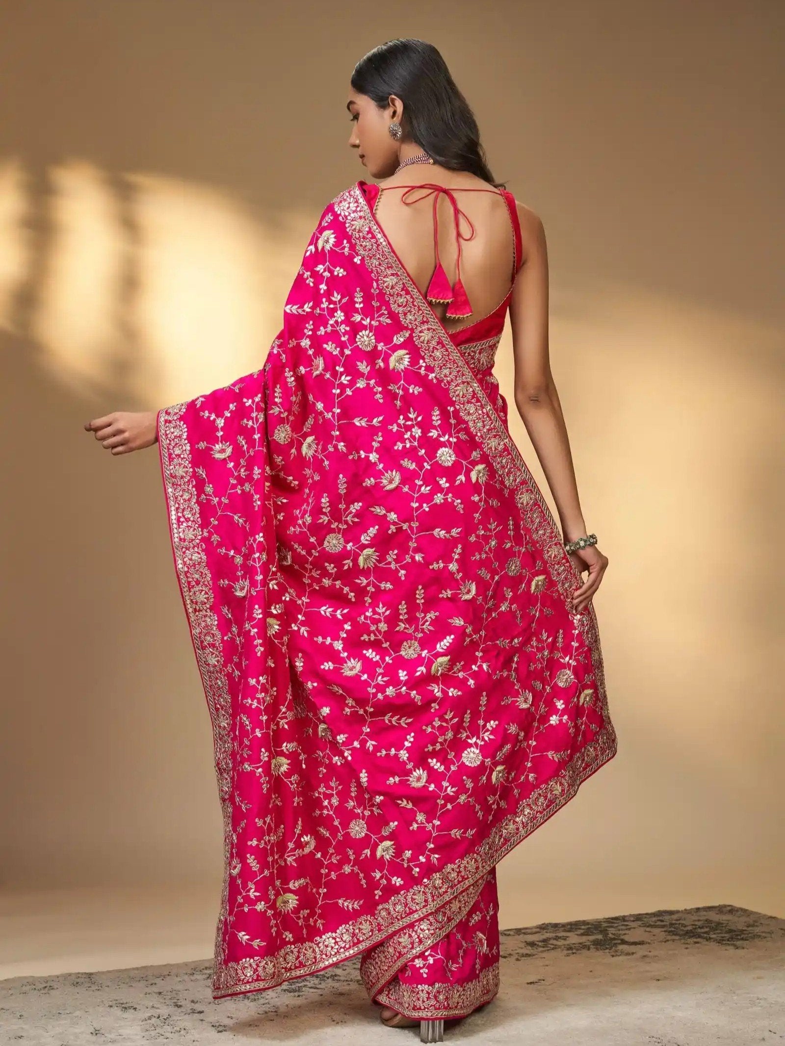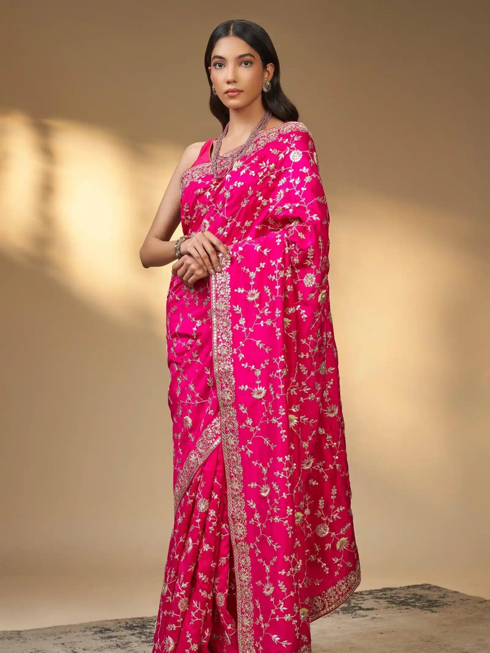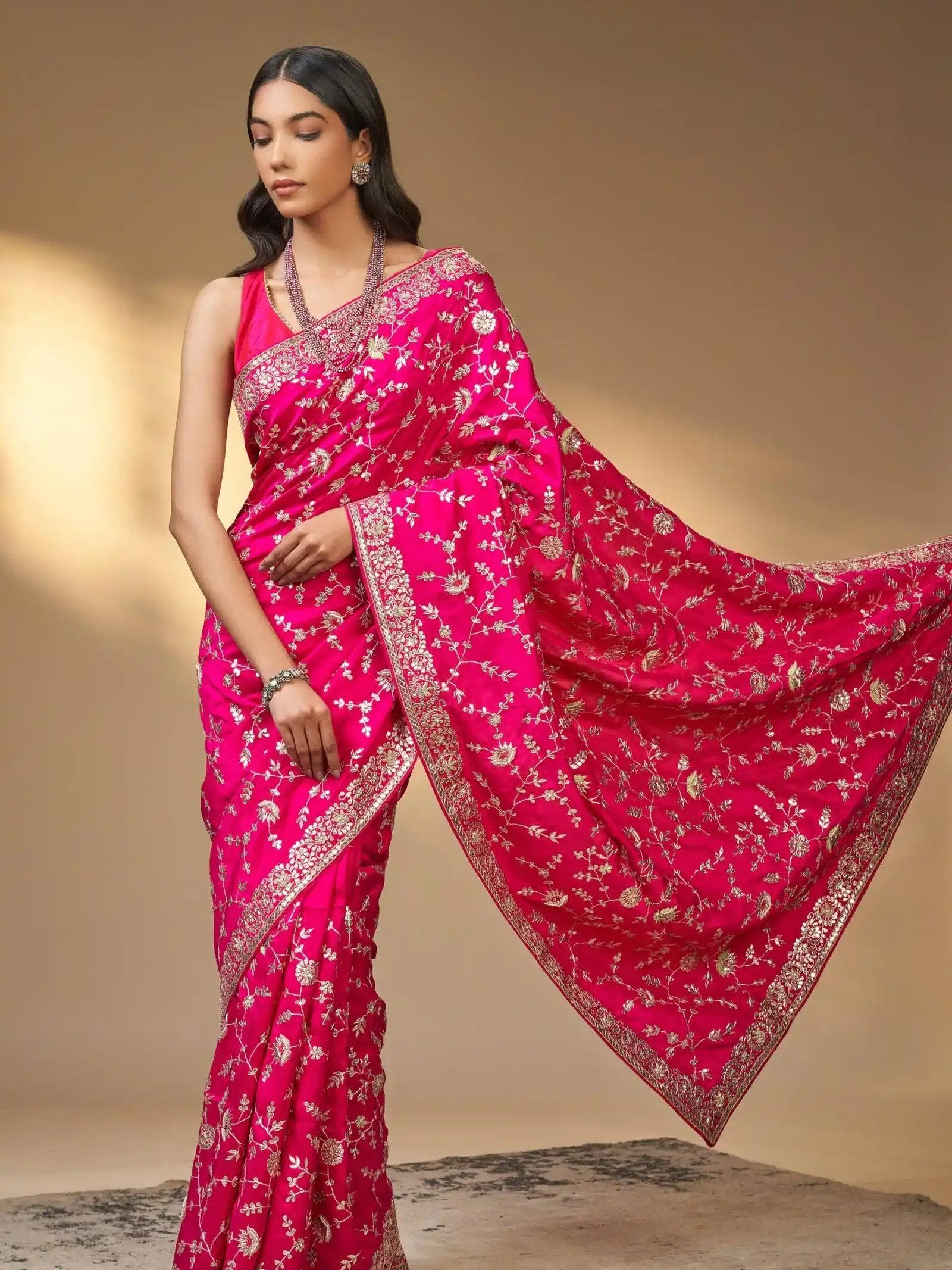 The bold hue of hot pink enhances the festive aura, while the luxurious silk fabric ensures a graceful and fluid drape. The highlight of this saree lies in its intricate embellishments—traditional Zardozi and Gotta Patti embroidery—that elevate its visual appeal. The shimmer of the embellishments against the soft silk adds a touch of royalty, making the saree not just an outfit but a statement of elegance.