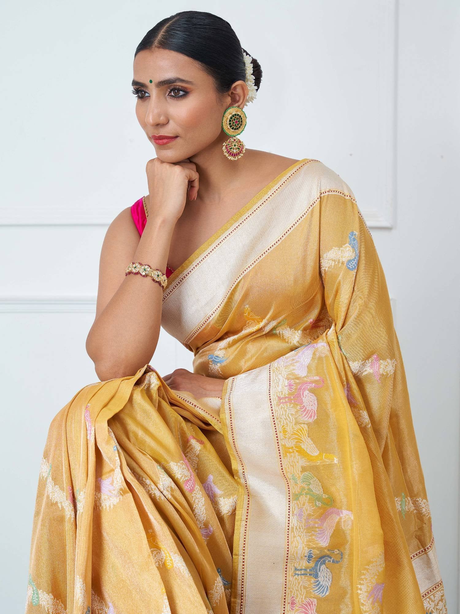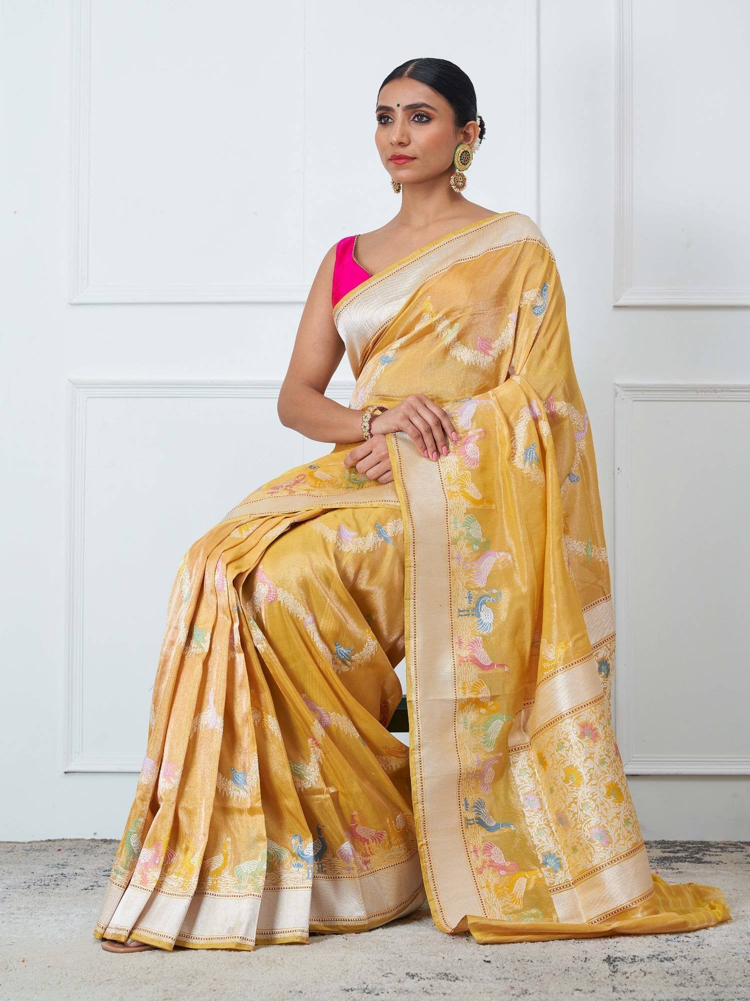 The use of pure Katan silk lends this saree a lustrous texture and a soft yet structured drape. The charming yellow hue adds a cheerful sophistication, making it suitable for festive mornings, intimate celebrations, or even a radiant wedding guest look. The elegant blend of color, weave, and motif makes Charulata a collector's delight and an heirloom-worthy addition to any wardrobe.