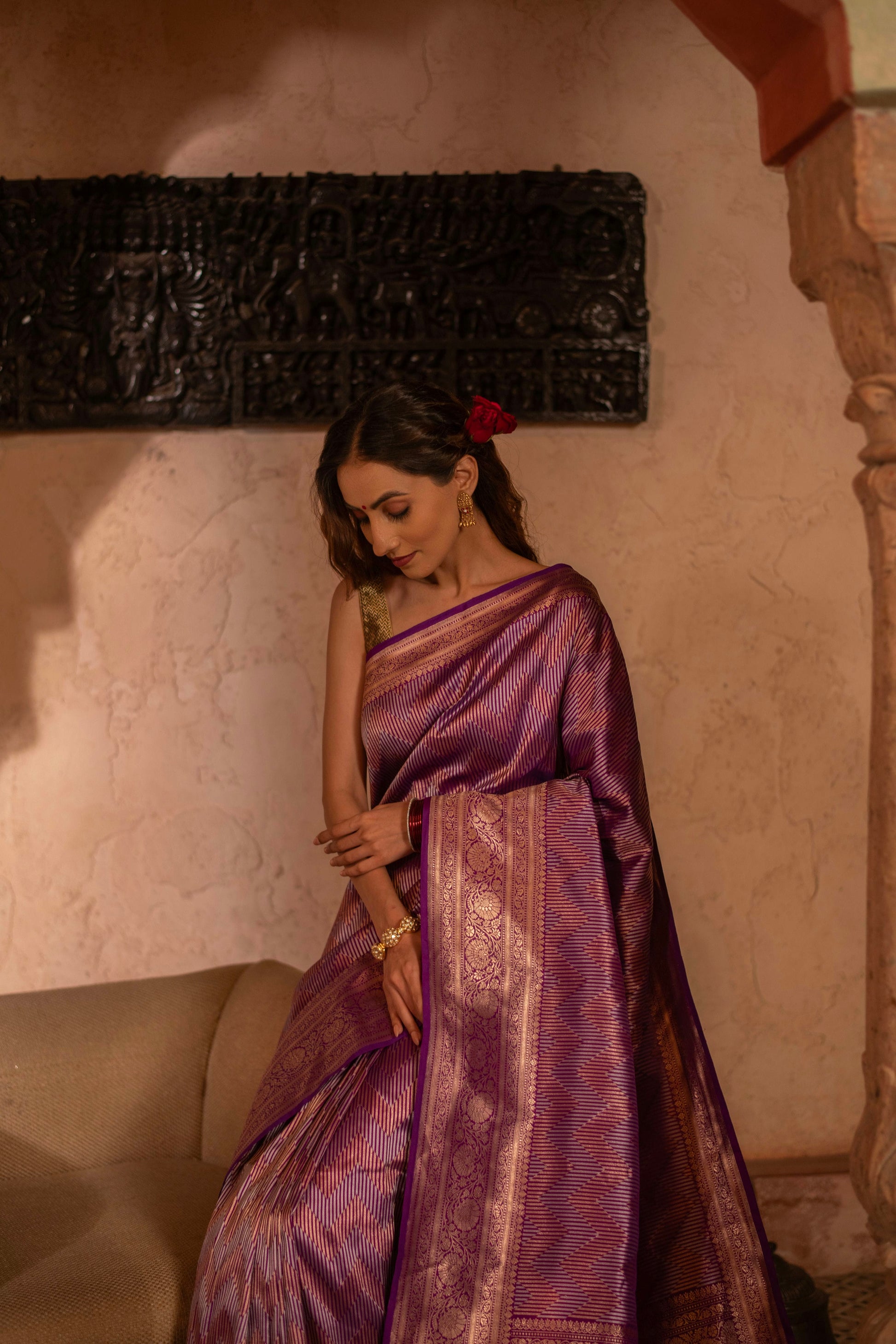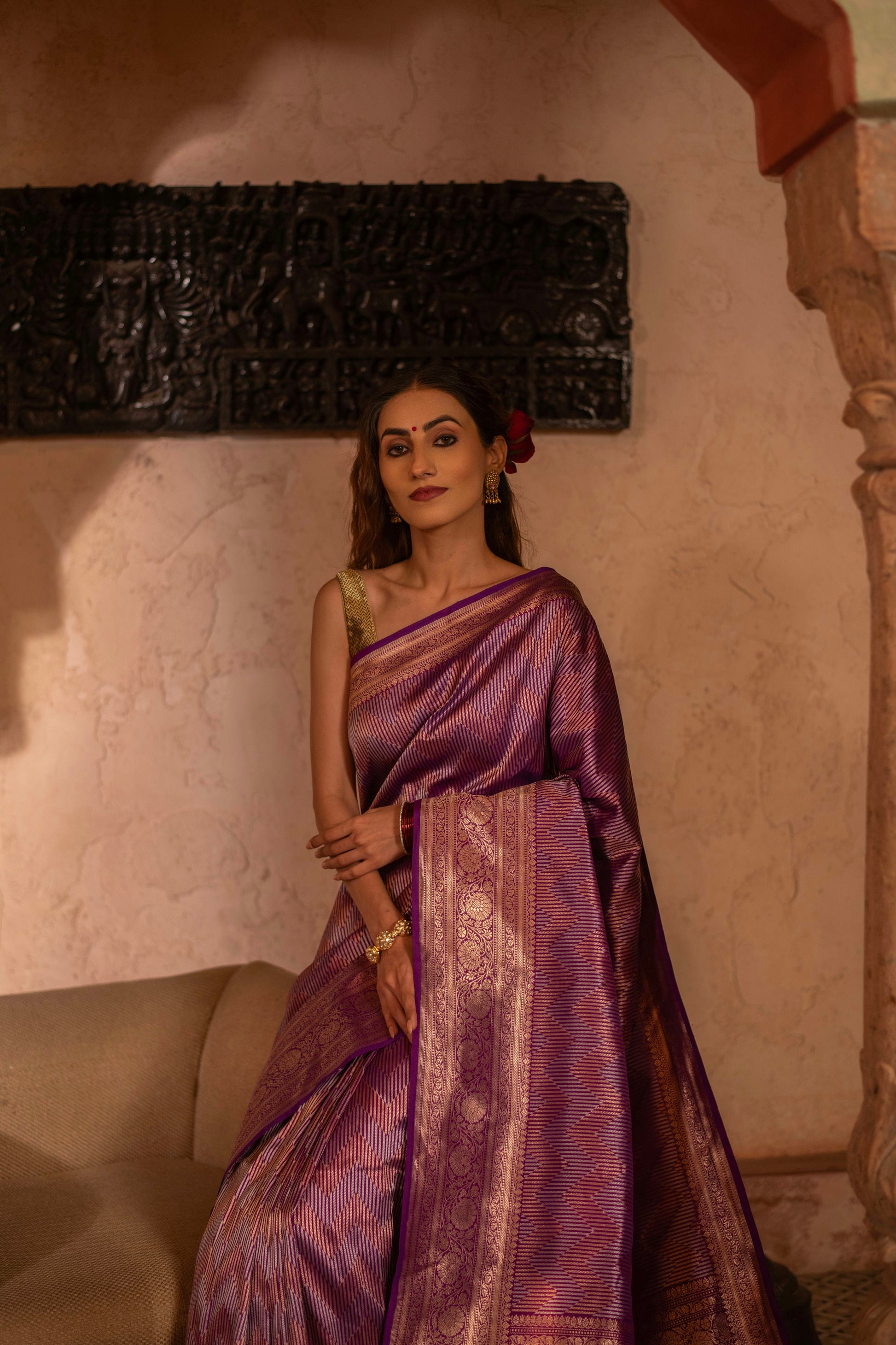 Contemporary Banarasi Silk Saree with Silver-Gold Chevron