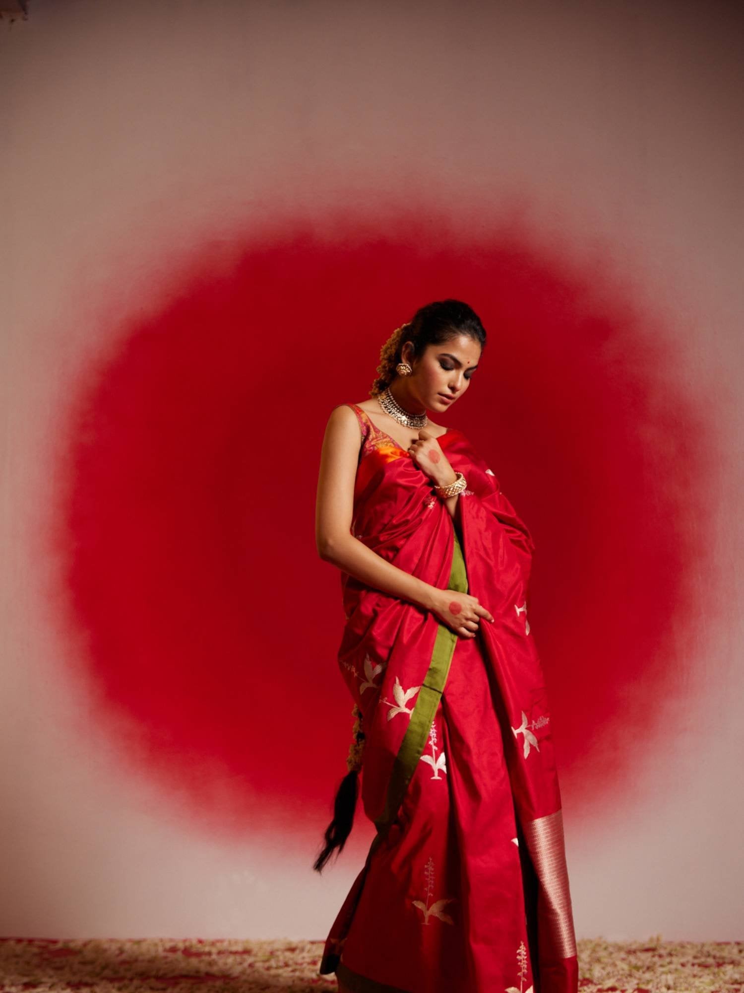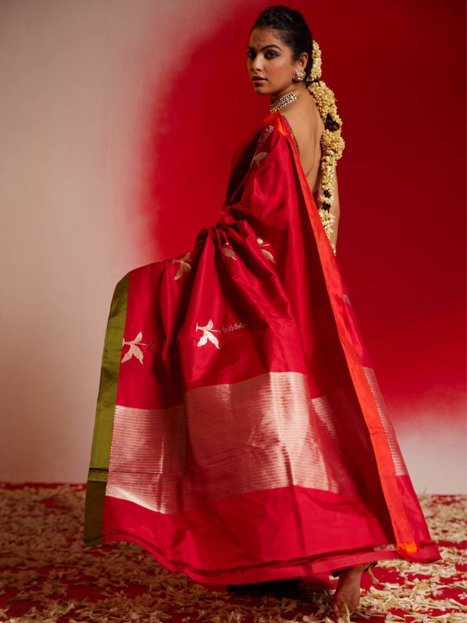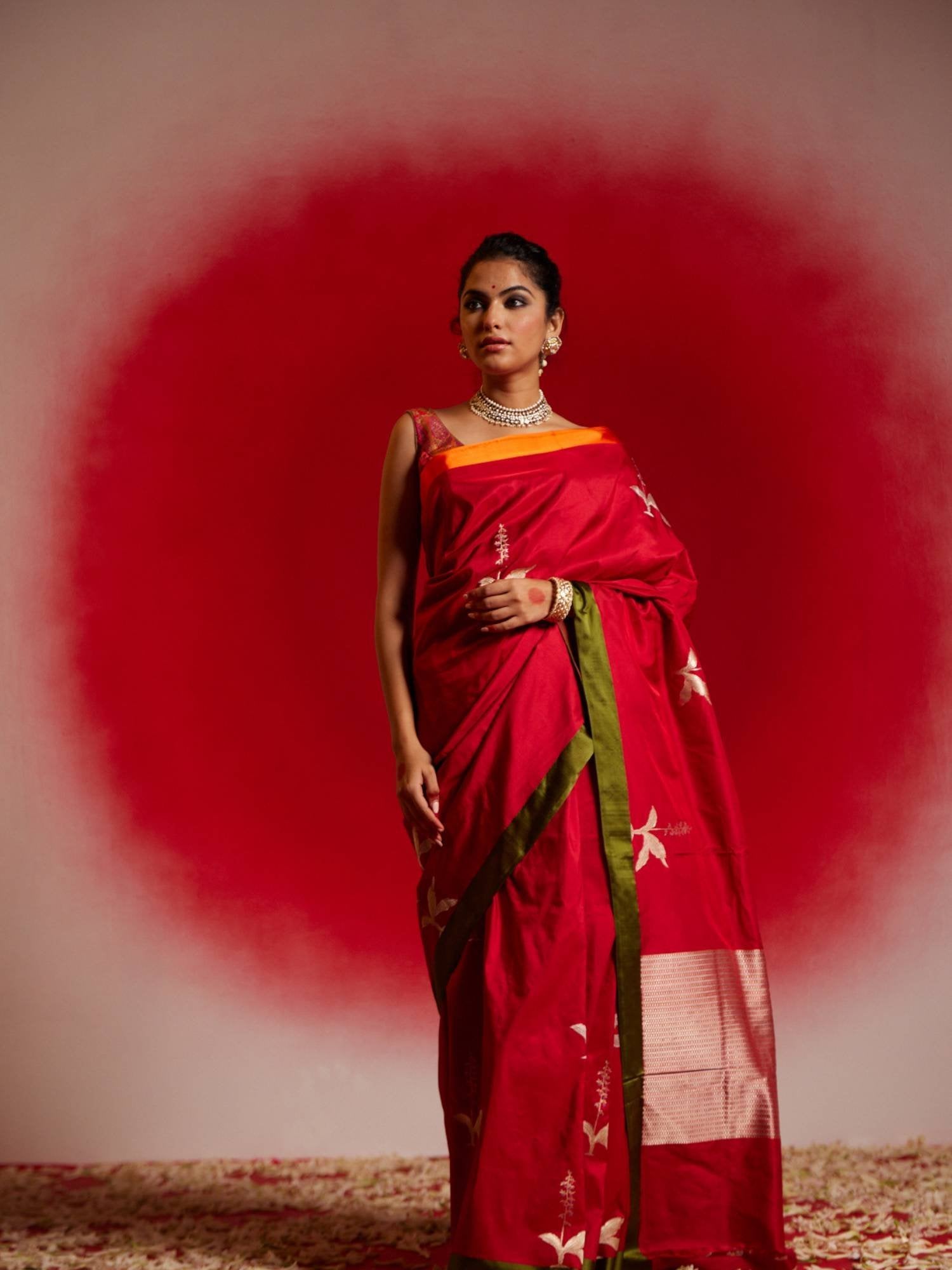 Immerse yourself in timeless elegance with the Deepmala (Red Pure Mushru Satin Saree), a perfect blend of regal craftsmanship and luxurious charm. This radiant red saree, crafted in pure Mushru satin silk, exudes grace with every drape. The highlight lies in its pristine foliate motifs, carefully handwoven in both gold and silver zari, using the intricate Kadwa weave technique—renowned for its durability and unmatched finesse. The undulating Ganga Jamuna border, artfully woven, adds a subtle contrast and enhances the richness of the ensemble.