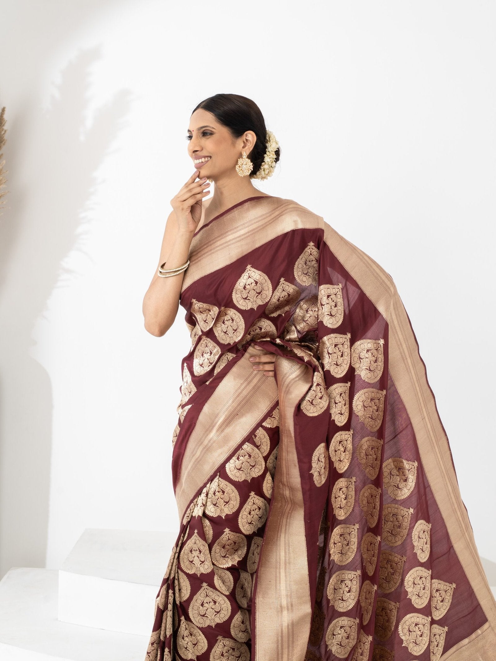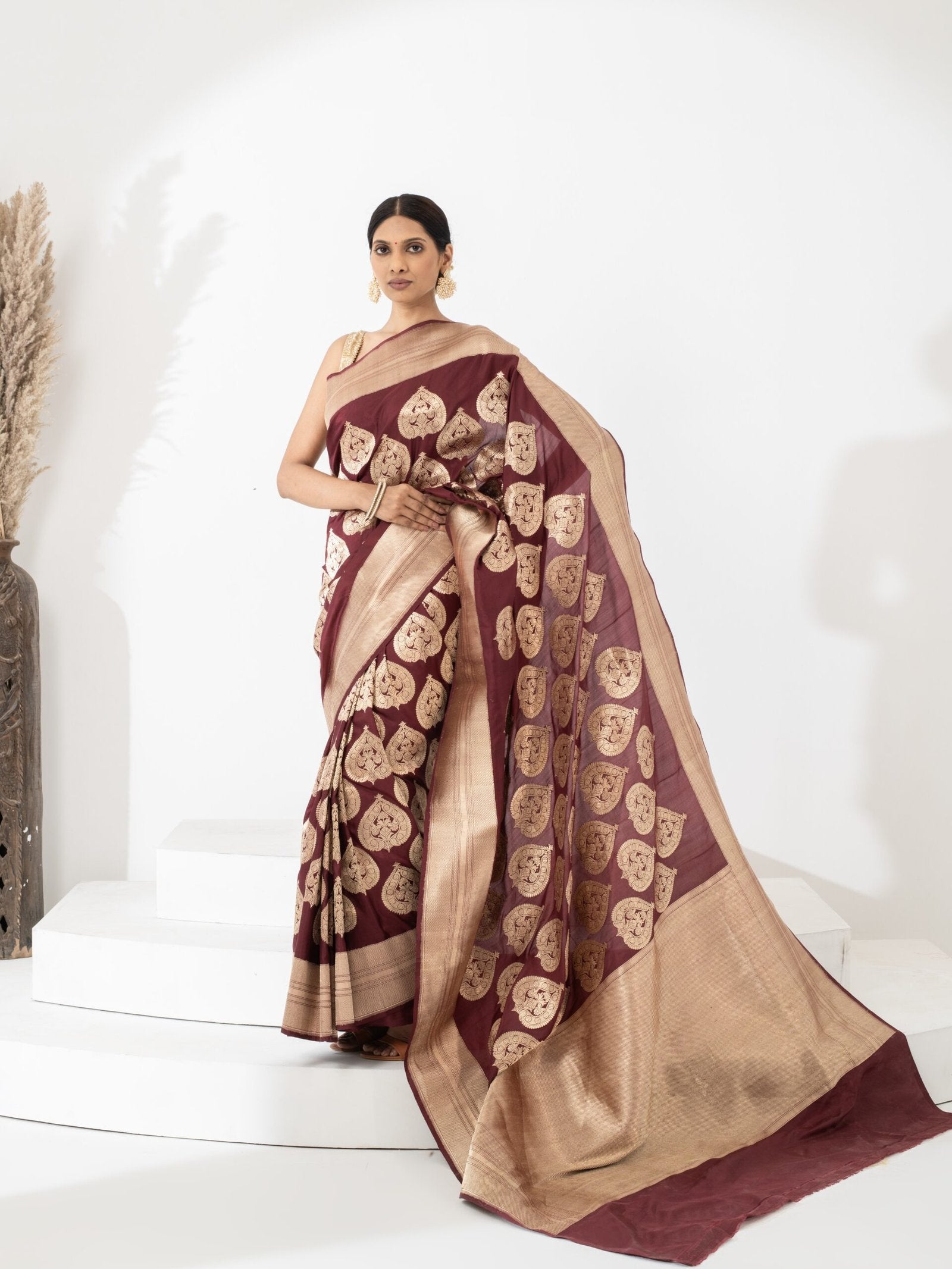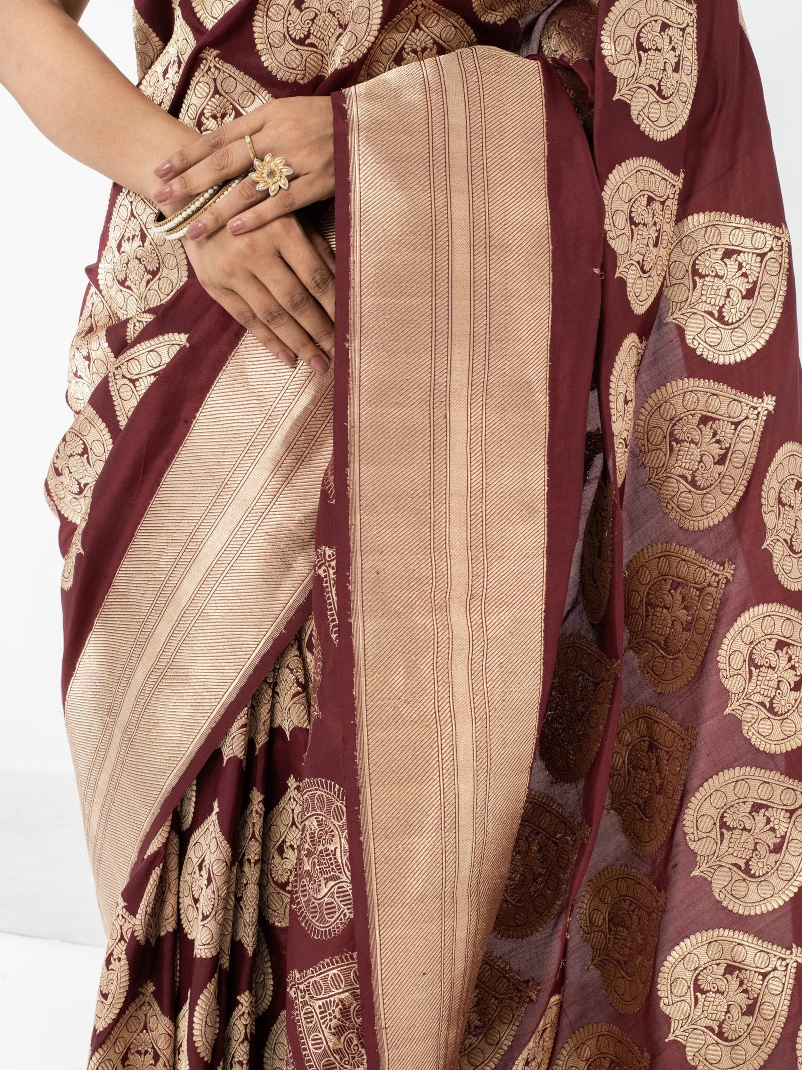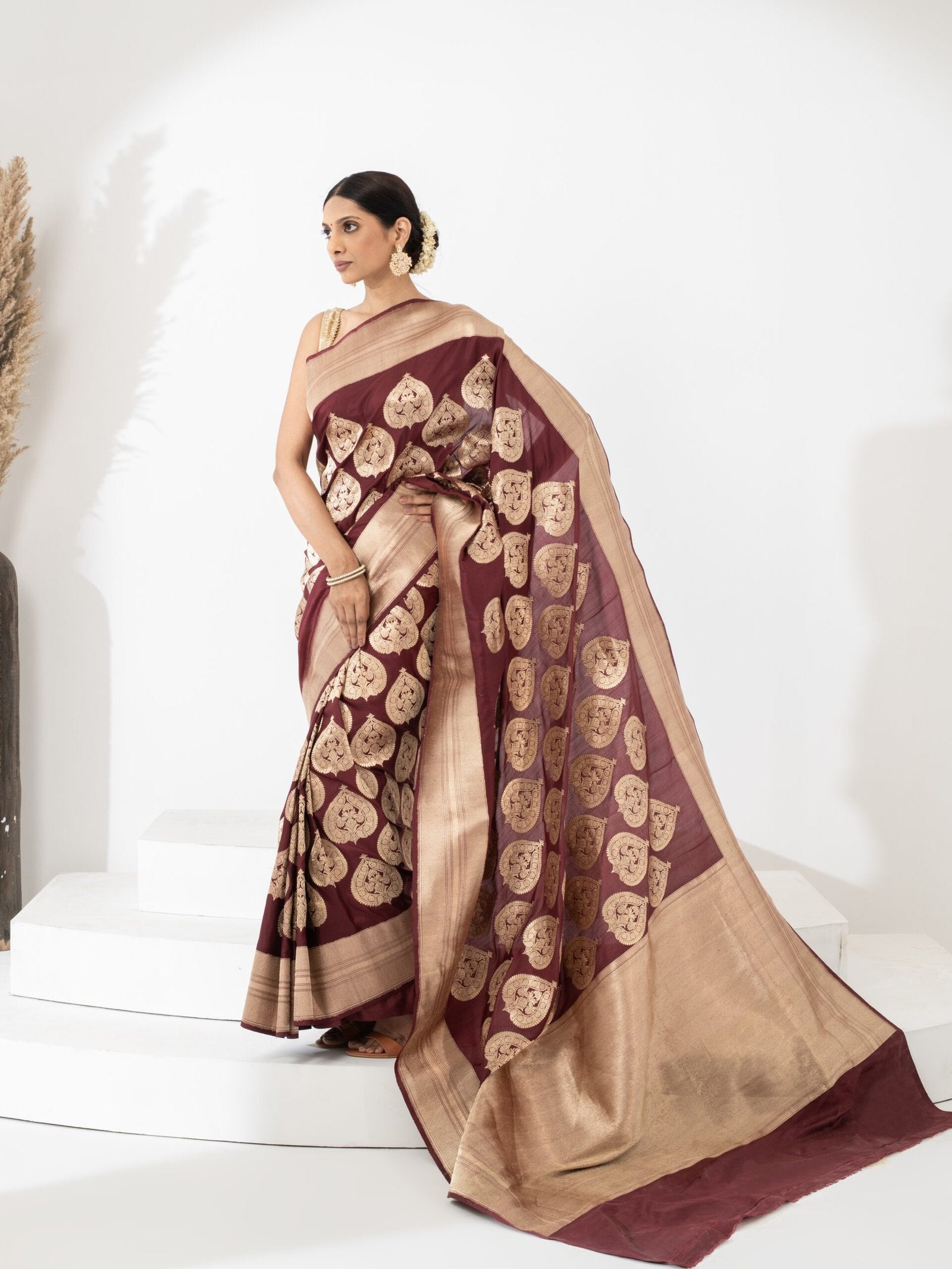 Pair it with a minimal gold blouse and traditional temple jewellery to enhance its royal tone.
