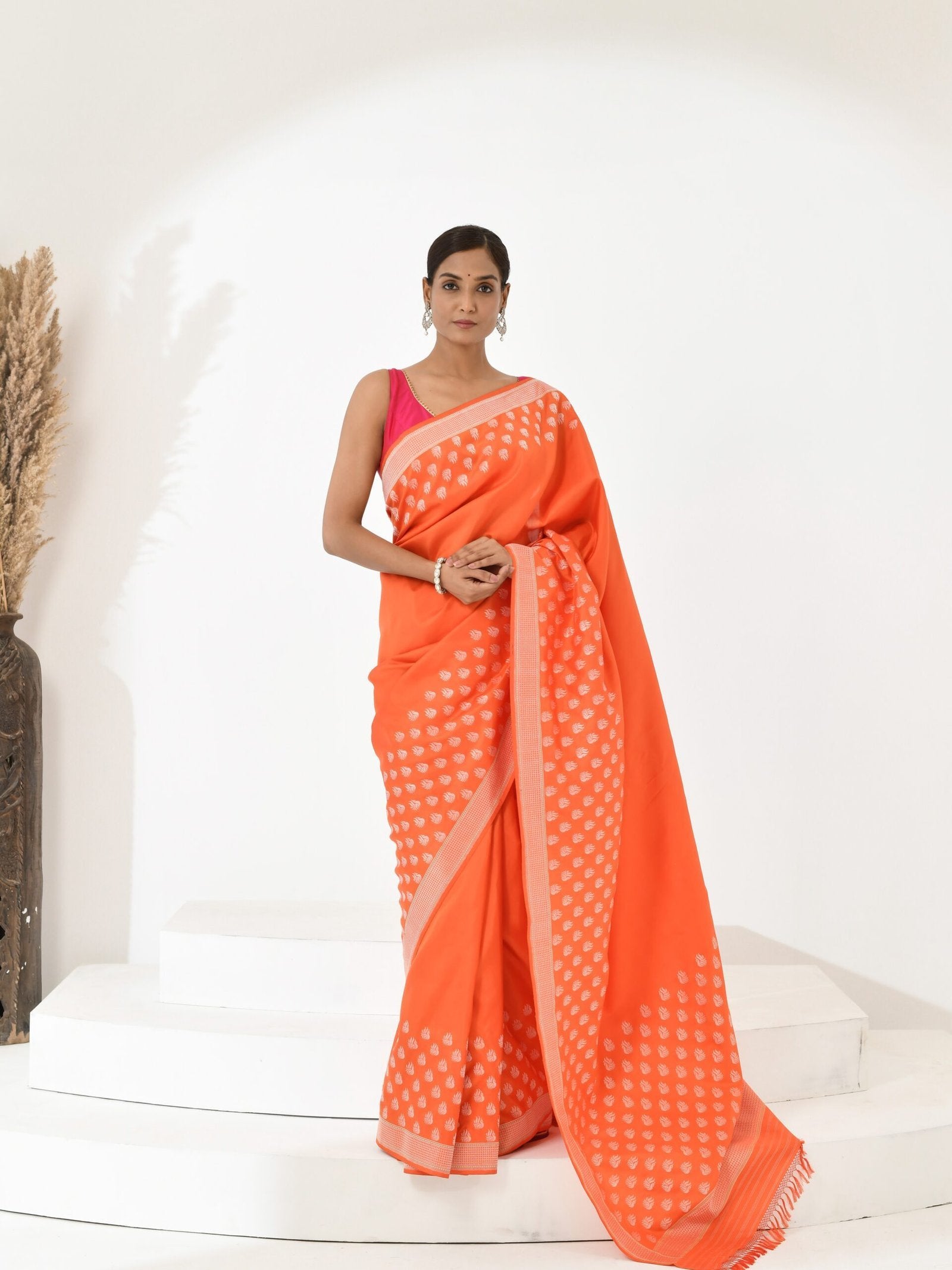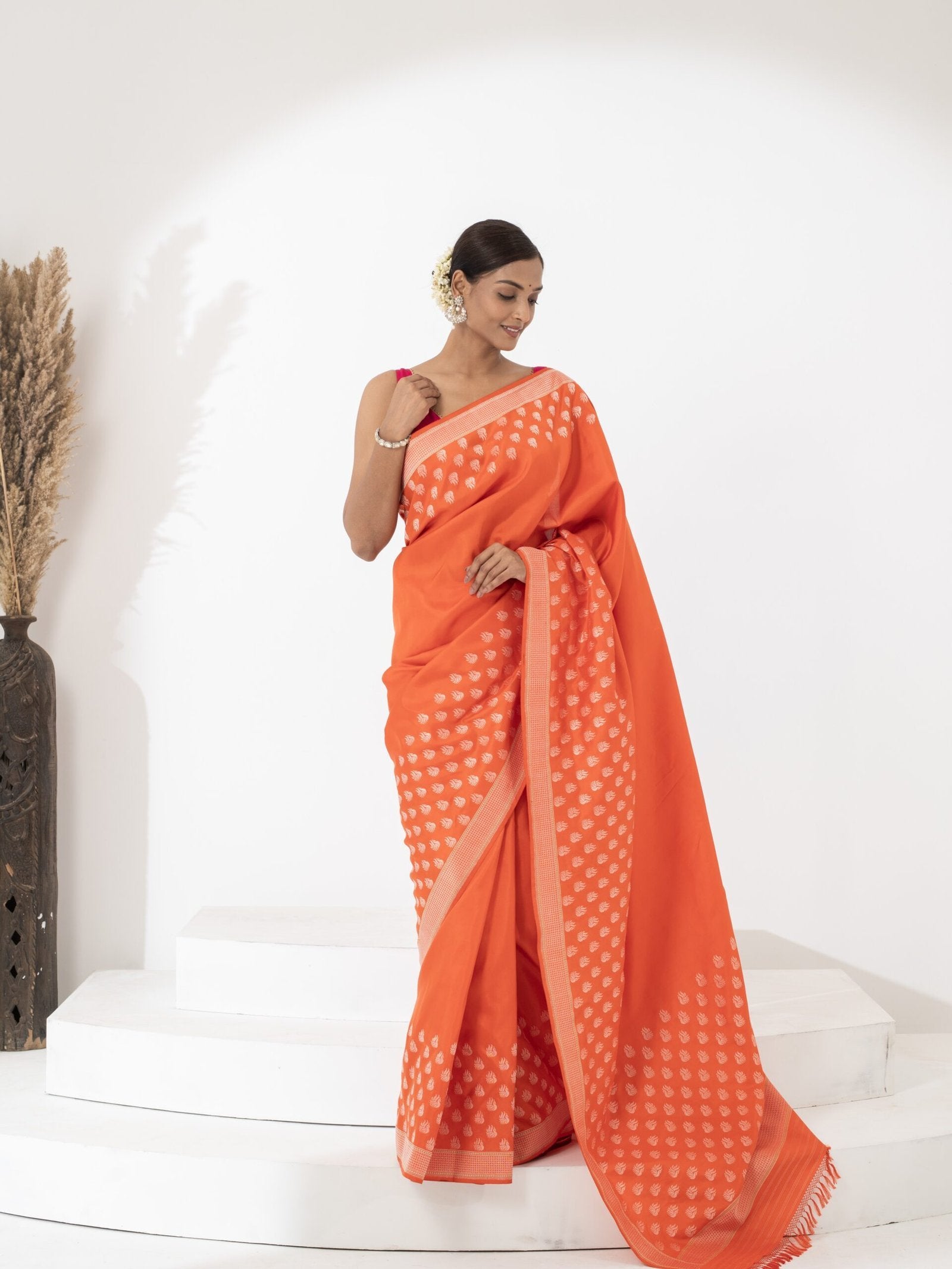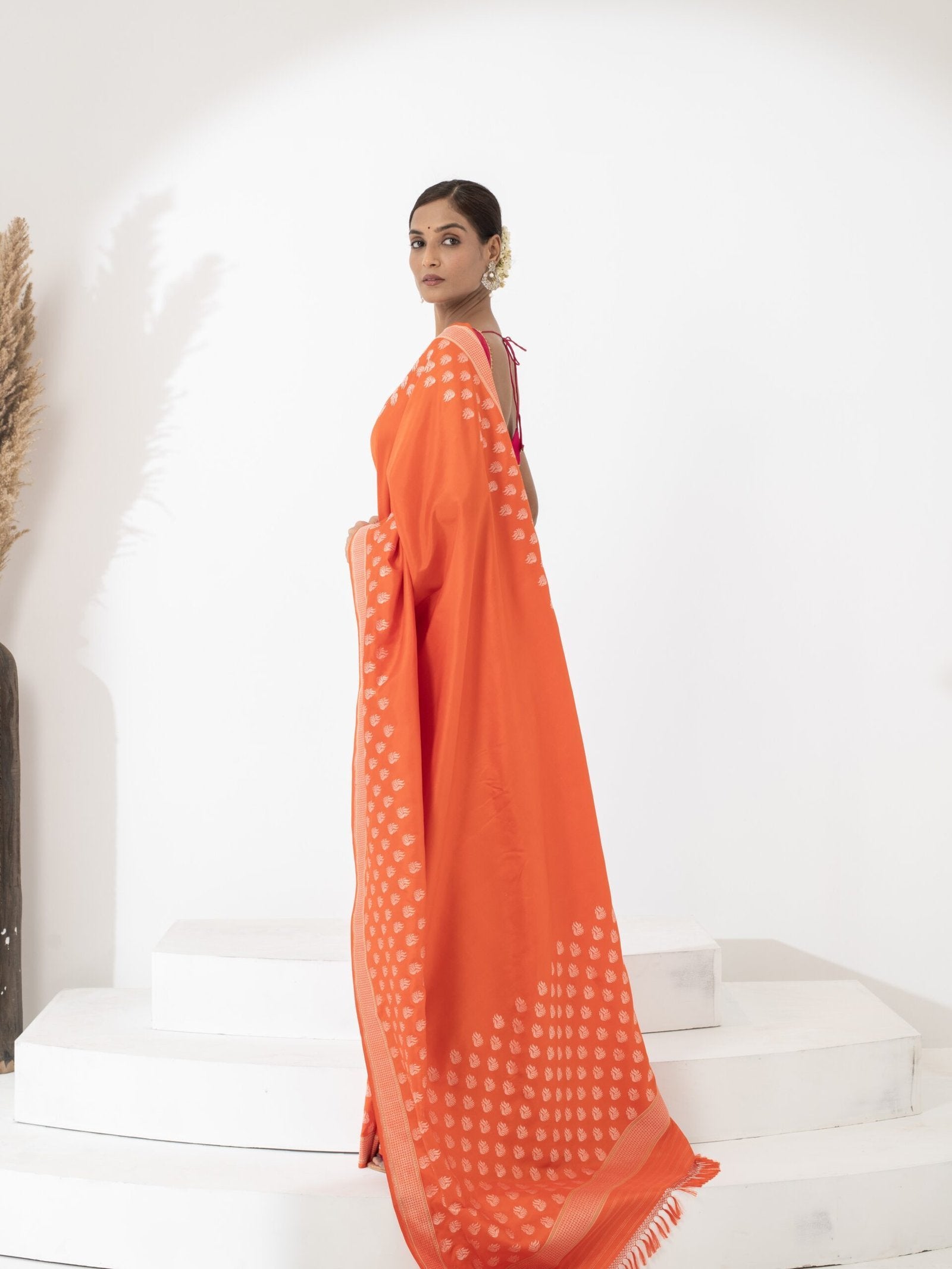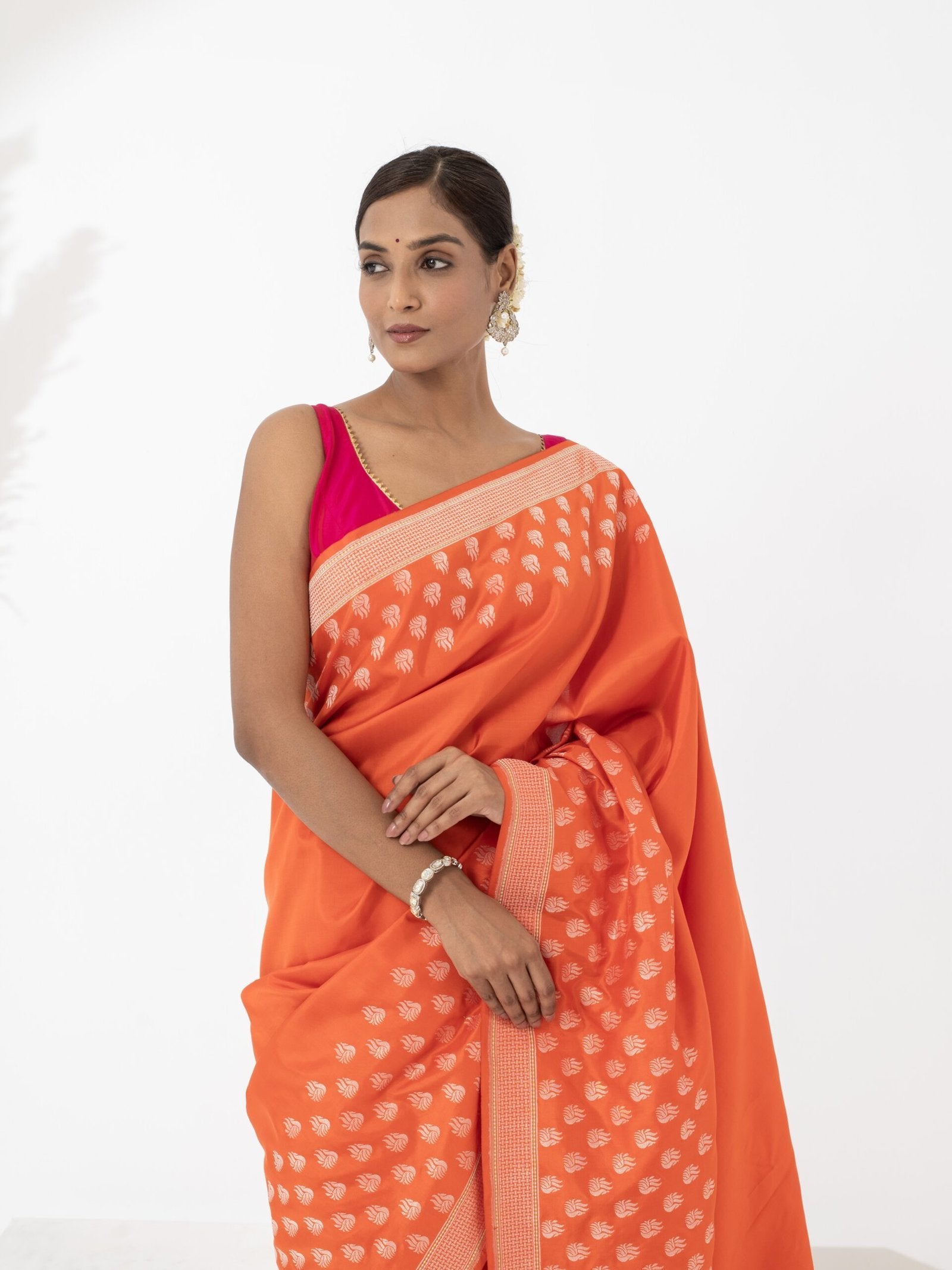 The radiant orange hue of the saree exudes festive brilliance while maintaining an air of classic sophistication. Paired with a contrasting blouse, the ensemble captures attention through its perfect blend of rich texture and bold color-play. The smooth finish of the silk along with the delicate detailing in the weave elevates the look, making it ideal for cultural occasions, poojas, weddings, and festive get-togethers.