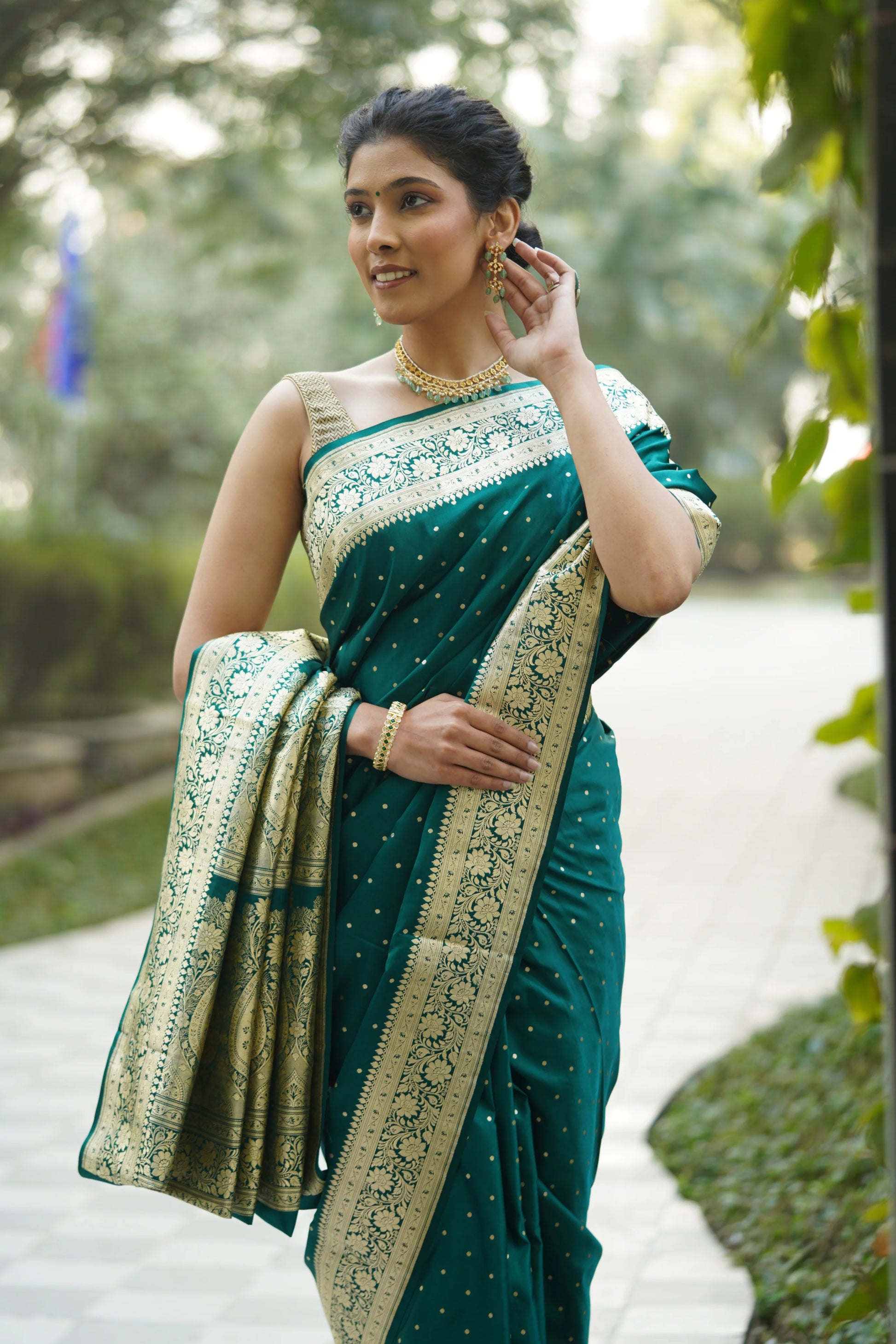 Woven in lustrous Satin Banarasi silk, the fabric carries a smooth, rich sheen that enhances the depth of its elegant Rama Green hue. Delicate zari booties are thoughtfully scattered across the body, inspired by age-old Banarasi design vocabulary. These intricate motifs add rhythm and charm to the weave, while the vintage-inspired zari border and opulent pallu showcase traditional patterns reminiscent of heirloom textiles.