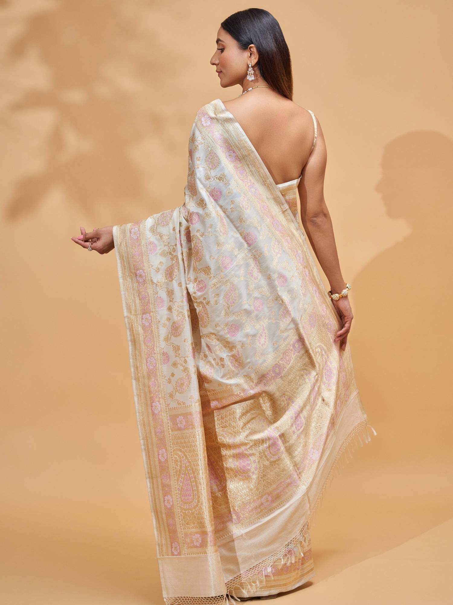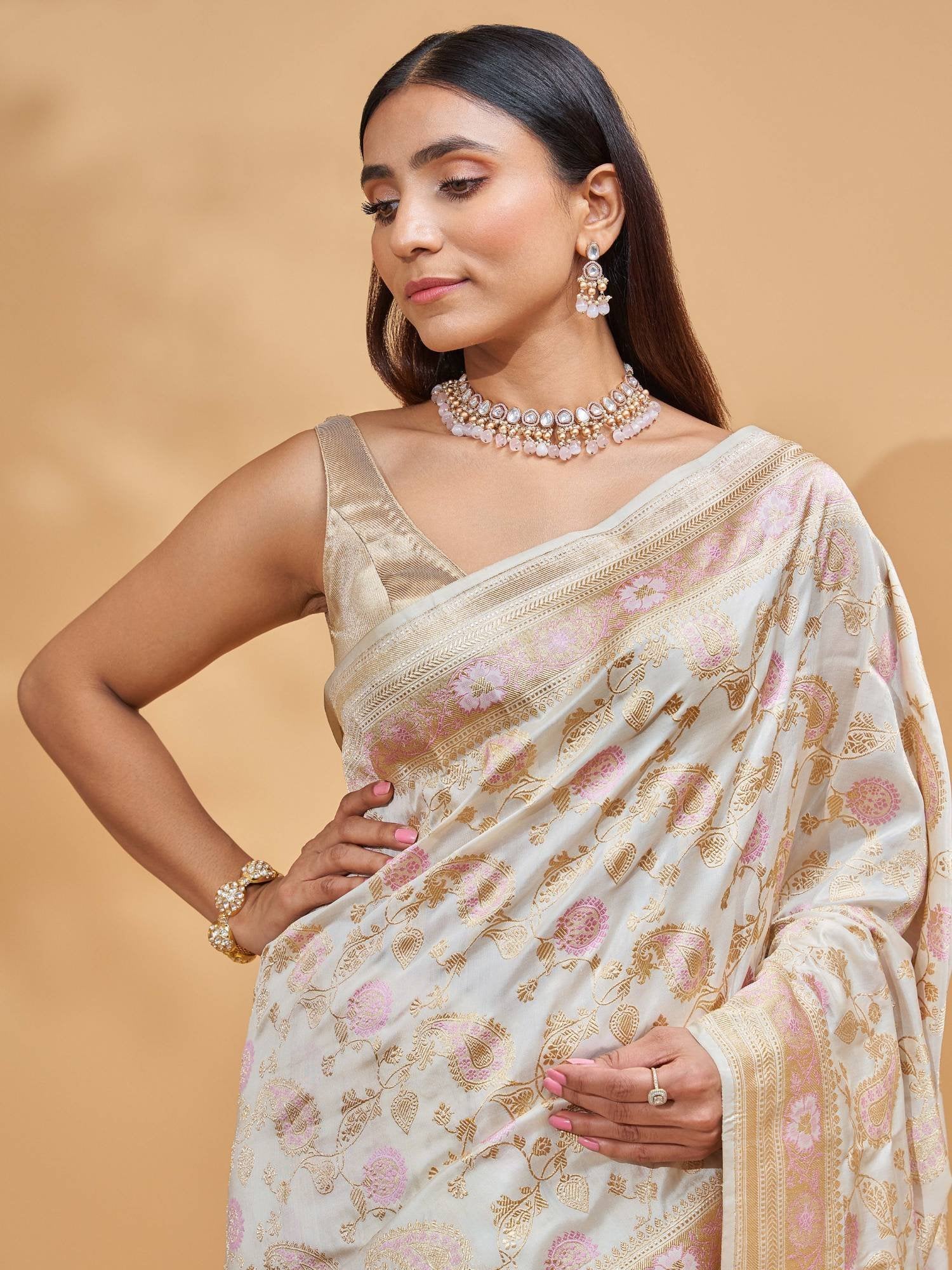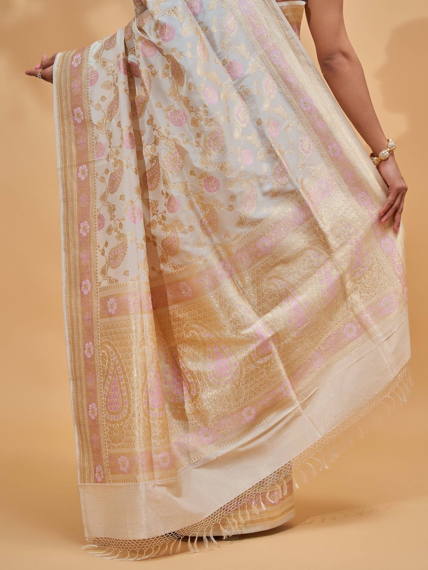 Immerse yourself in the timeless grandeur of Ishani (Pristine White Kadwa Saree) – a masterpiece that embodies the soul of Banaras in every thread. Handwoven in the intricate Kadua weave, this heirloom-worthy drape brings forth the classic opulence of Banarasi textiles in a pristine white palette. The delicate play of pink Meenakari detailing across the Jangla pattern lends a soft whisper of color to an otherwise ethereal saree, adding an understated charm that appeals to connoisseurs of traditional handlooms.