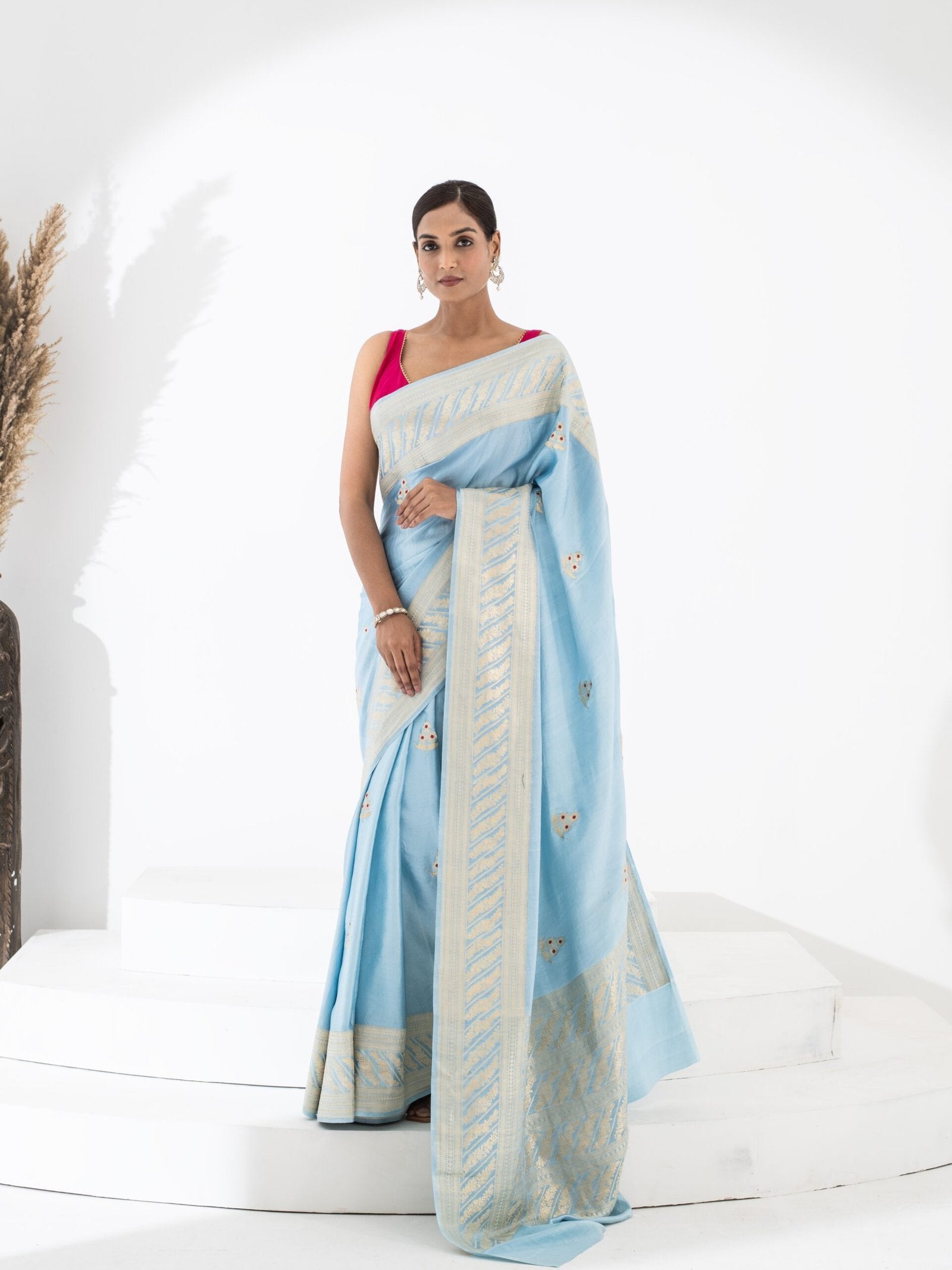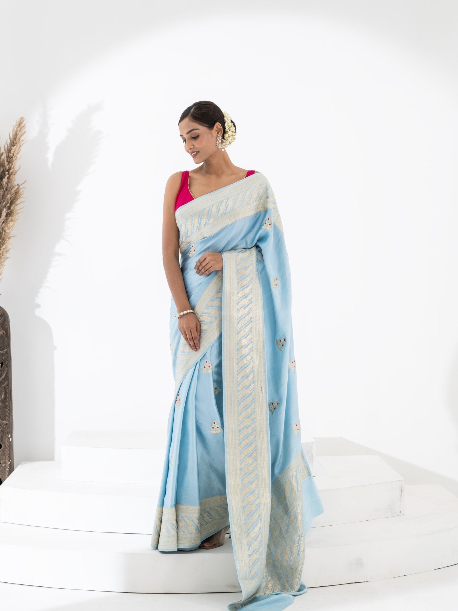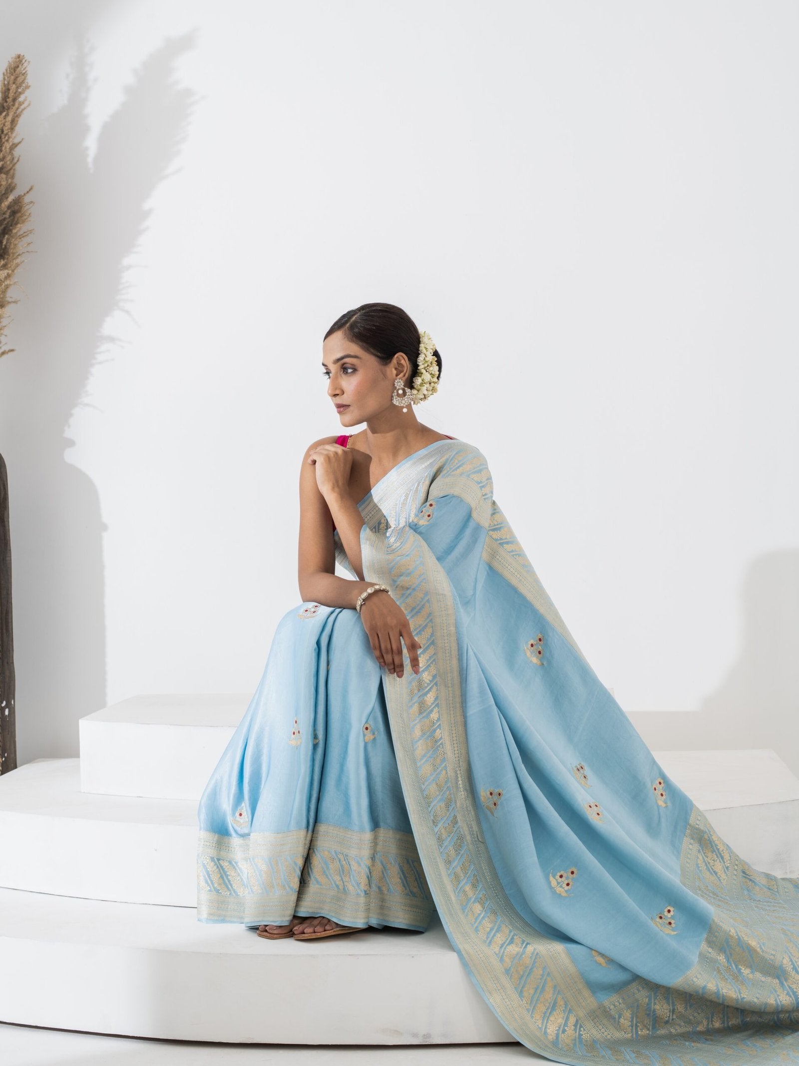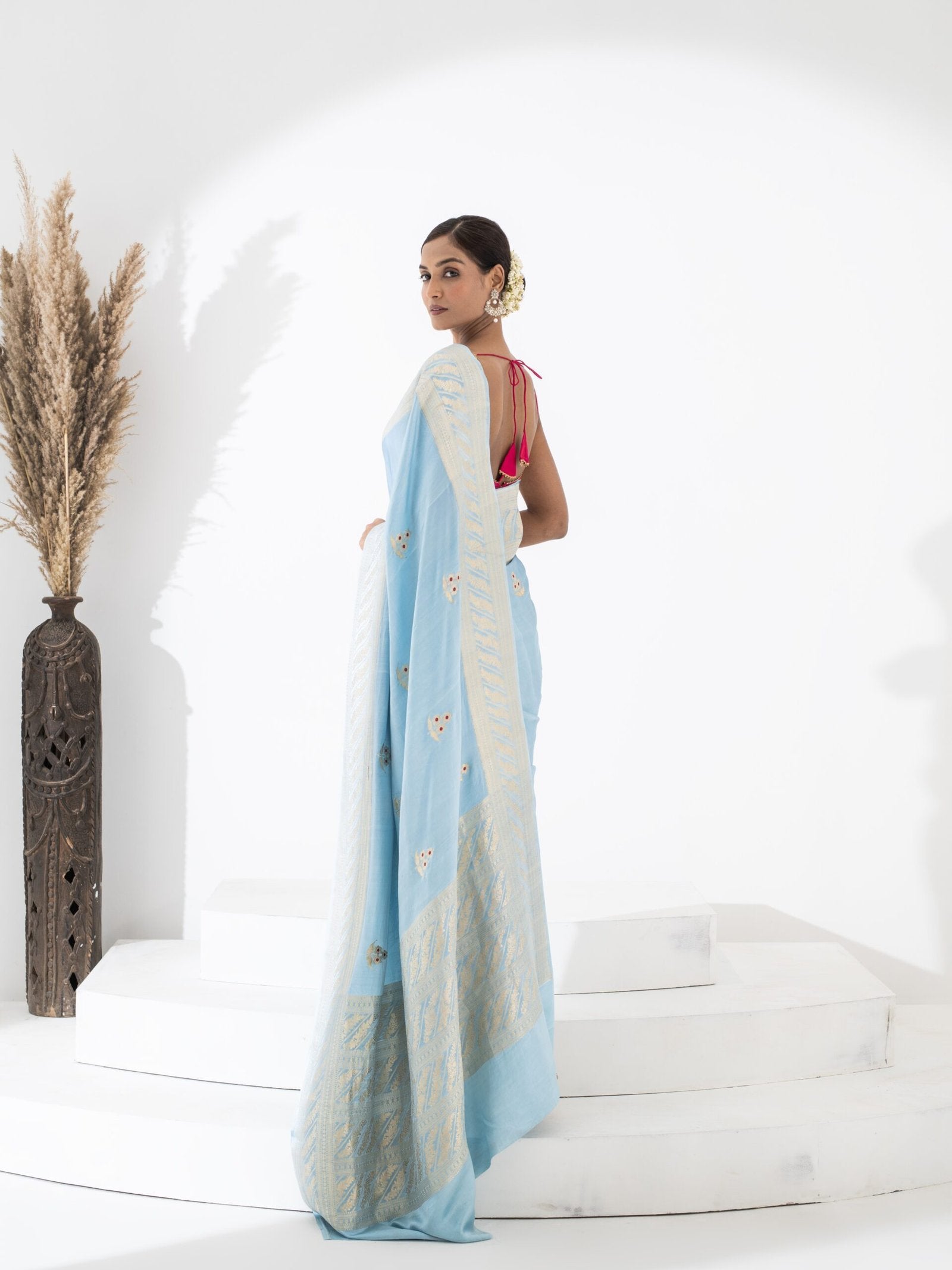 The defining highlight of this saree is its traditional Kadwa weave — a labor-intensive and time-honored weaving technique from Banaras, known for its durability and refinement. Set against a royal blue base, the lustrous Mushru silk offers a smooth, glossy texture on the outside and soft comfort on the inside. Traditionally woven for nobility, Mushru silk is a unique blend of cotton and silk, giving it a rich yet breathable feel.