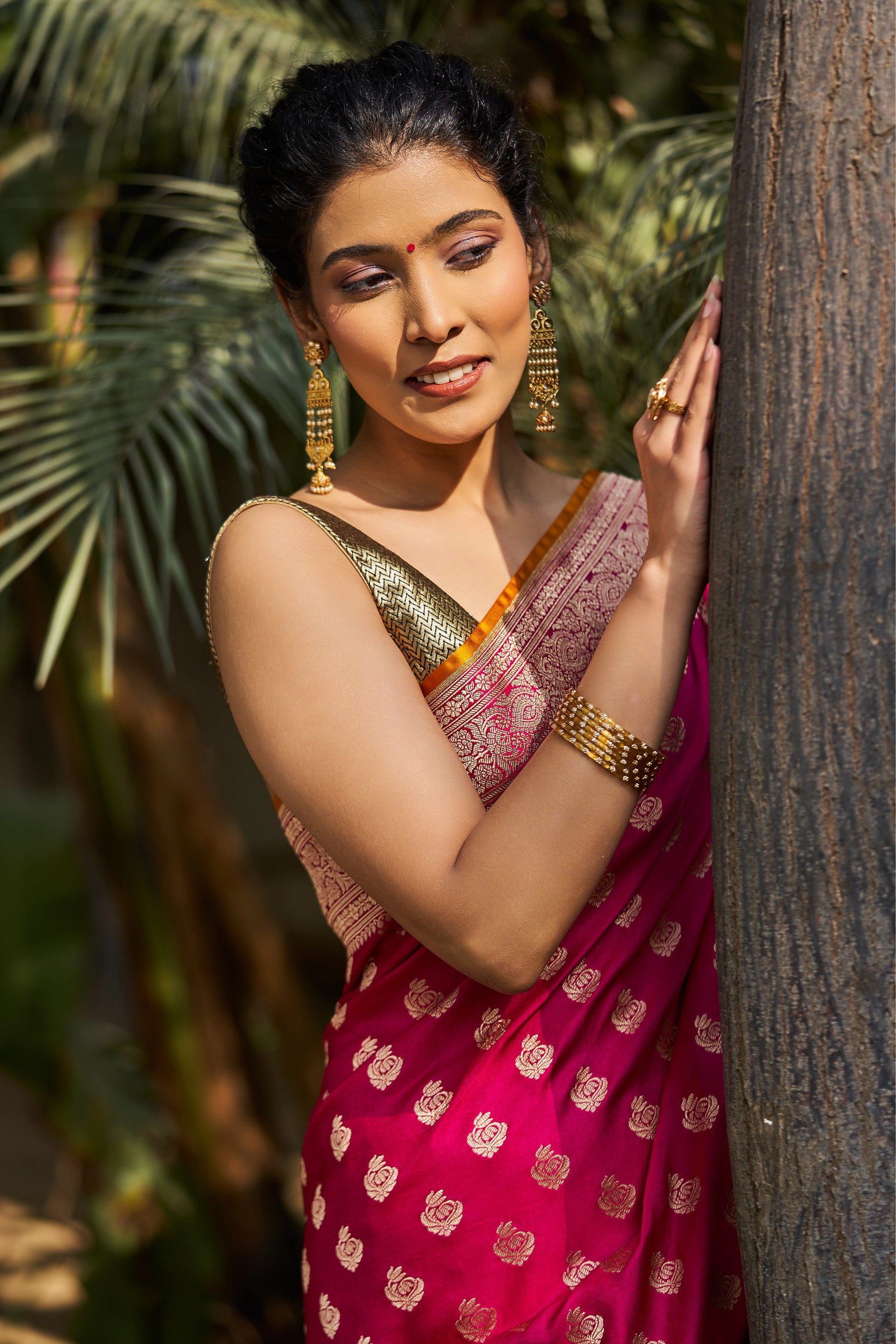 The evenly woven booties add subtle texture and depth, enhancing the saree’s elegance without overpowering its design. Perfect for weddings, festive gatherings, receptions, and traditional celebrations, this saree beautifully blends heritage artistry with contemporary grace.