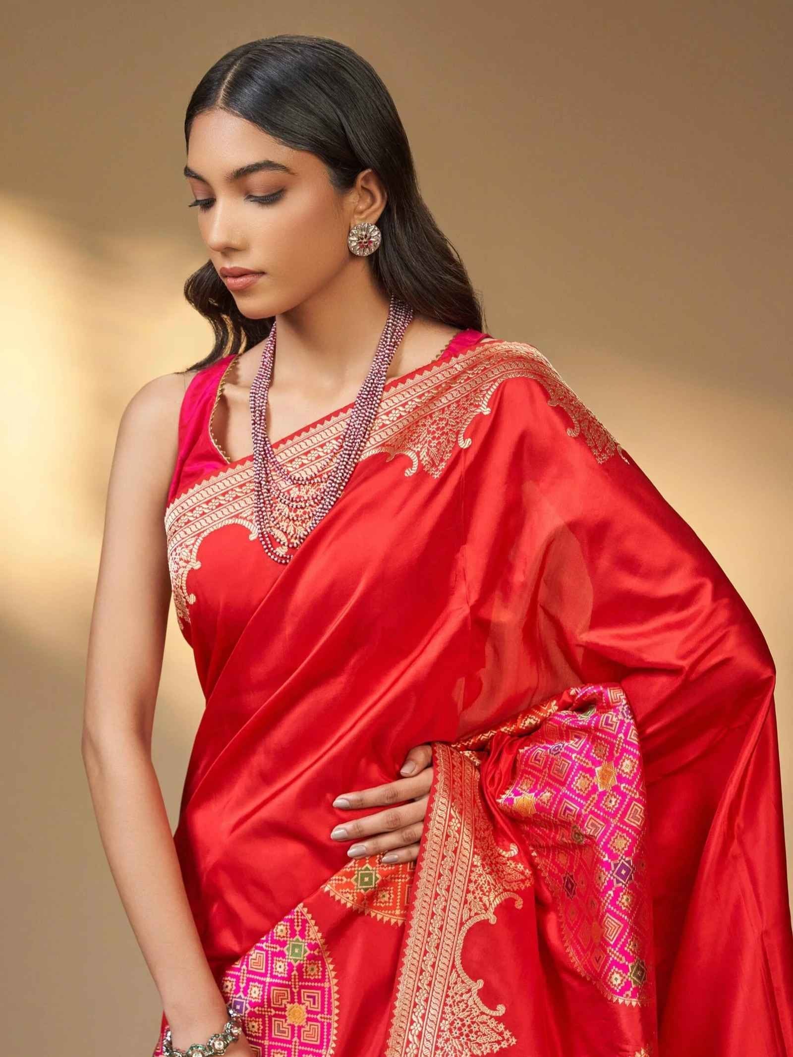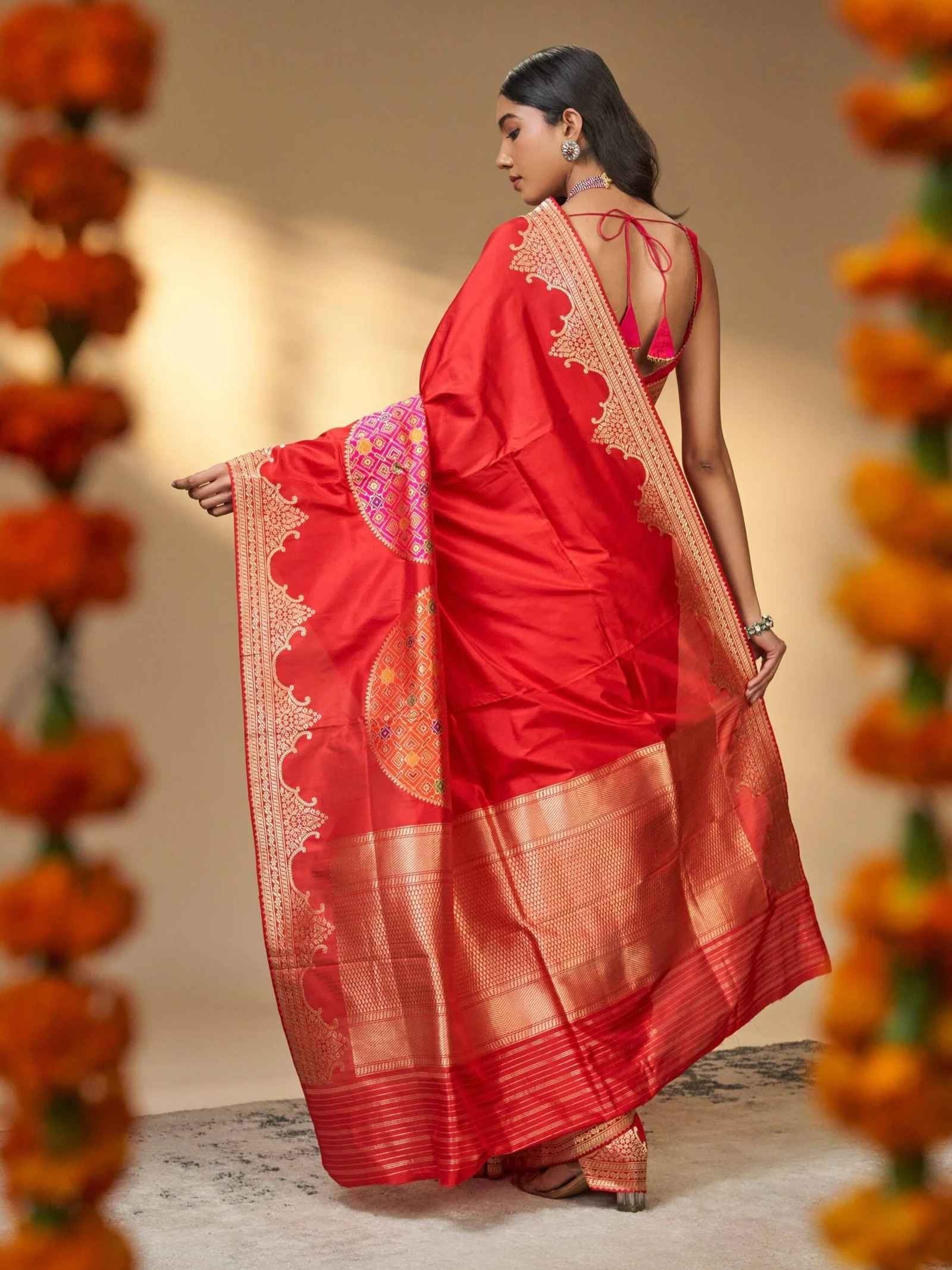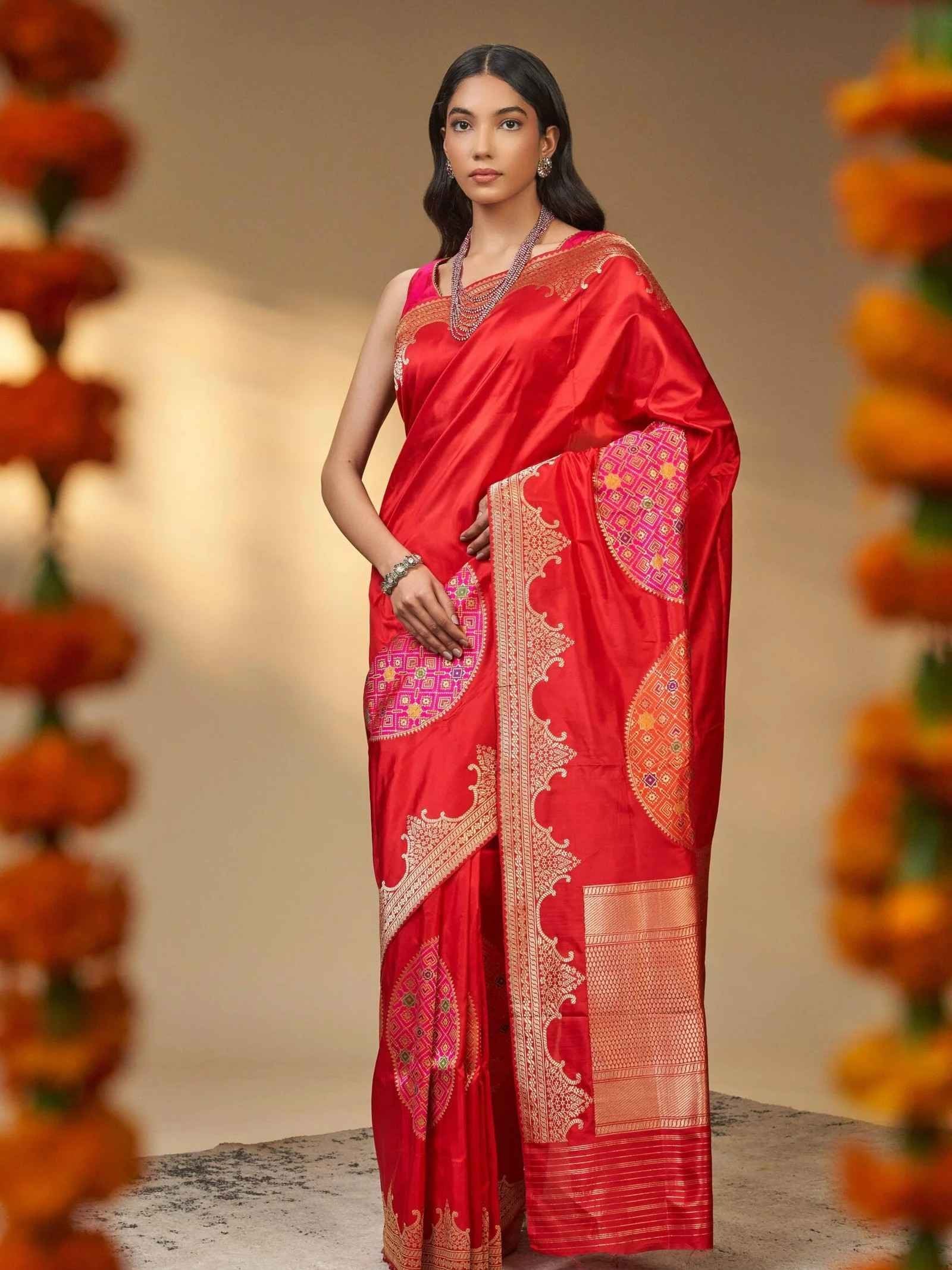 The deep red hue of the saree radiates warmth and auspiciousness, making it an ideal choice for weddings, traditional functions, and festive occasions. But what adds a unique visual charm is its skirt border, adorned with exquisite motifs inspired by the age-old Patola weaving tradition. These Patola-inspired designs create a striking contrast, making the saree both visually dramatic and deeply rooted in cultural symbolism.