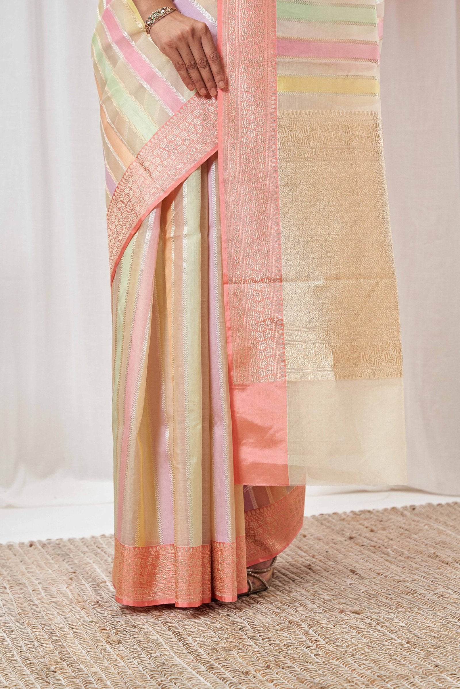 A delicate play of soft pastel hues, this Kora Banarasi Saree is woven in the traditional Rangkat style, showcasing seamless transitions of colors that embody timeless elegance. The drape is beautifully accentuated with a pink border and pallu, adding a graceful contrast to its airy texture.