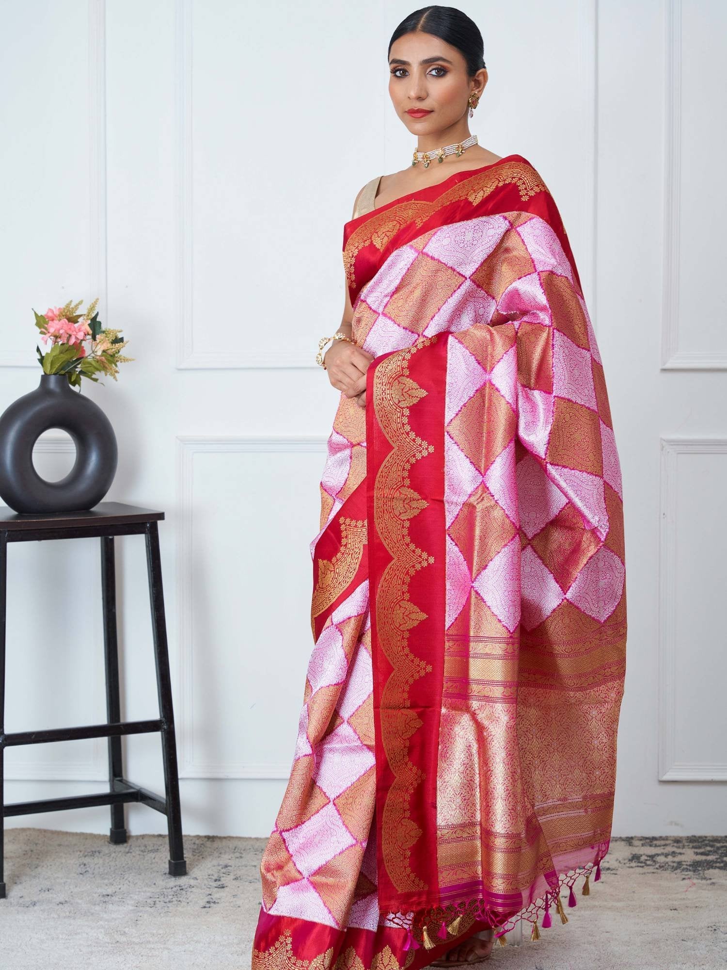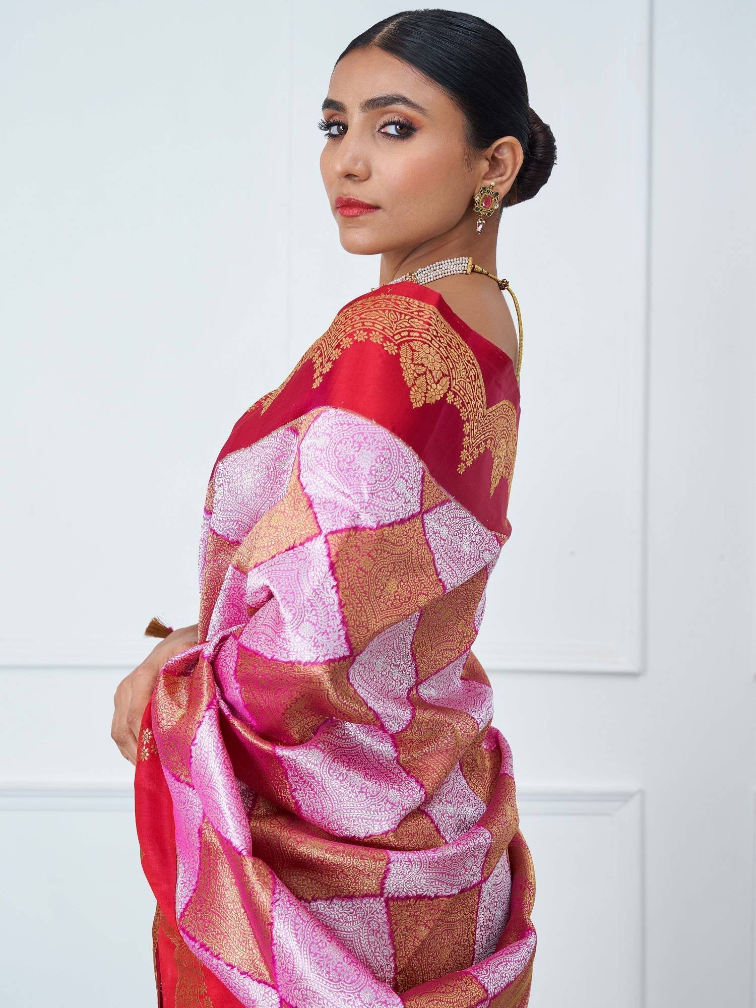 The soothing blend of pink and red hues is both festive and feminine, while the scallop-style satin silk borders add a graceful frame, creating a saree that’s subtle in its grandeur and detailed in its craftsmanship. Whether worn for a wedding, a traditional ceremony, or a grand festive gathering, Lavanya speaks the language of culture with grace and sophistication.