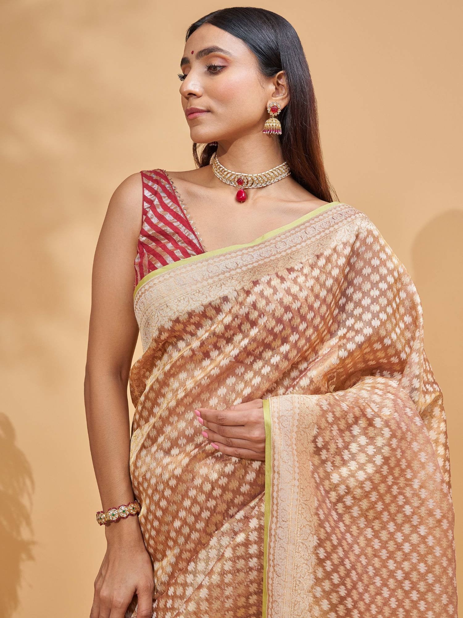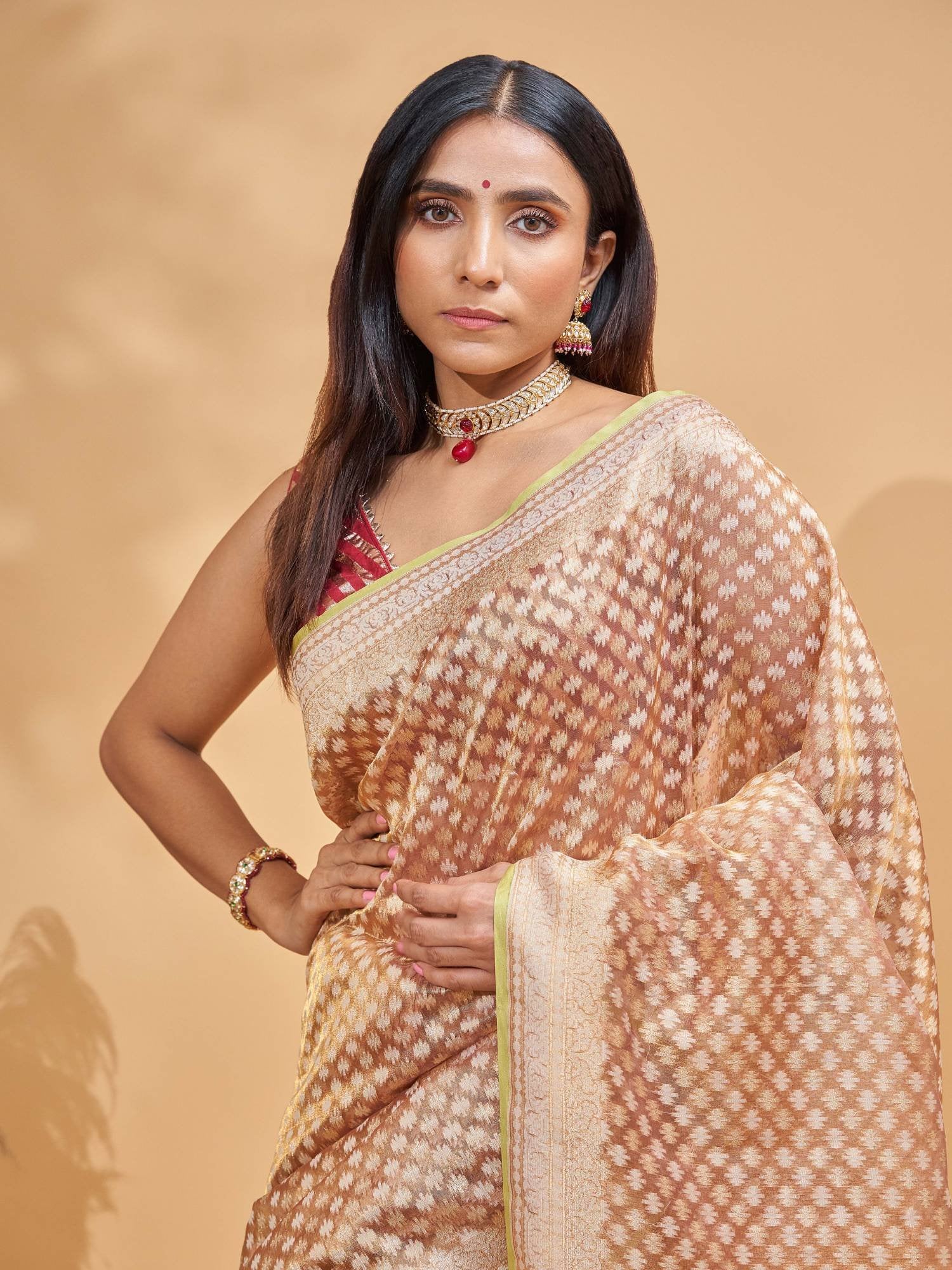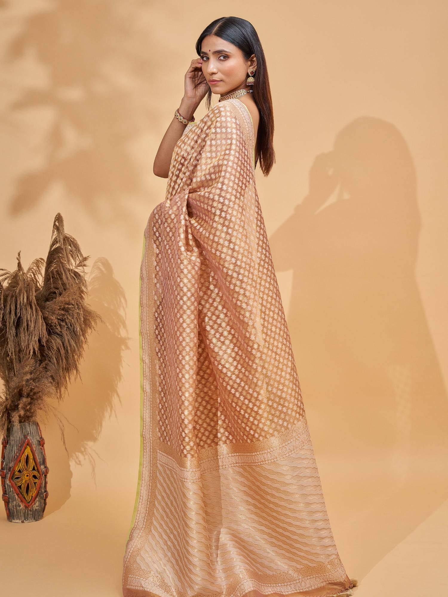 The soft peachish-gold hue gives a gentle luminosity to the saree, making it ideal for those seeking understated elegance. The saree is adorned with intricately handwoven Sona Zari booties – glinting like golden droplets across the delicate fabric – arranged in a classic pattern that never fades with fashion. The lightweight yet rich texture of the silk tissue drapes effortlessly, making it suitable for all-day traditional wear, festive gatherings, or ceremonial occasions.
