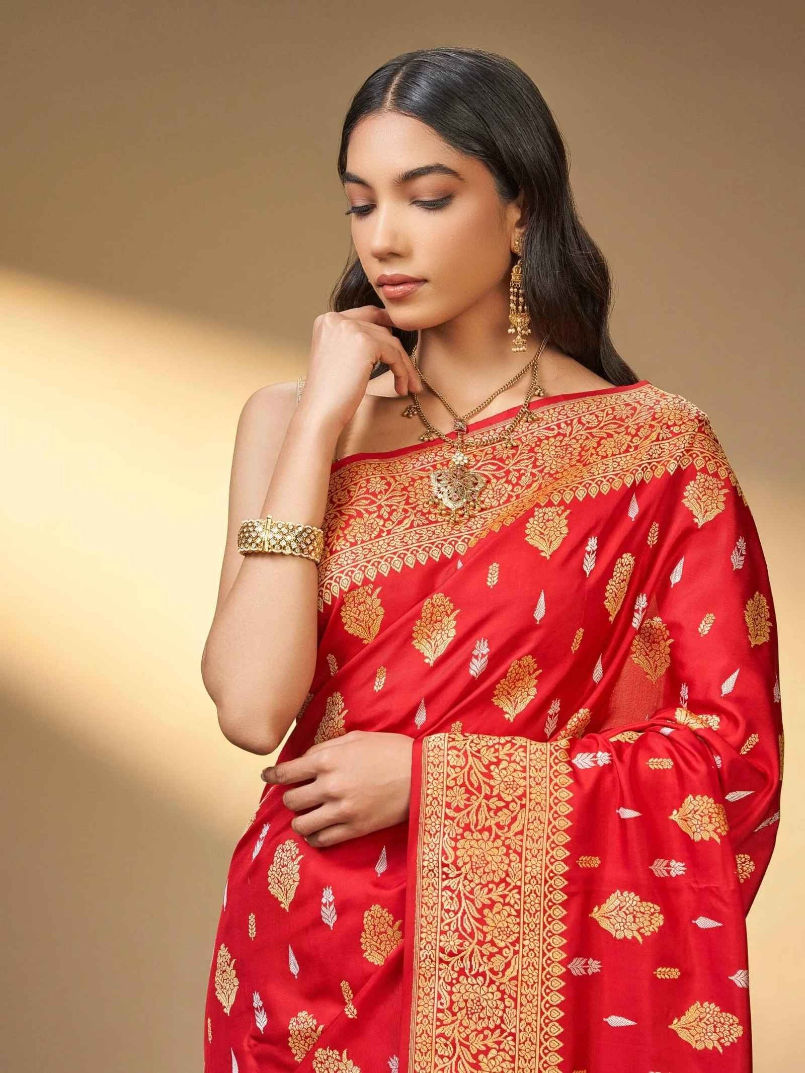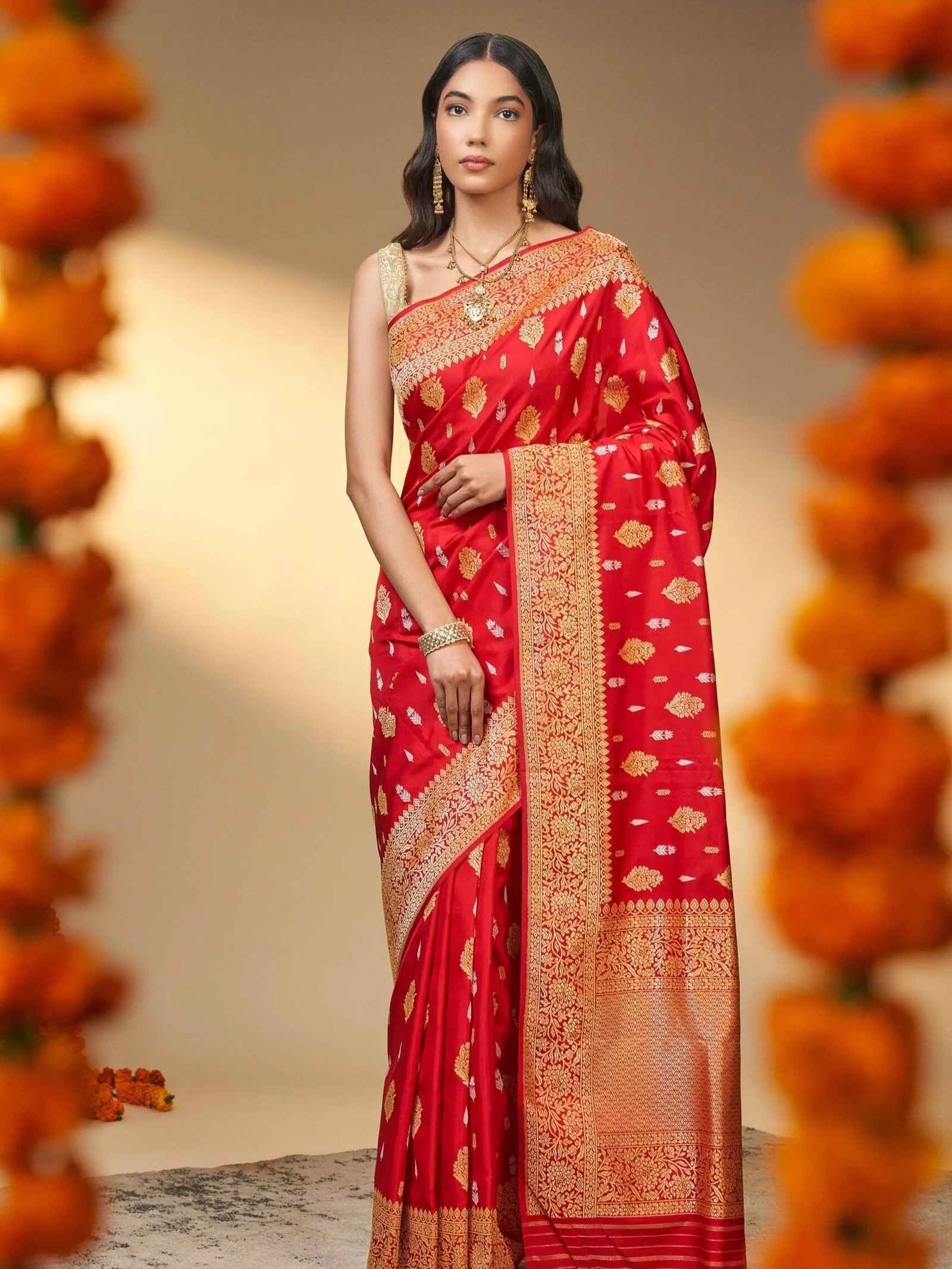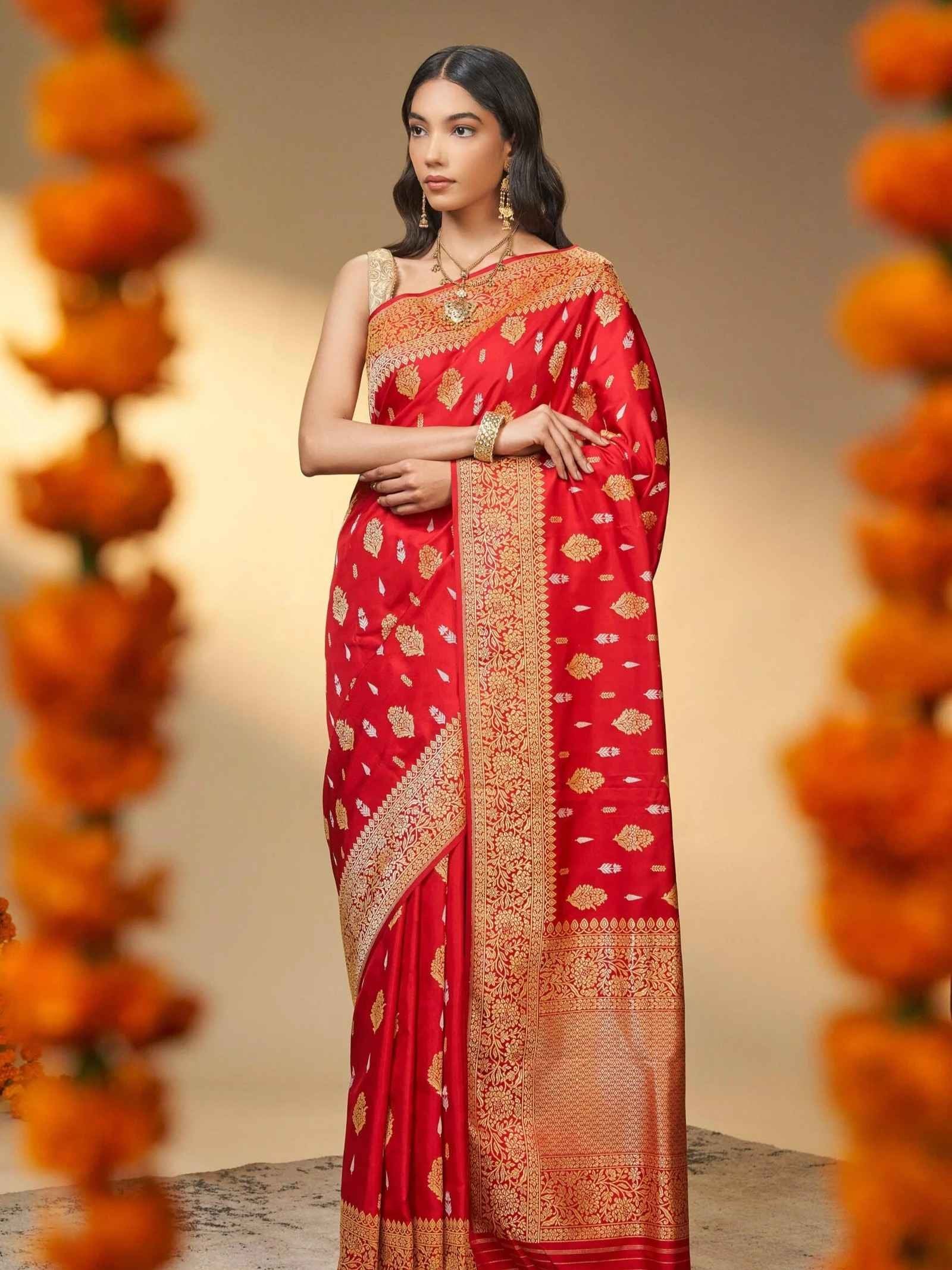 The richness of the red hue adds a classic charm, while the intricate weave and luminous zari motifs make this a versatile heirloom piece. Whether draped at a temple wedding or a formal celebration, Meenakshi promises poise, presence, and legacy.