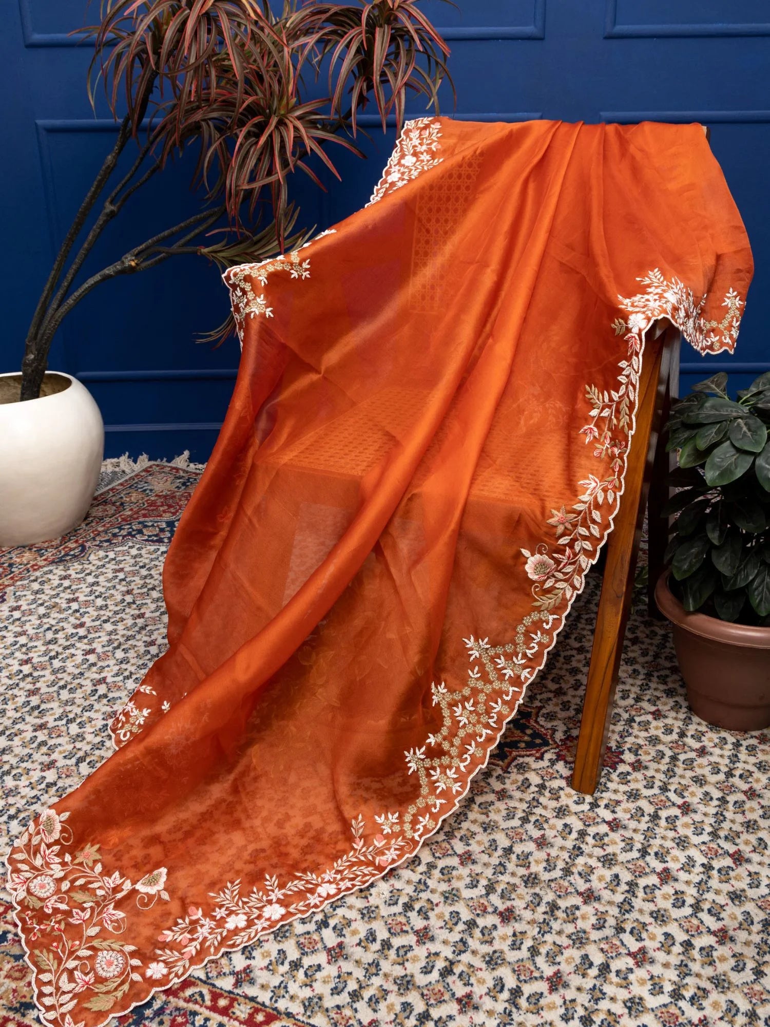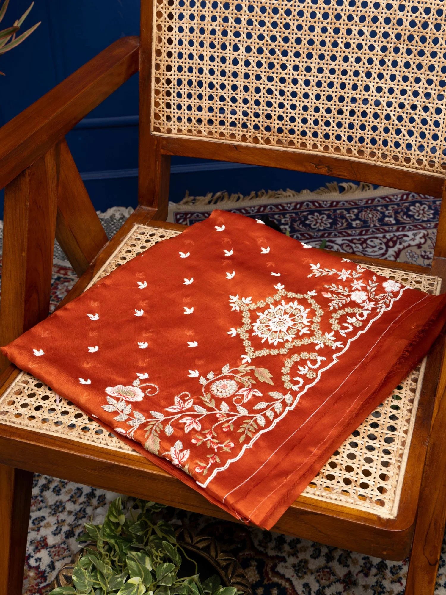 Introducing Naimisha, a timeless three-piece suit set designed for the modern woman who embraces heritage with elegance. Rendered in a captivating burnt orange hue, this suit set is an exquisite blend of grace, craftsmanship, and festive charm—making it the perfect choice for traditional events, family gatherings, and auspicious ceremonies.