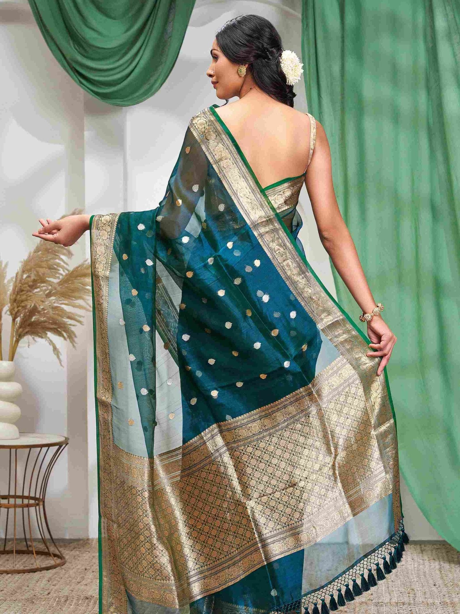 Crafted in luxurious Tissue Kora Silk, this Banarasi drape shimmers with every movement. The transparency of Kora silk combined with the rich texture of tissue weave gives it an ethereal glow, making it a perfect choice for grand occasions, festive rituals, or traditional ceremonies. Woven using the intricate Kadwa technique, every motif is individually crafted, making it more refined and time-intensive than regular weaving methods. The kadwa technique ensures durability and finesse, making the saree a true heirloom piece.
