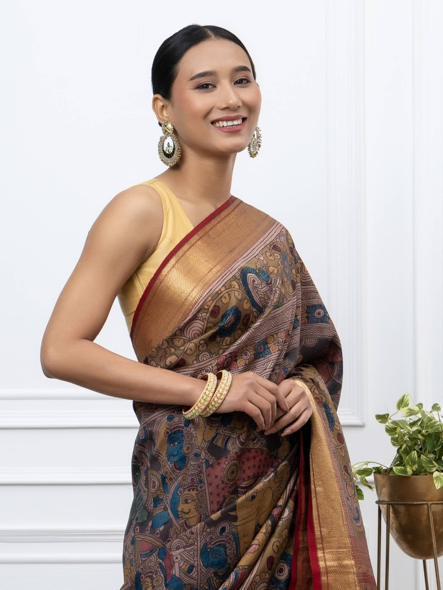 The uniqueness of Ojasvini lies in its miniature-style painting that transforms the saree into a walking canvas of Indian heritage. It’s more than a garment — it’s a piece of collectible art that holds the essence of generations-old handcrafting traditions. Each brushstroke is done by hand using natural dyes and organic elements like ghee and milk, which leave behind a distinctive and authentic fragrance — a true sign of genuine Kalamkari craft.
