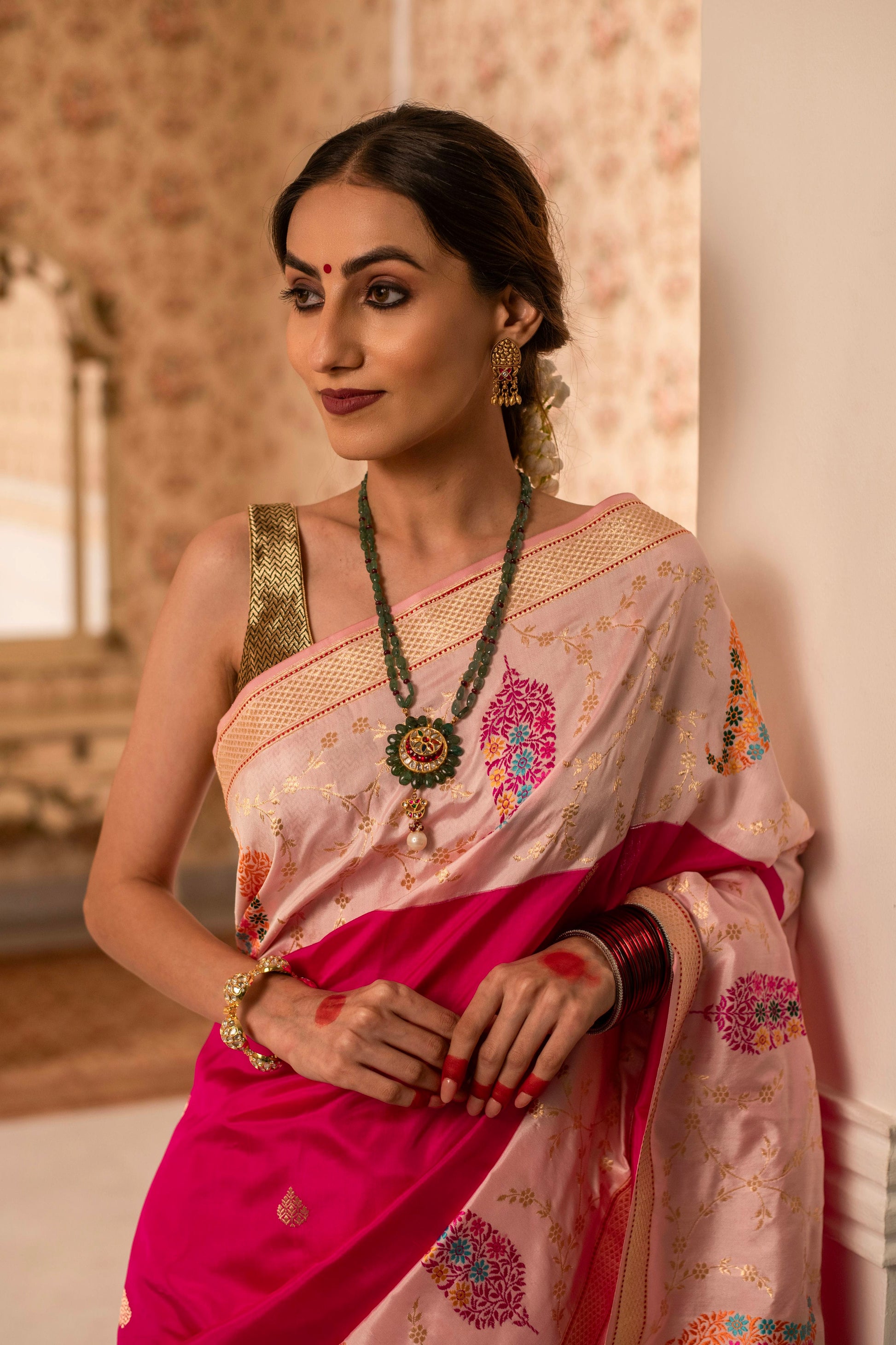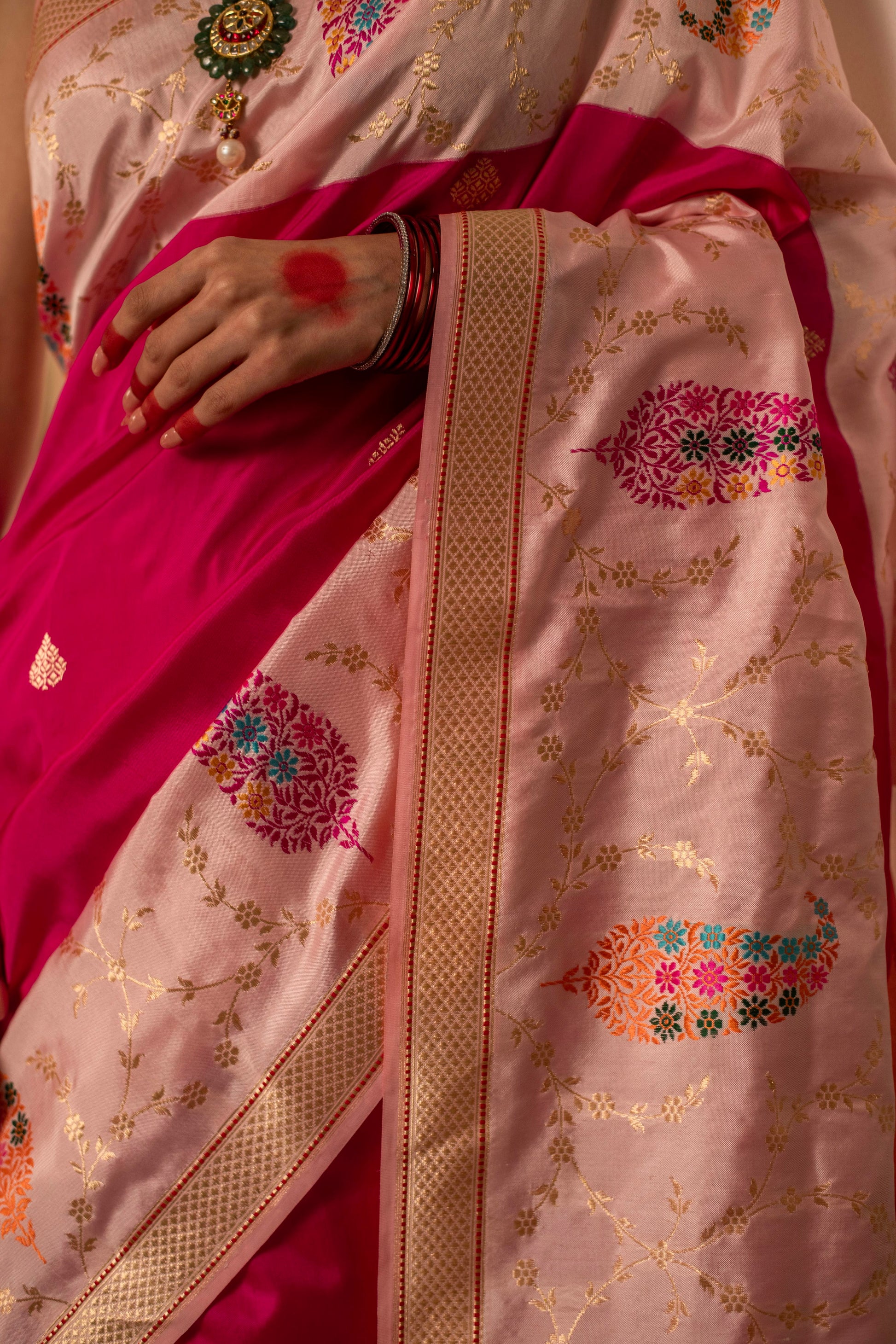 Paithani-Inspired Ektara Banarasi Silk Saree with Dual Contrast Borders and Paisley Bootas