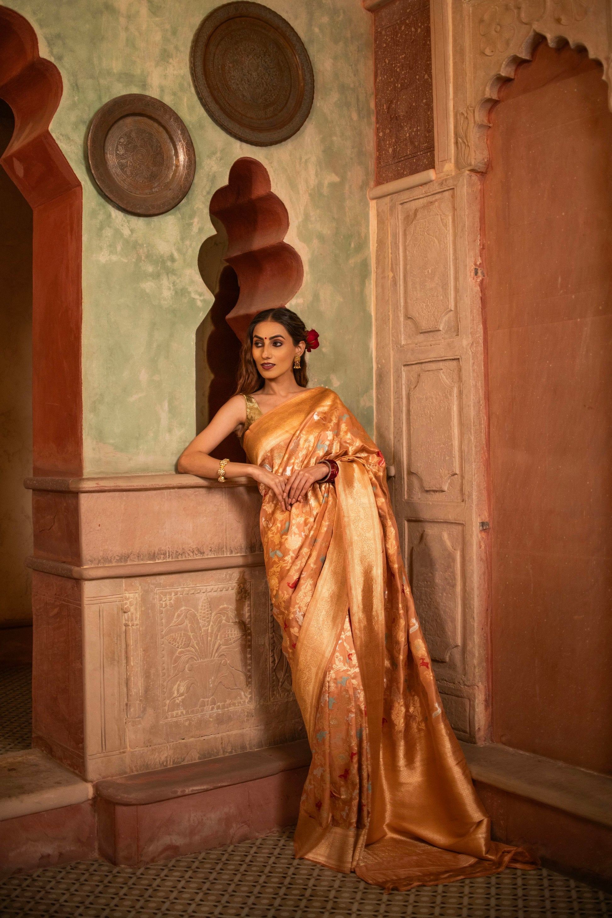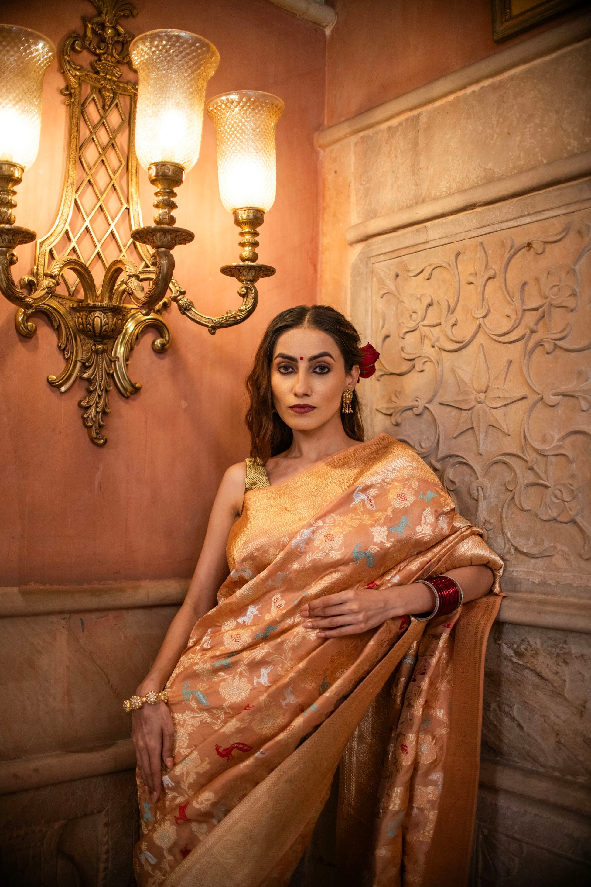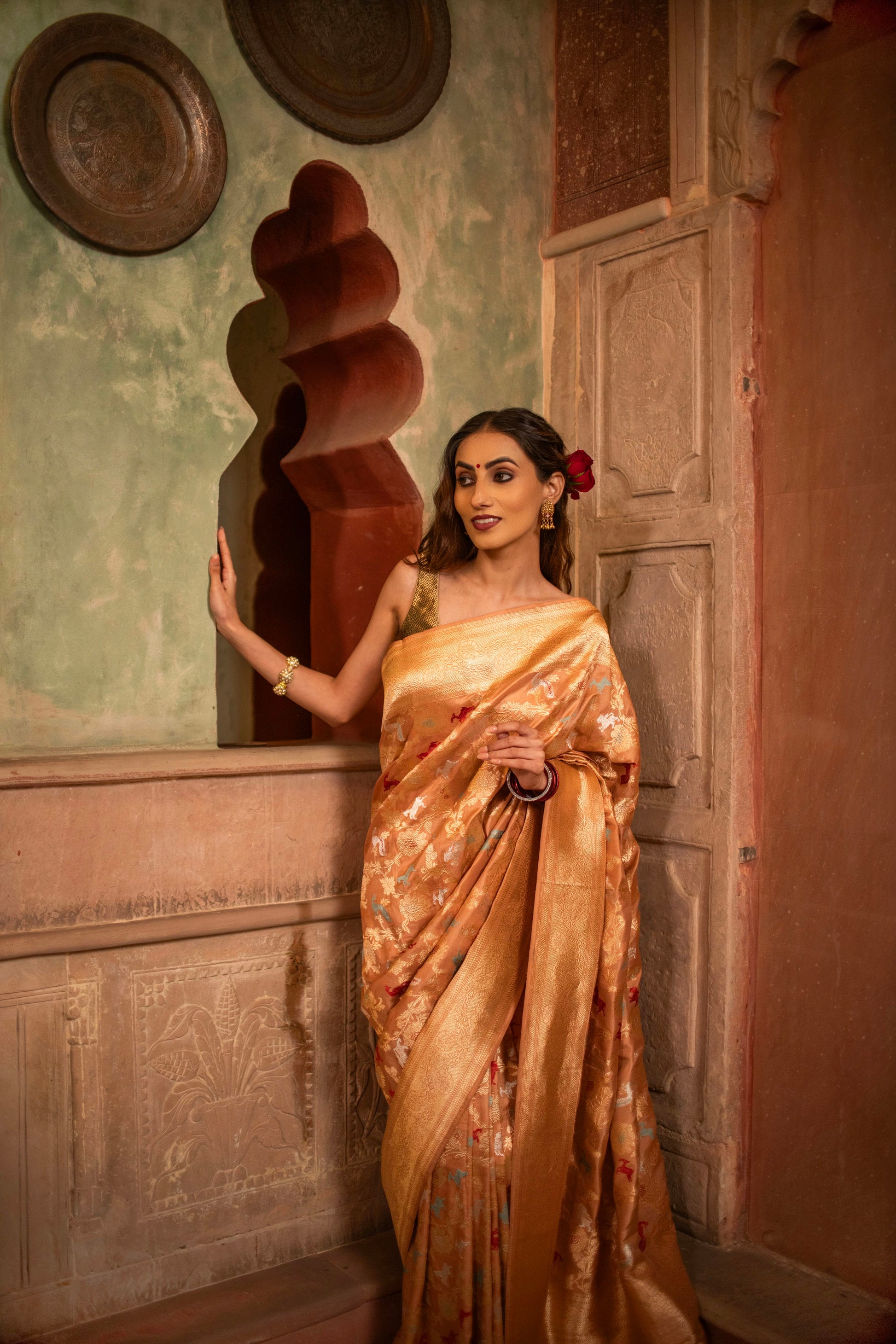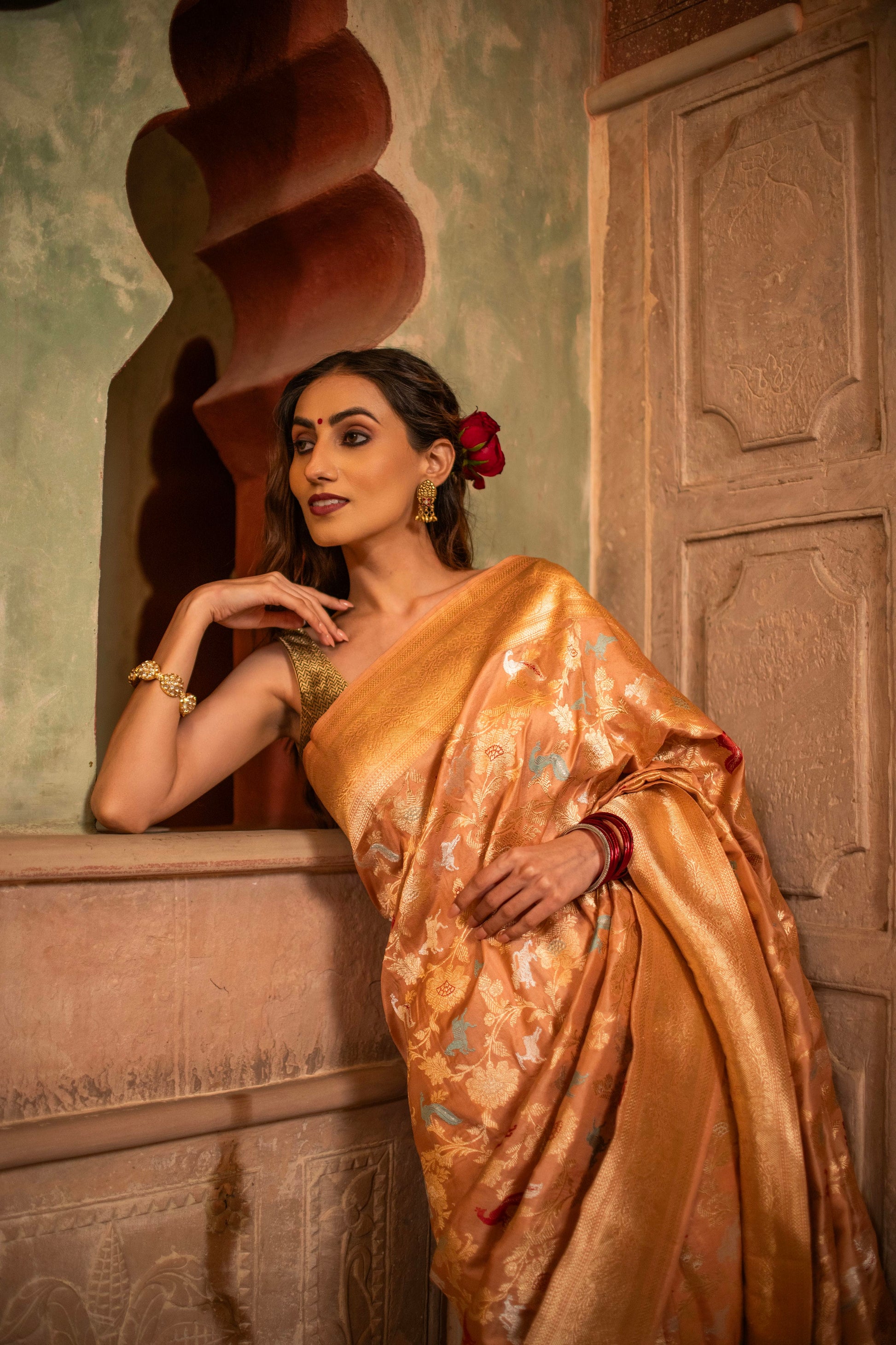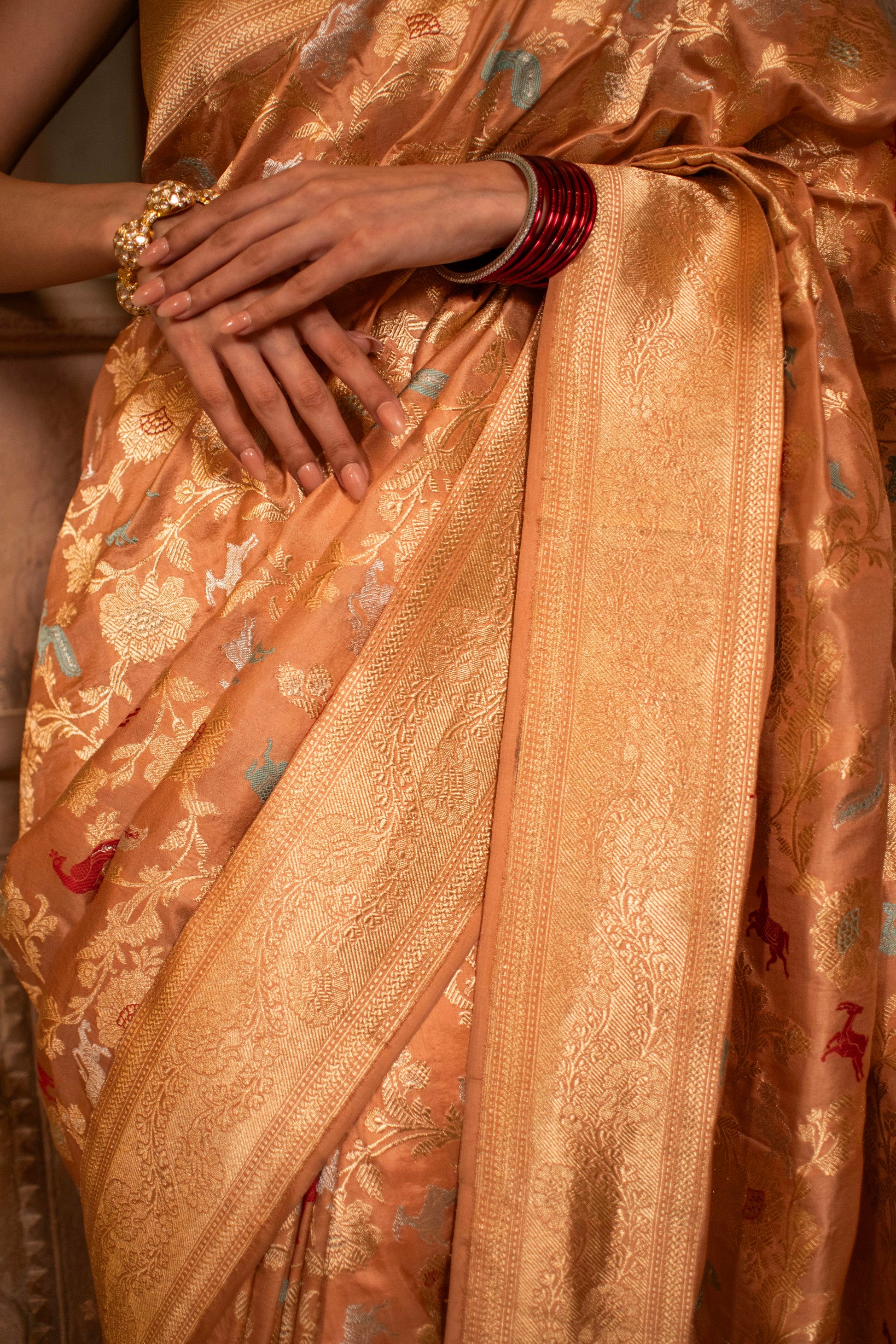 Peach Katan Silk Saree with Exquisite Shikargah Weave