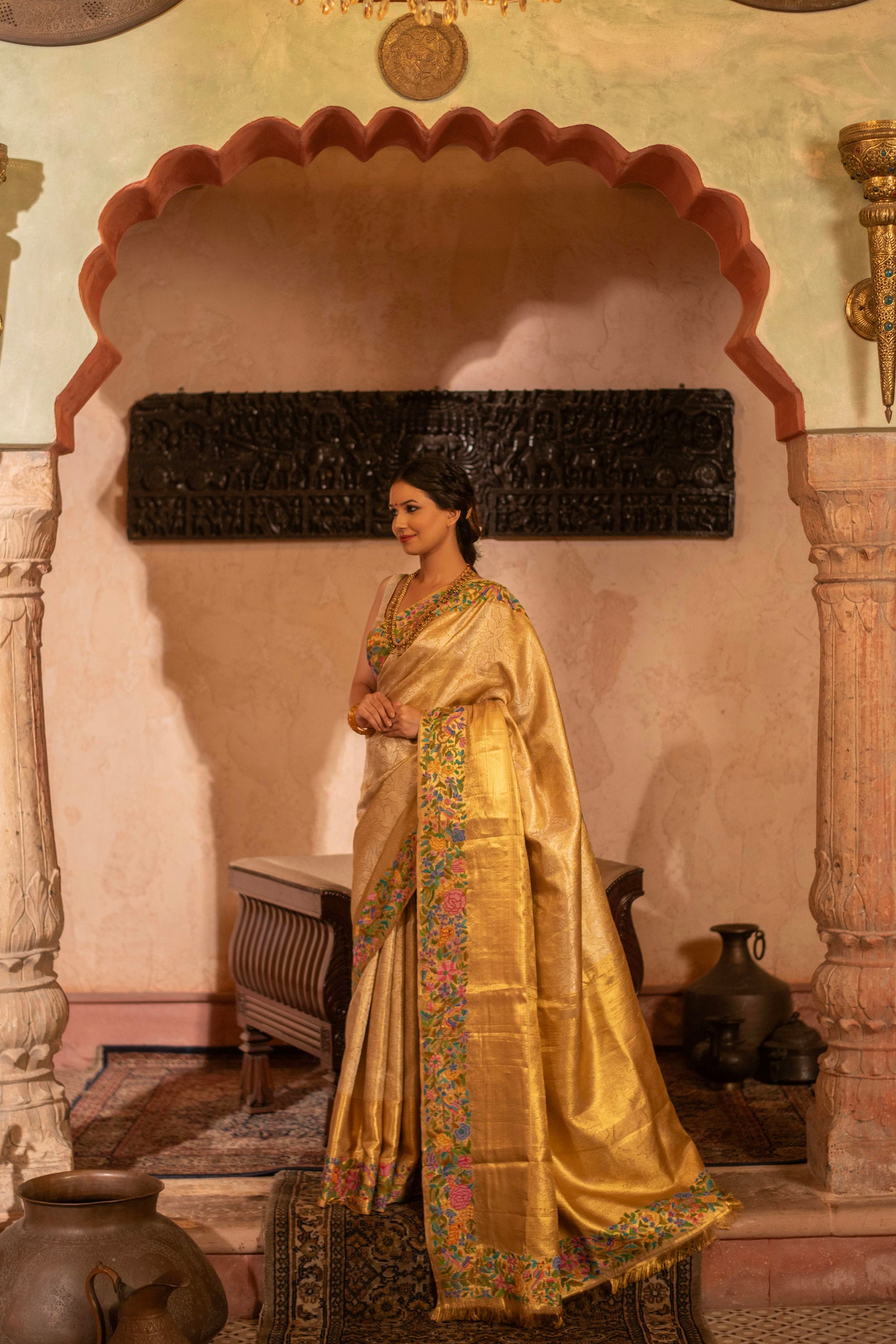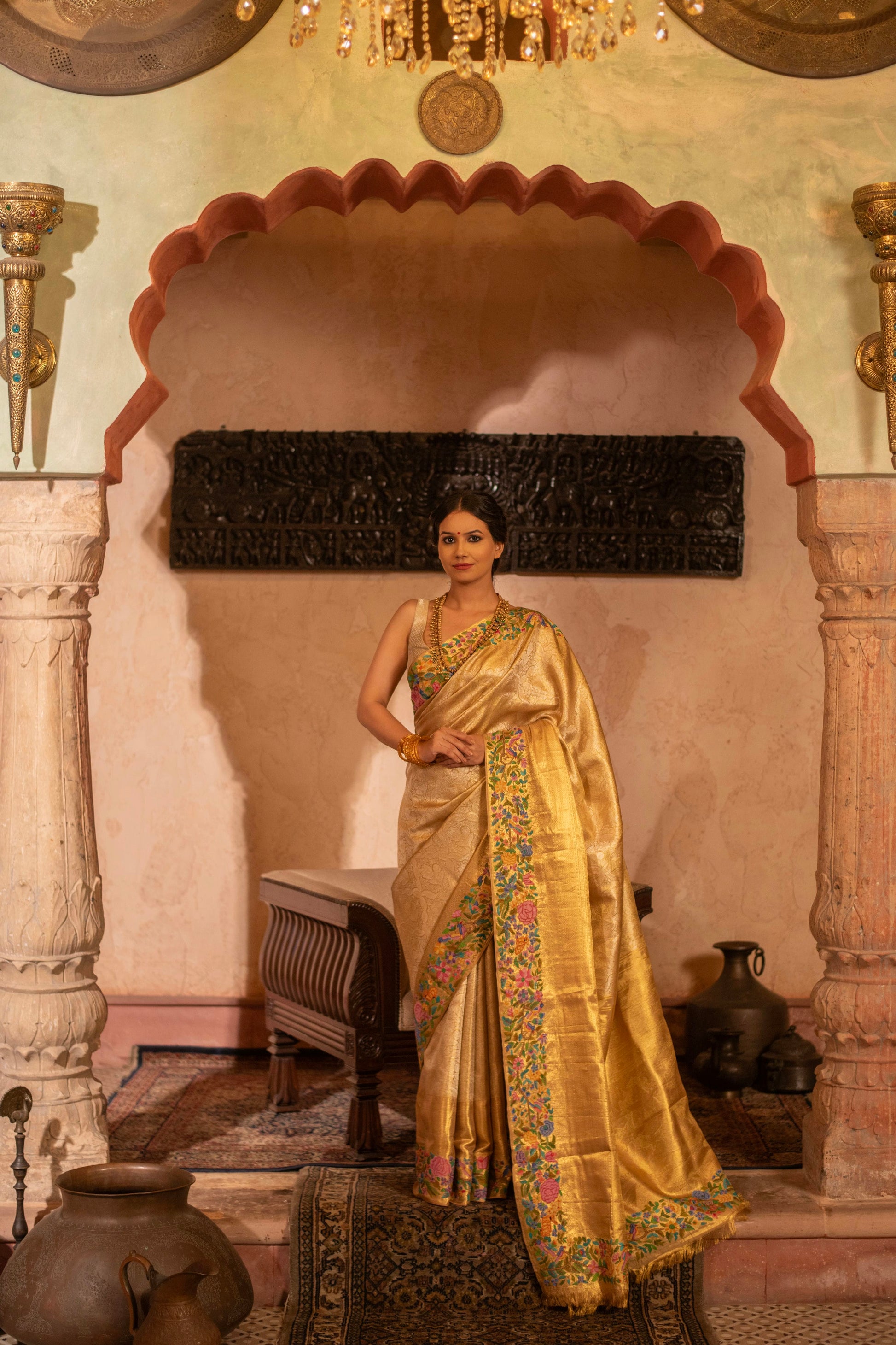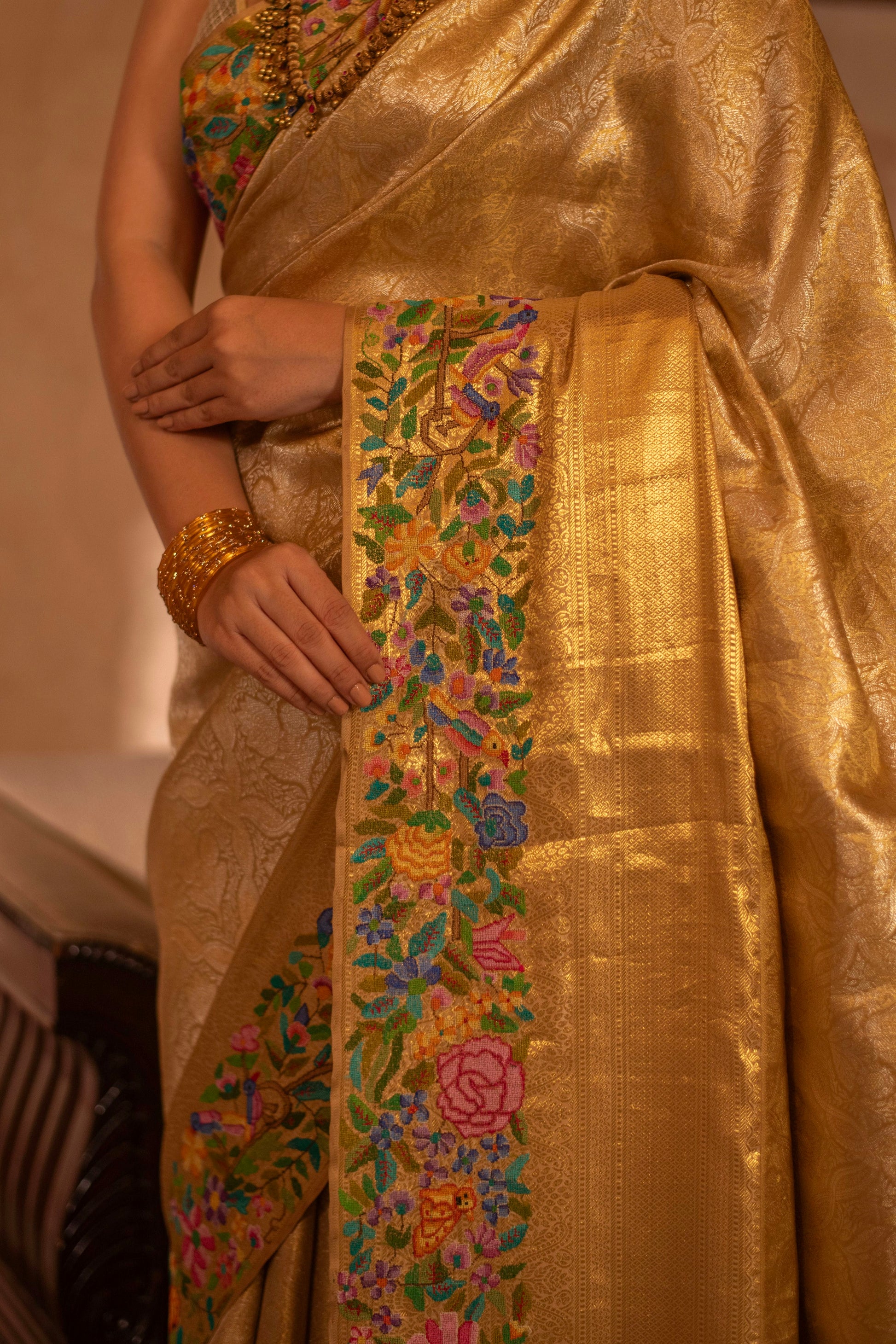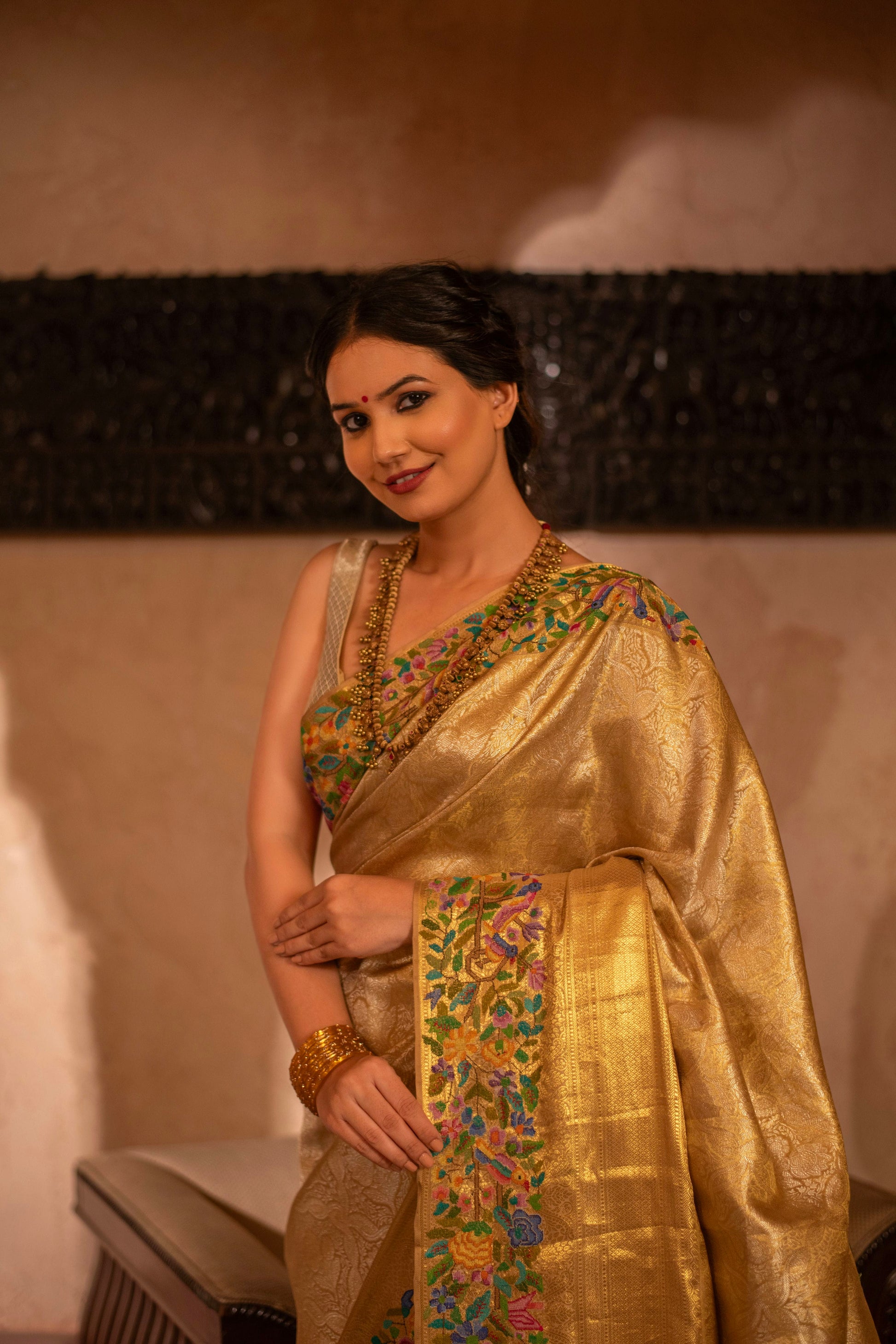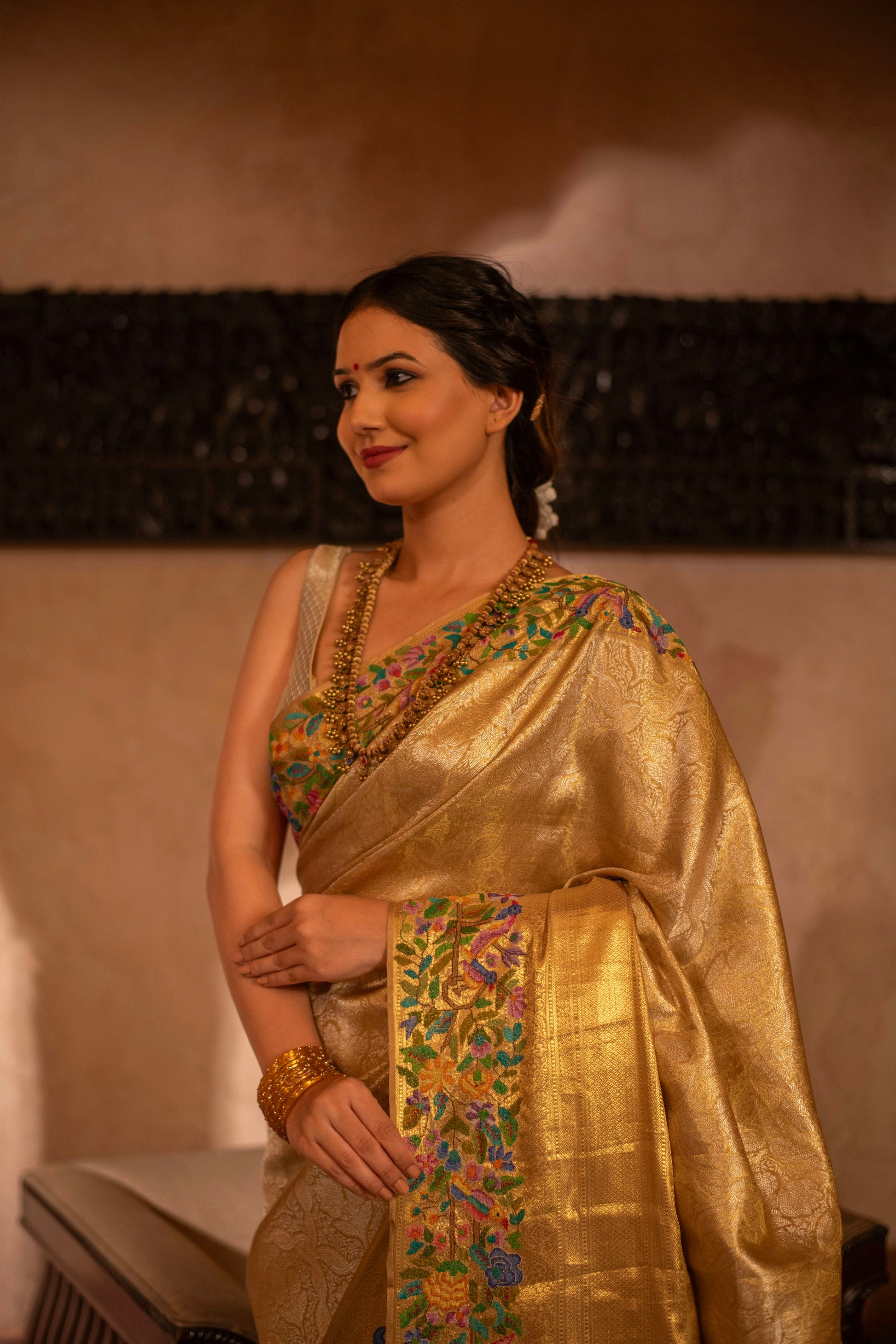Pure Zari Kanjivaram Fusion Saree with Petite Hand Embroidery