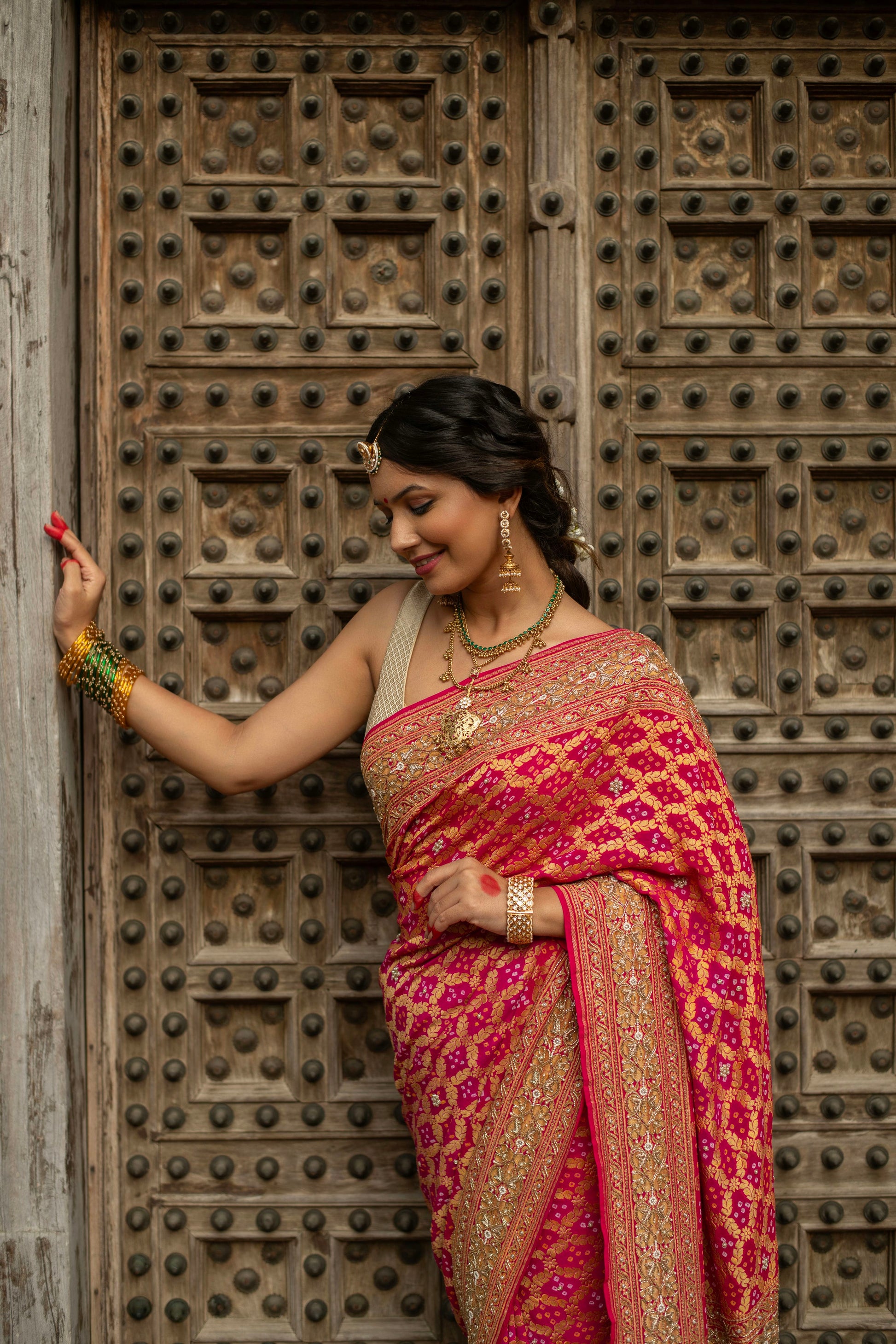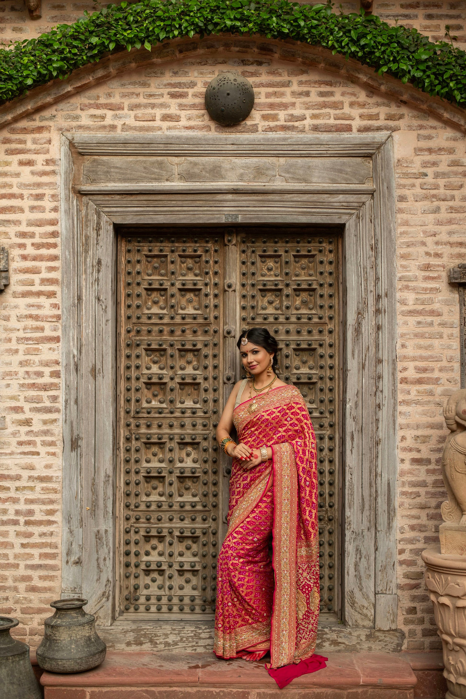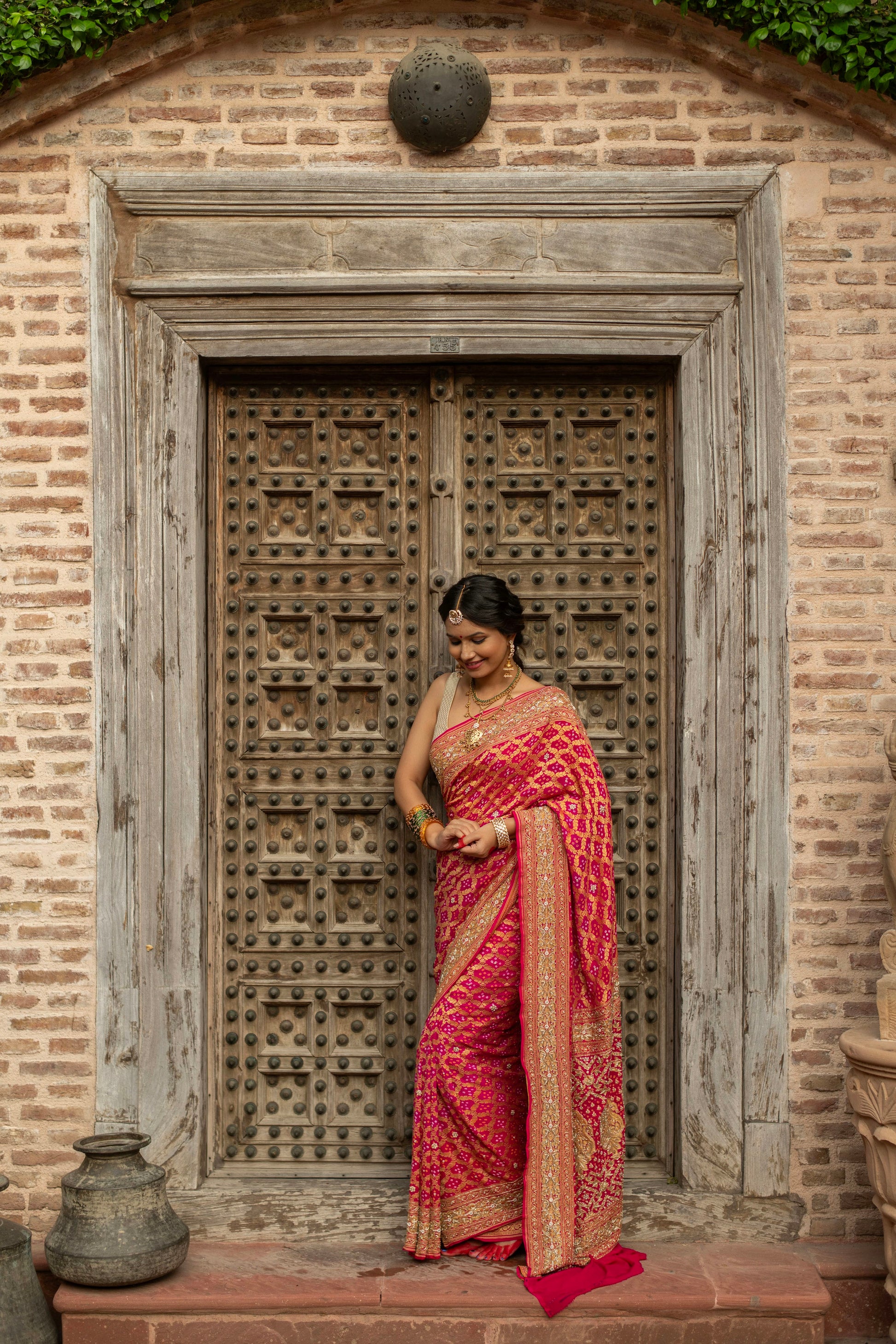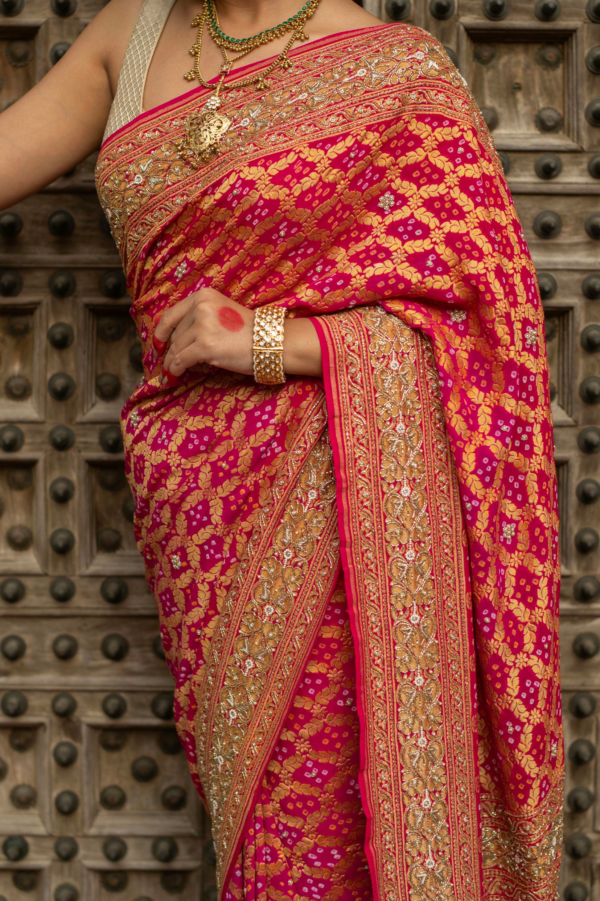 Radiant Banarasi Georgette Bandhani Gharchola Saree with Exquisite Hand Embroidery