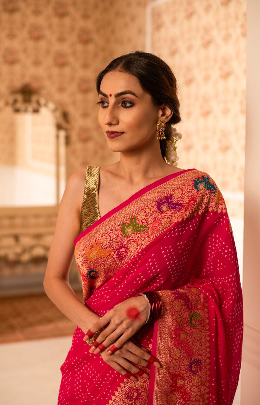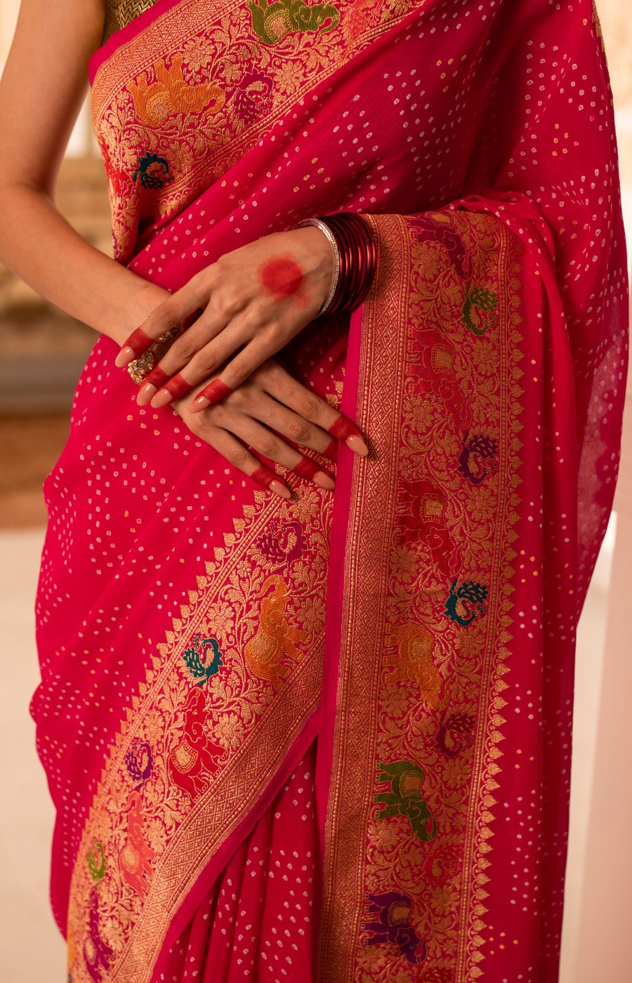 Rai Bandhini Banarasi Georgette Saree with Meenakari Kadwa Shikargha Detailing
