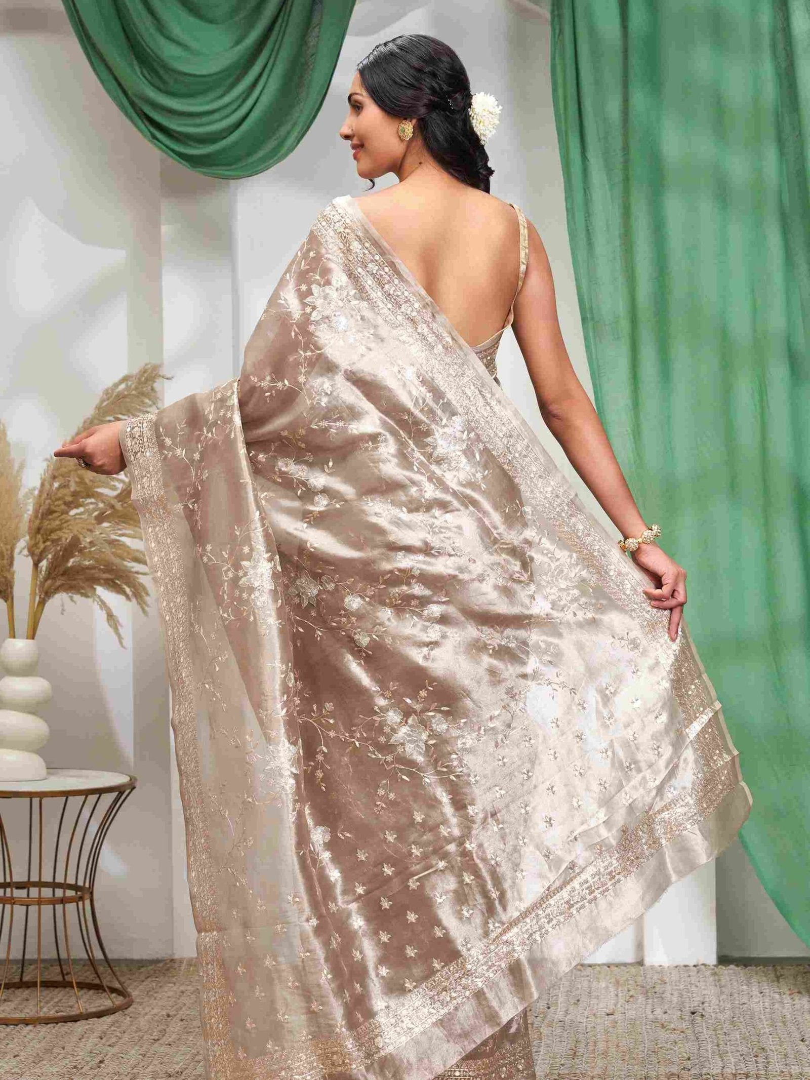 The lustrous tissue fabric provides a lightweight yet regal drape that gracefully flows with your every movement. The entire body is adorned with handcrafted Pitta work—an exquisite metallic embroidery technique that has deep roots in Indian royal attire. This all-over design speaks of intricate workmanship, making this saree a true heirloom piece.