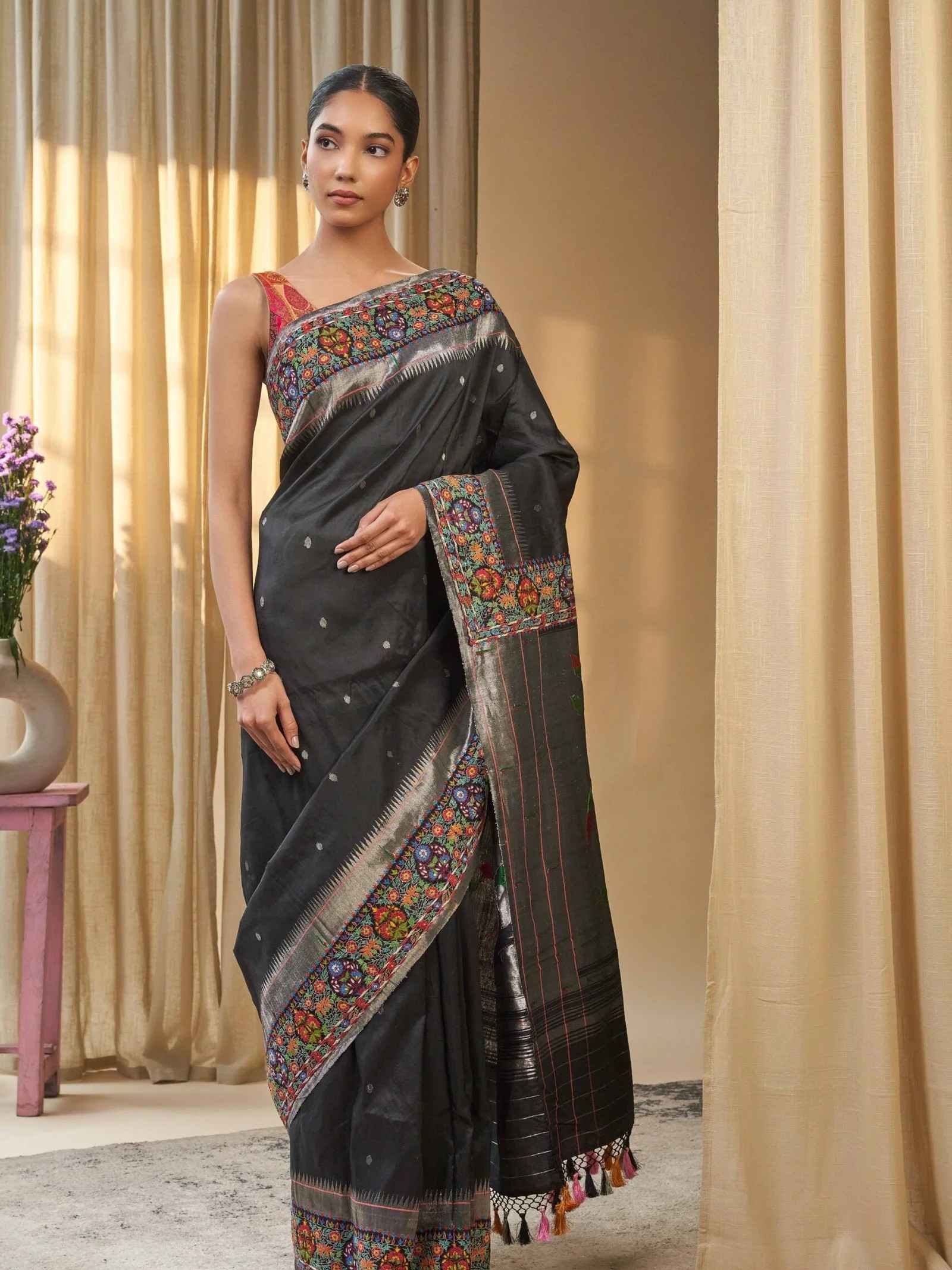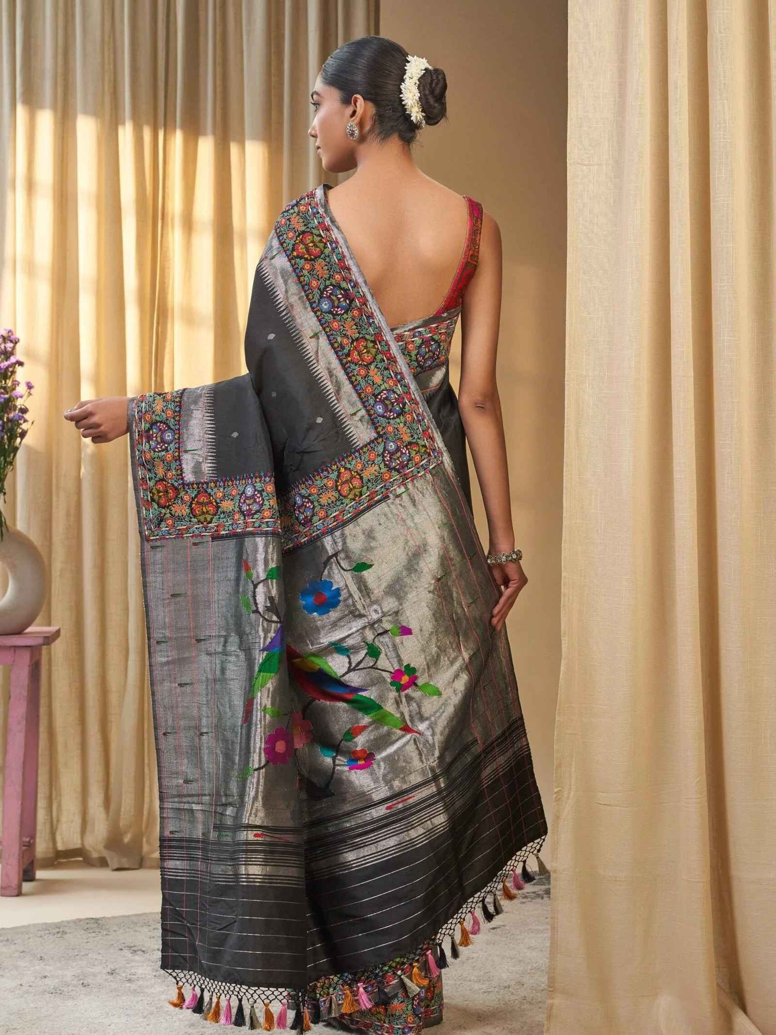 At its heart lies the grandeur of pure silver zari, delicately woven into the timeless motifs of Paithani art. Each glimmering thread on the luxurious black silk canvas speaks of opulence, while the Kashmiri embroidery layered atop it adds an intricate depth—floral, flowing, and profoundly artistic.