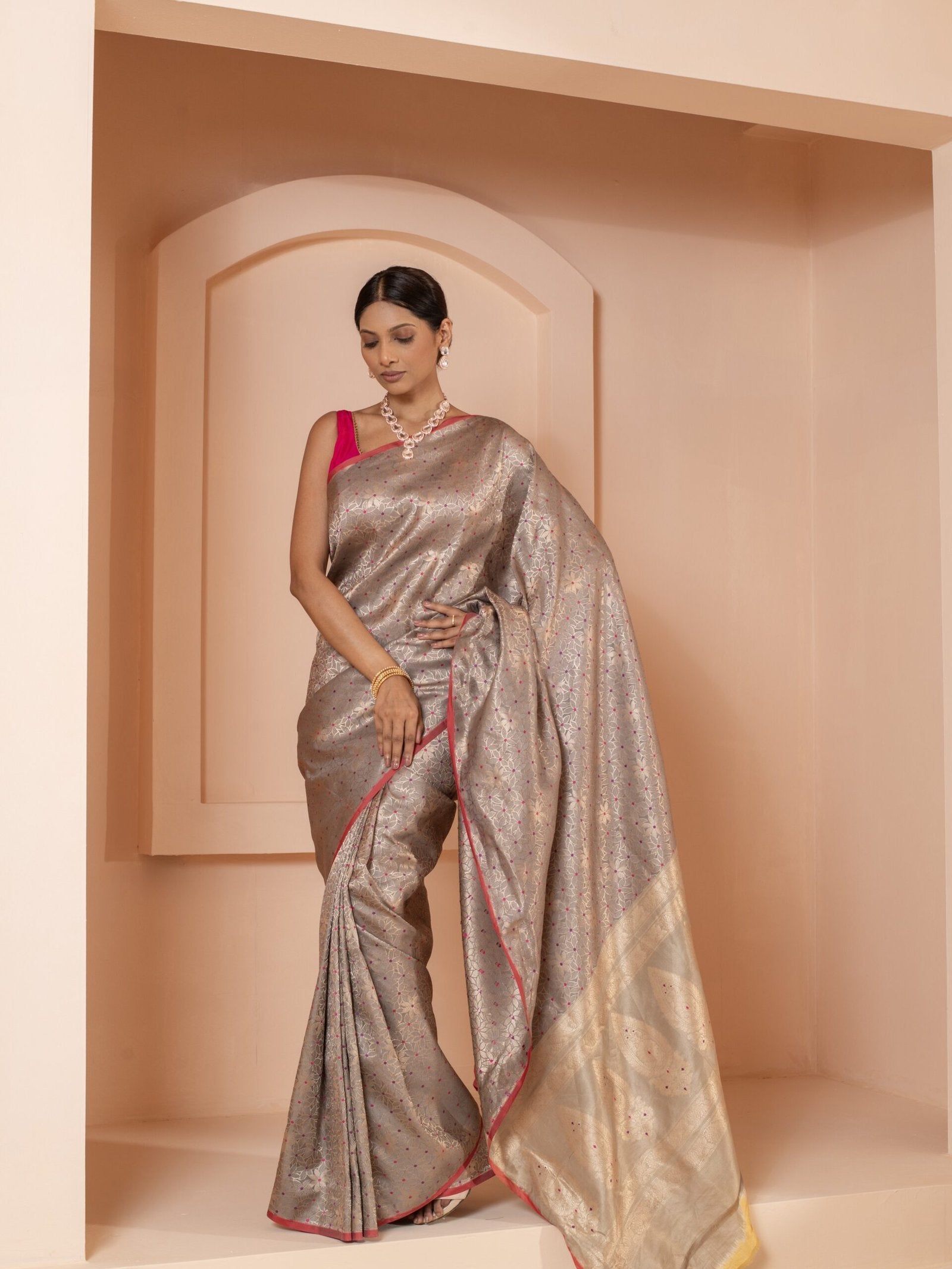 The smooth, lustrous texture of Katan silk enhances the drape, giving it a rich and luxurious fall that glides effortlessly. The intricately woven brocade motifs are delicate yet detailed, offering a quiet grandeur that never overpowers. A soft shimmer glows through its body, reflecting the weaver’s artistry in every thread. Perfect for intimate gatherings, evening soirees, or elegant daytime events, this saree speaks to those who appreciate grace over grandeur.
