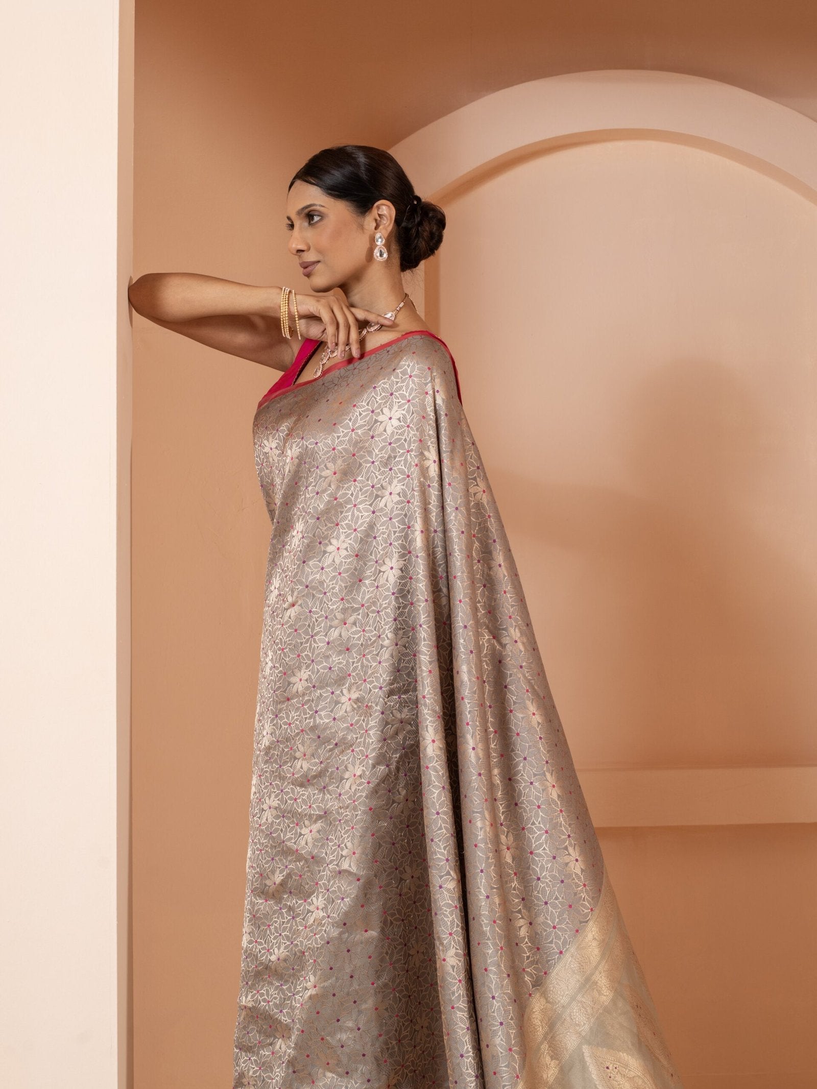 The Shanvika saree is handwoven in Banaras by skilled artisans, using age-old techniques that ensure a high-quality finish. The absence of a border elevates its versatility, letting the intricate brocade patterns take center stage. It’s a saree that doesn’t rely on embellishment but on the depth of its design and the richness of its weave.