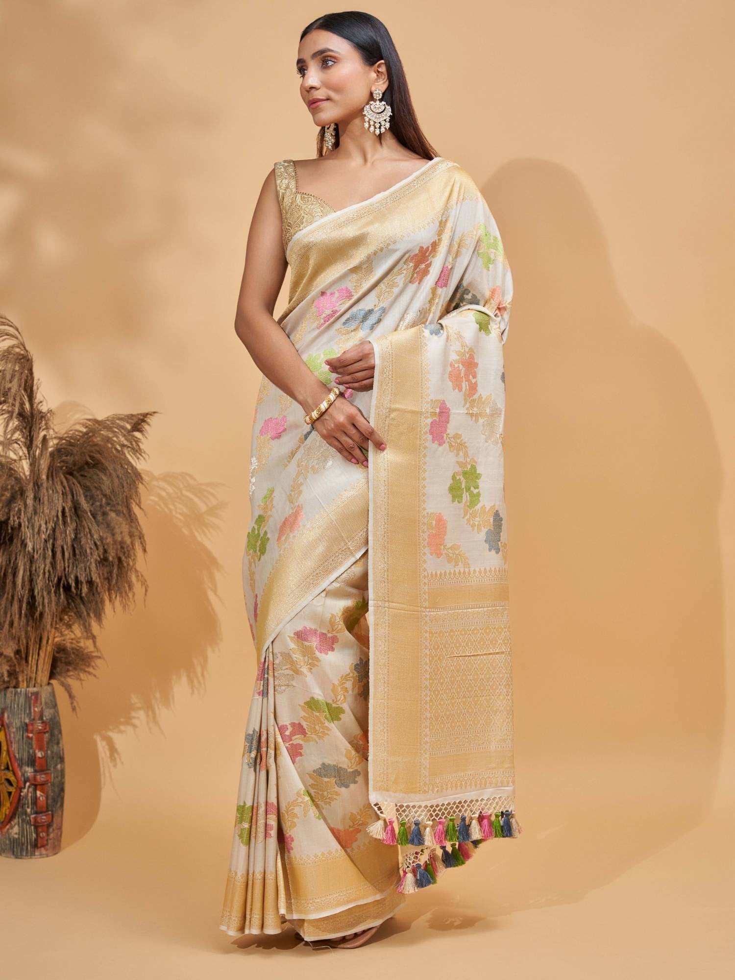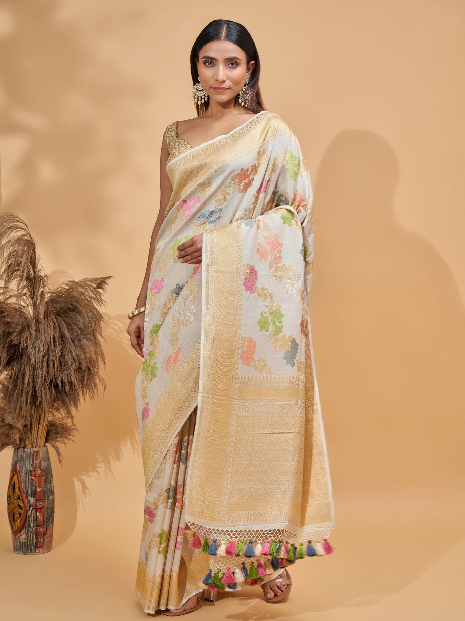 Whether you're attending an intimate gathering, a family celebration, or marking a milestone, this saree stands as a timeless wardrobe treasure. The subtle luster, refined color palette, and intricate motifs make it a collector’s piece that whispers understated luxury.