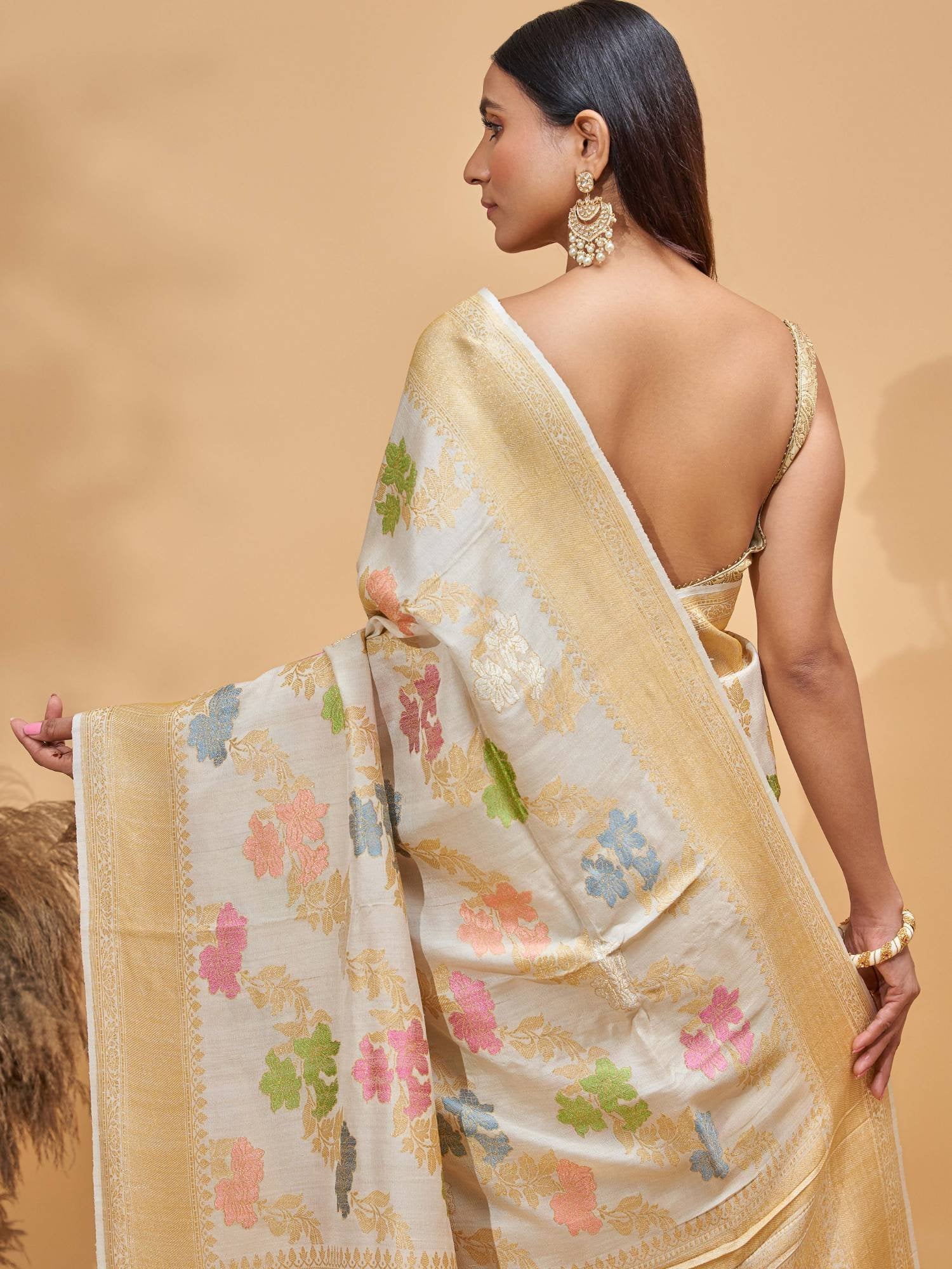 Let Sharanya (Ivory Tussar Georgette Jaal Saree) be your statement of grace, rooted in the glory of Indian handlooms.