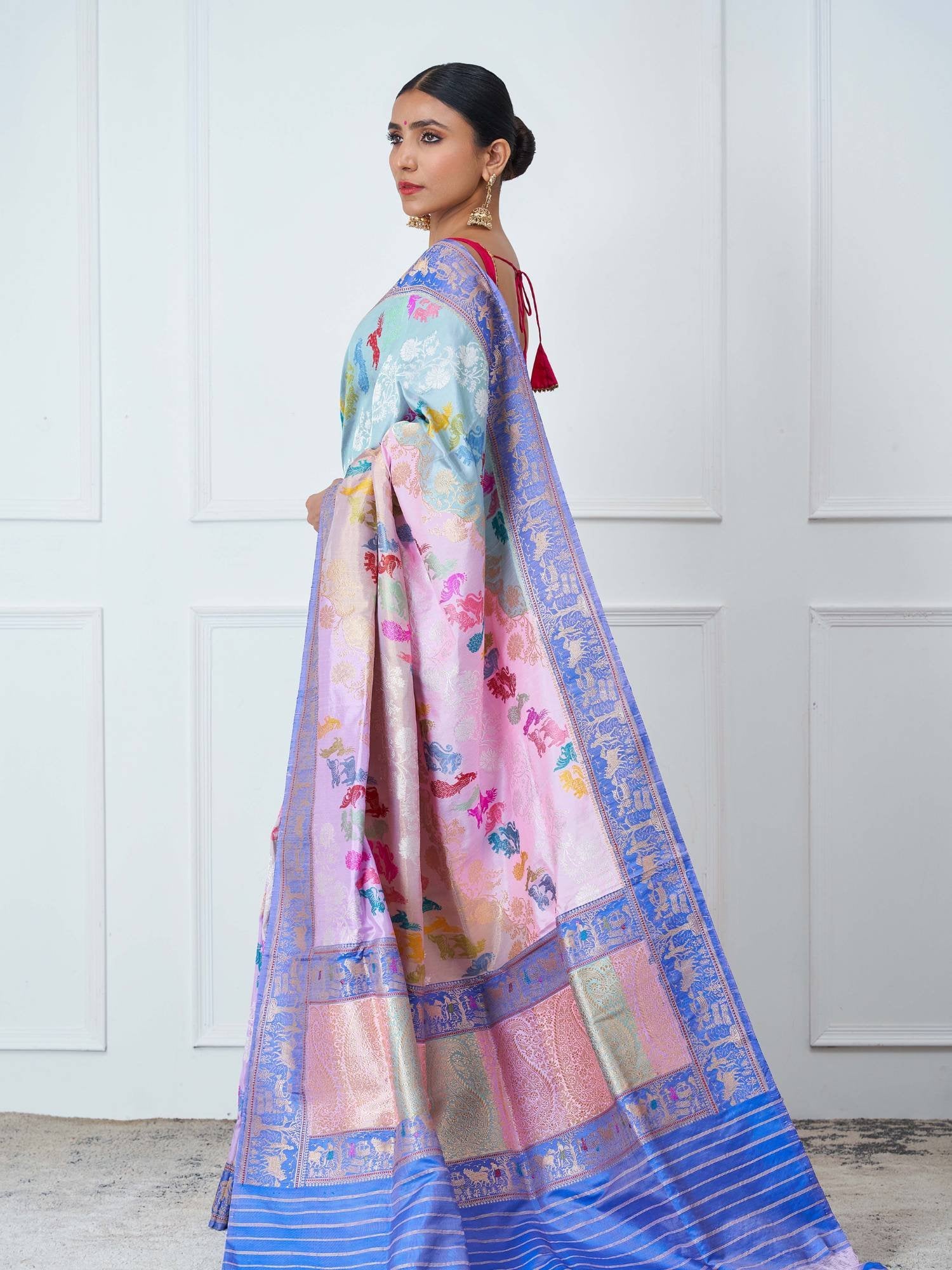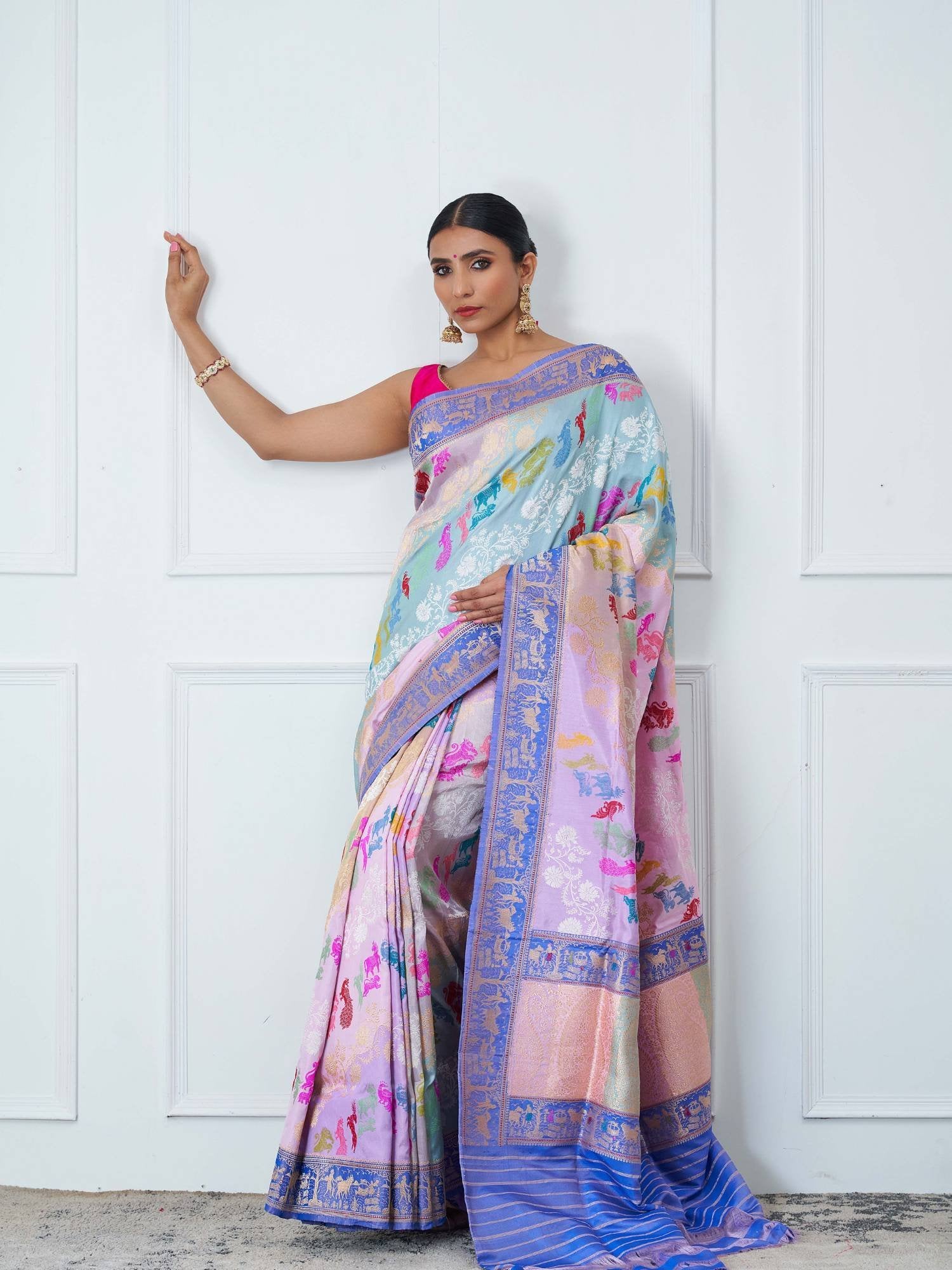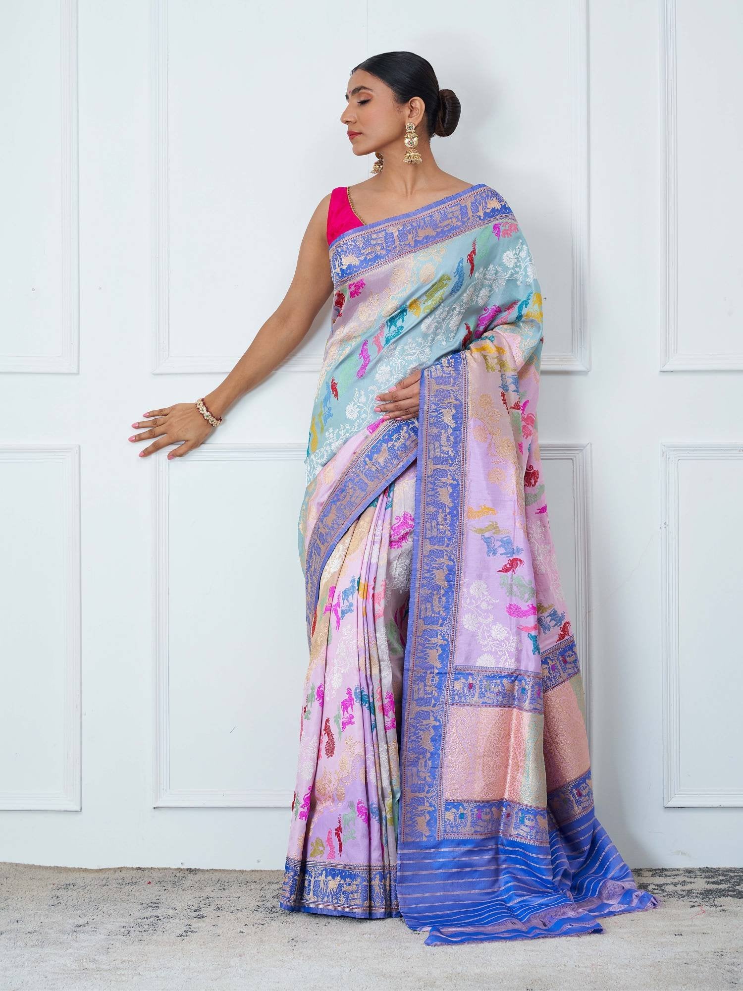 Styling Tip: Pair with a plain silk blouse in silver or pastel tones and heritage jewelry to keep the focus on the saree’s intricate narrative.
