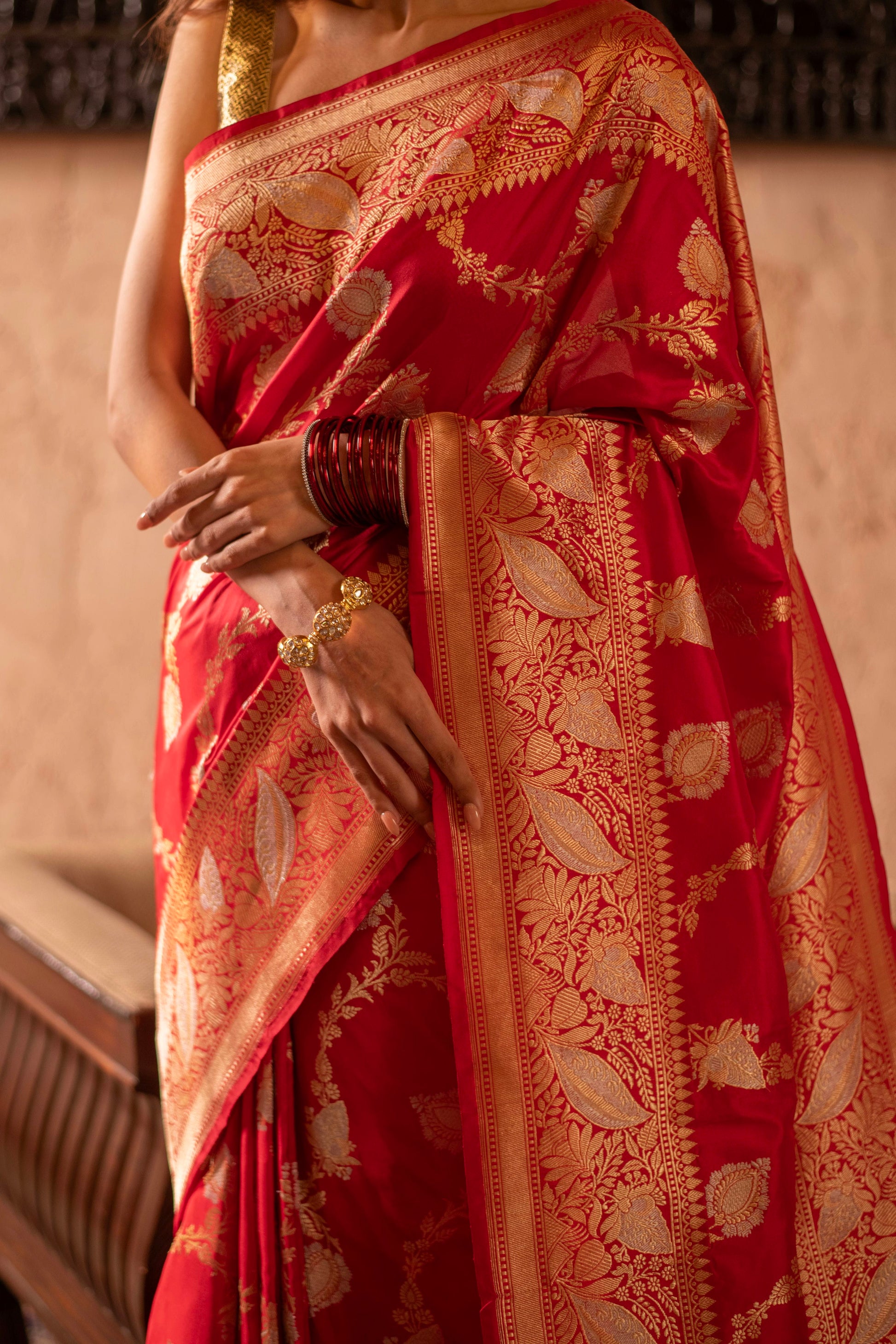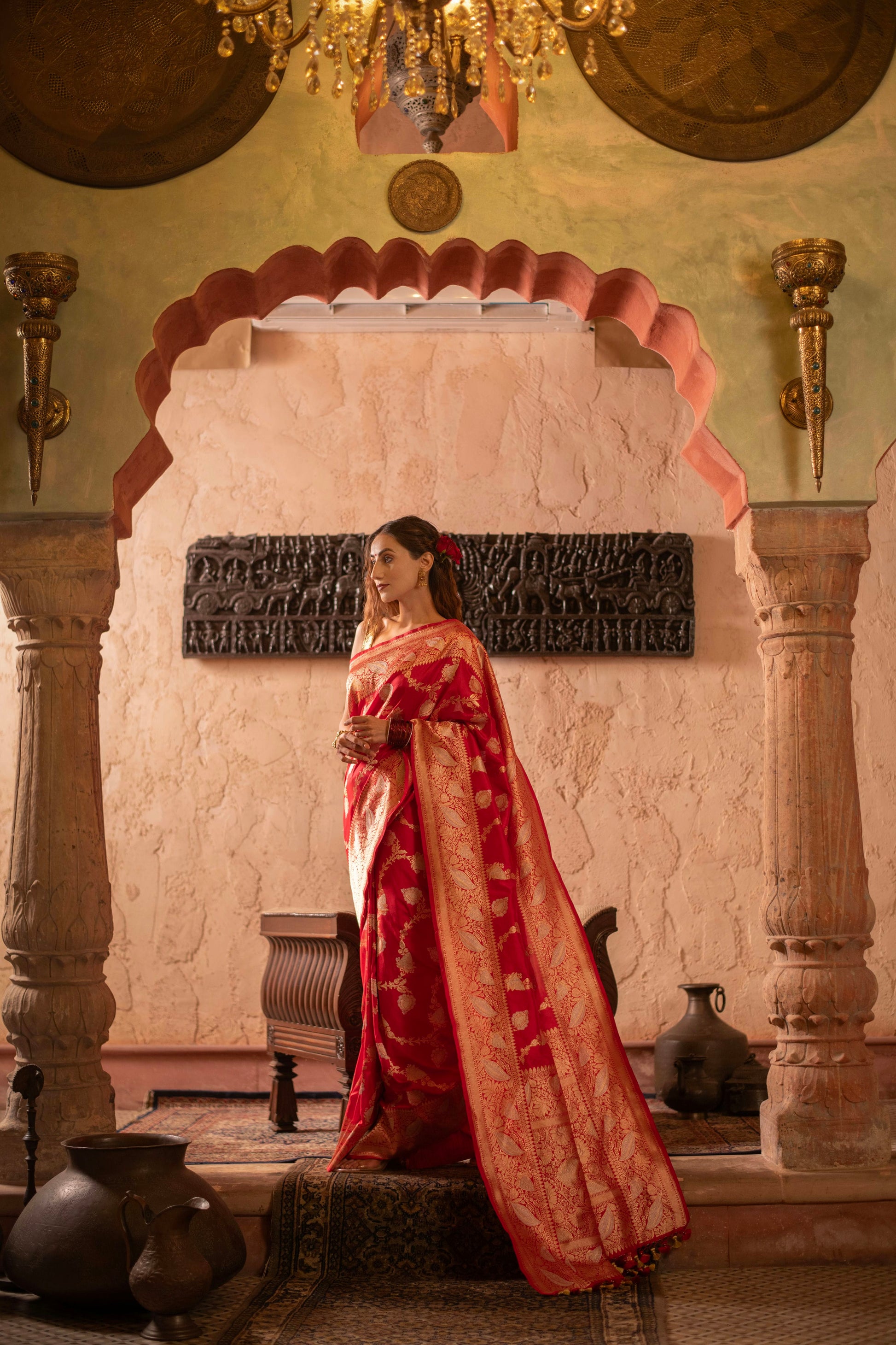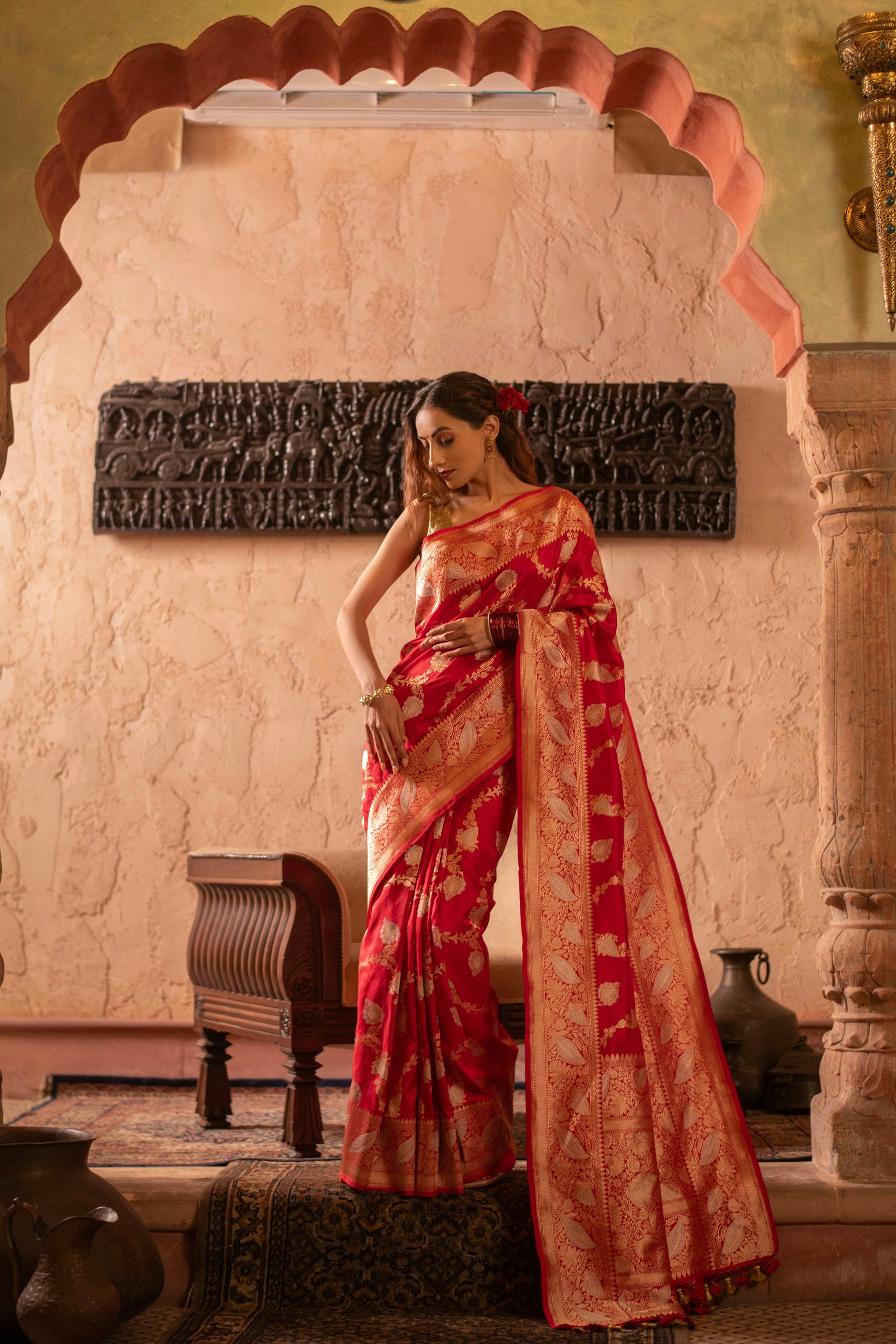 Sindoori Red Kadwa Jangla Saree with Meenakari Jaal